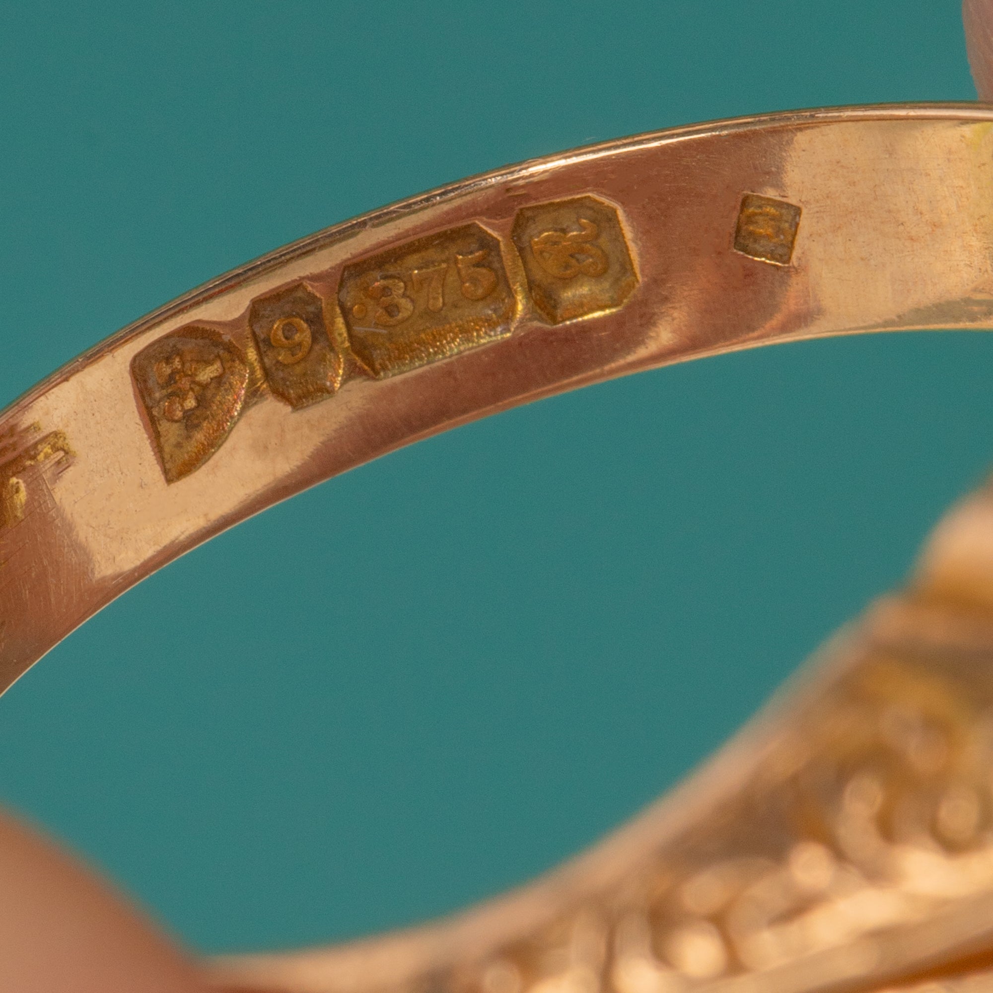 HALLMARKS: Obscured maker’s mark, Chester assay, 9, .375, date letter “R” for 1917.