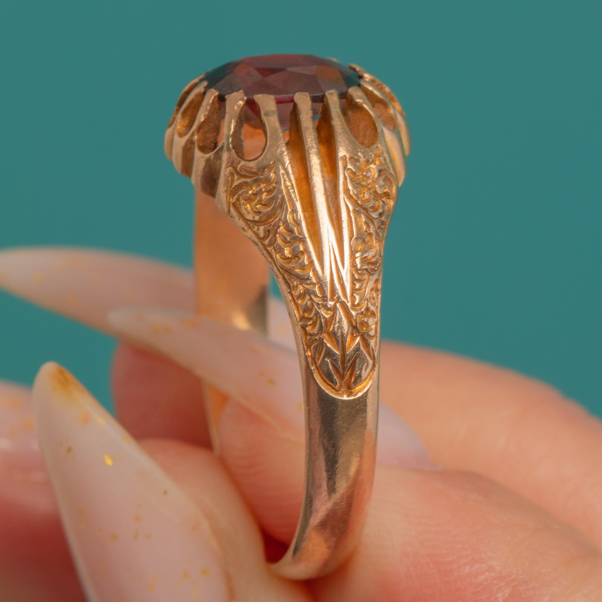 A romantic buttercup ring in warm 9ct Gold, set with a deep wine-red oval Garnet that glows beautifully against its scalloped floral setting. The shoulders are richly adorned with radiating flutes and foliate engraving, flowing into a solid tapering shank for an ornate yet wearable silhouette.