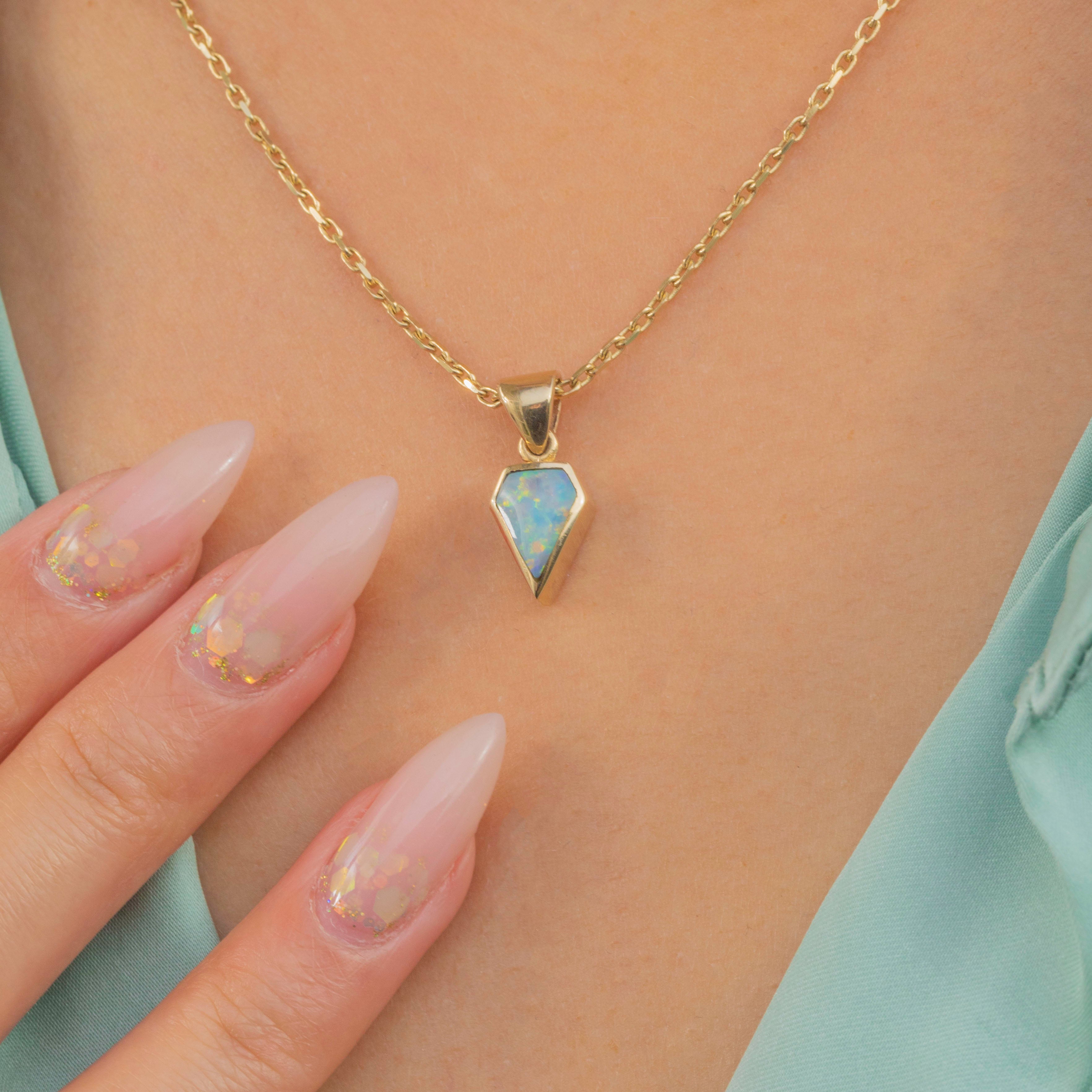 This eye-catching geometric Opal pendant showcases a mesmerising natural, solid Opal with a striking triangular shape! And a chunky bezel of solid 9ct Gold. The pendant is accompanied by an 18" Gold chain, making it ready to wear straight away.