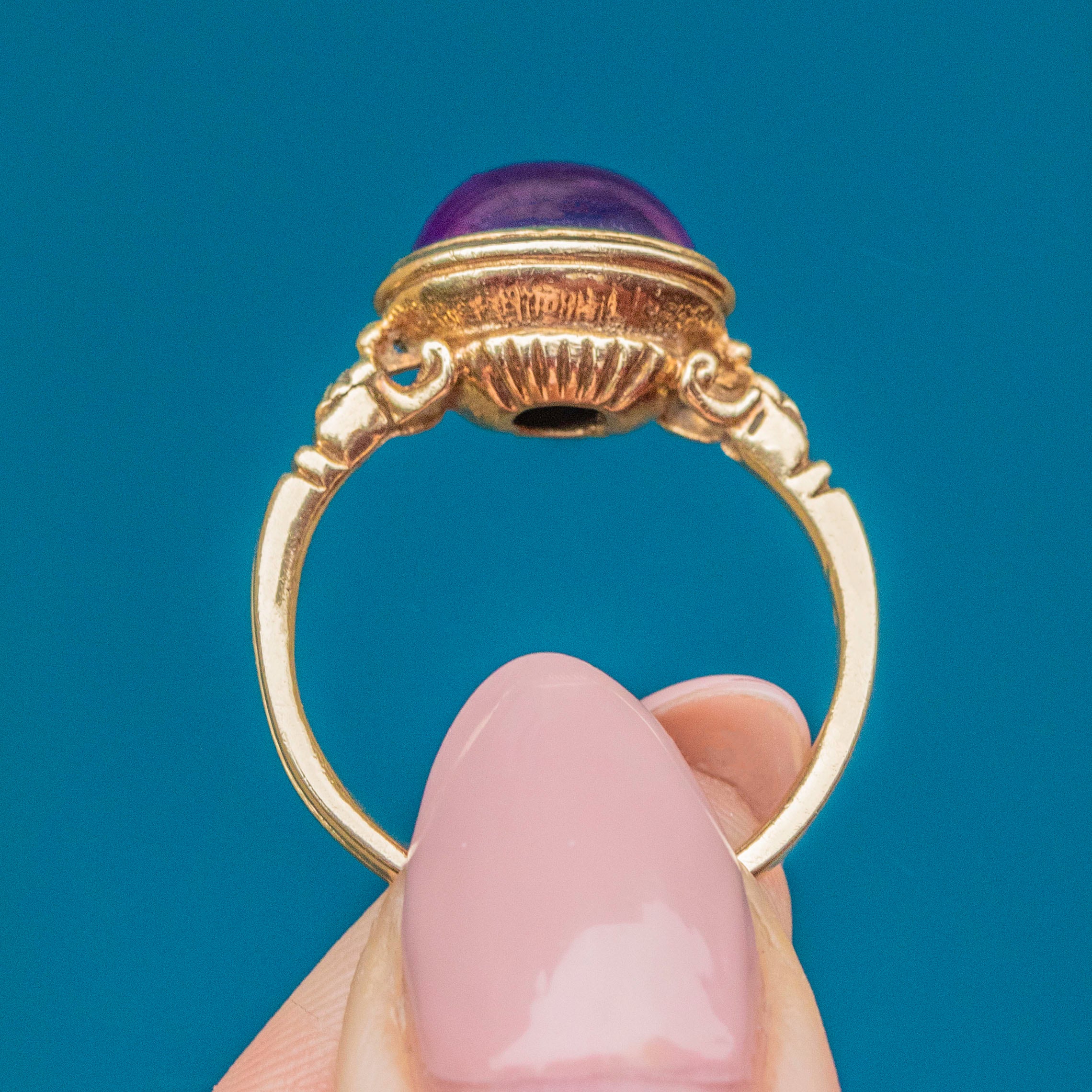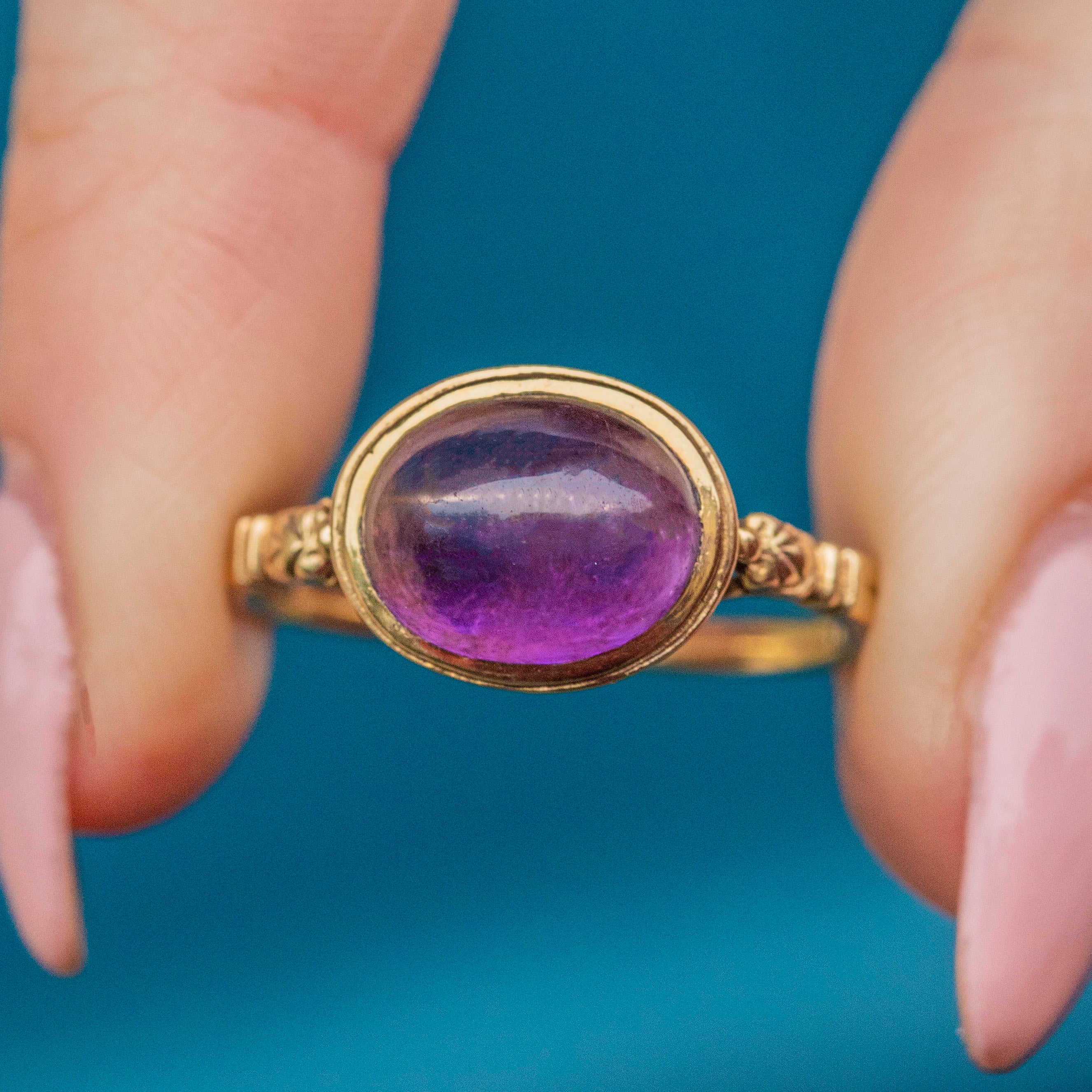 This 9ct Gold Georgian style Amethyst cabochon ring takes heavy inspiration from the 18th century. Flaunting a smoothly cut foiled 2.55ct Amethyst cabochon, this vintage Amethyst ring emits a violet glow with flashes of lilac.