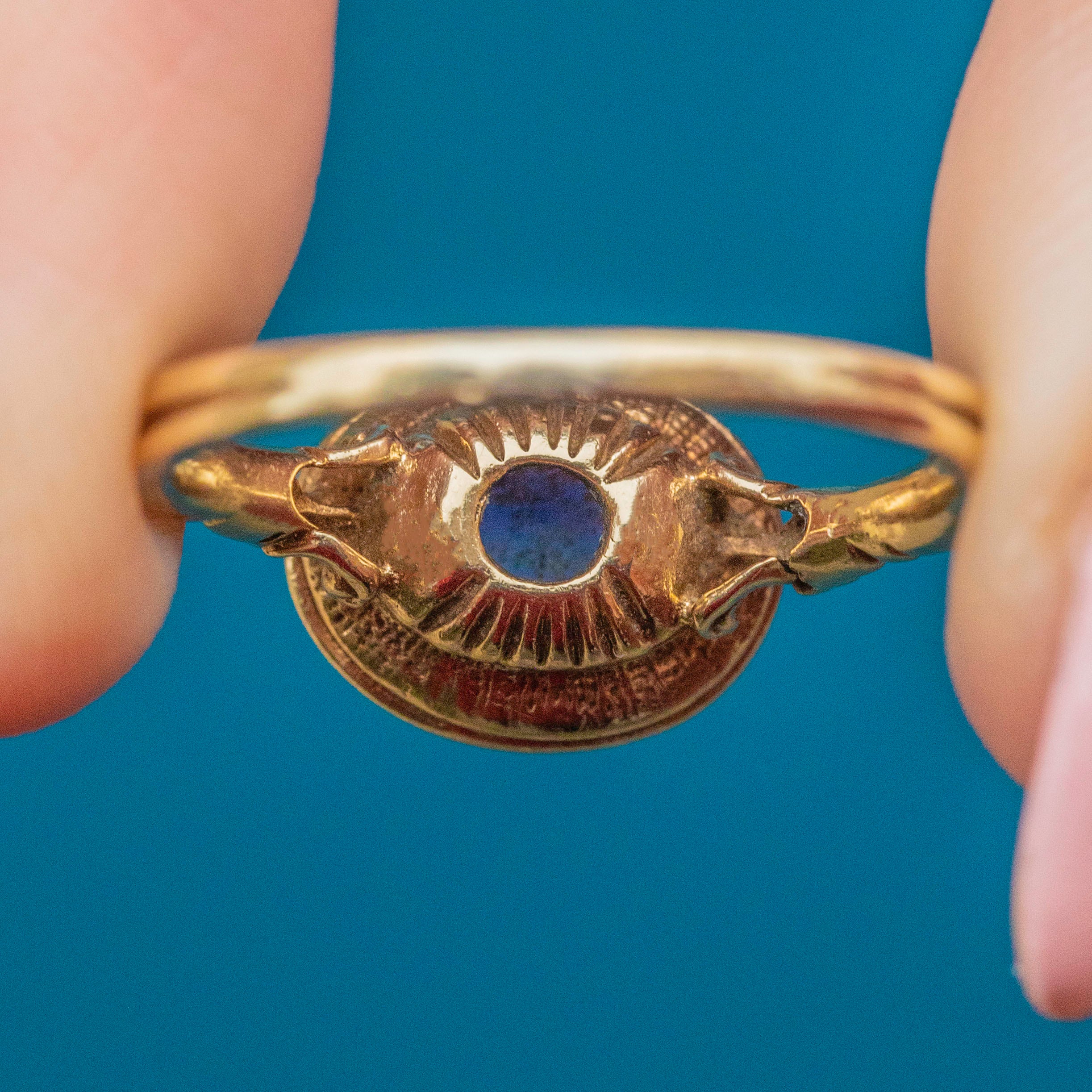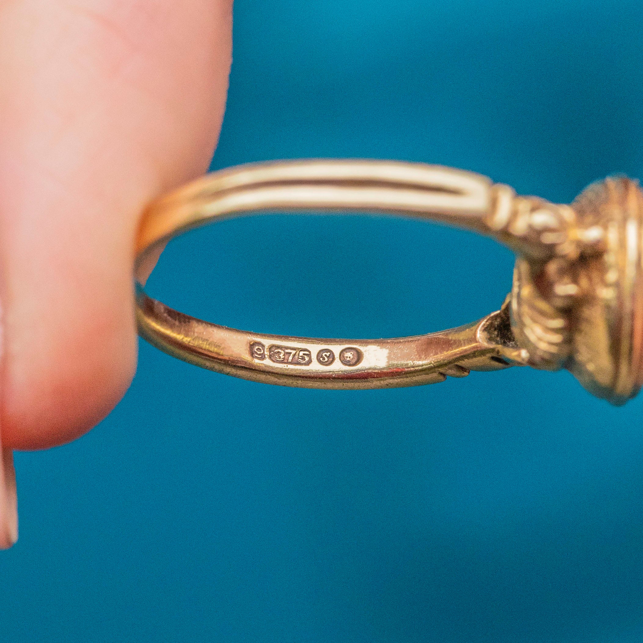 VERY GOOD-EXCELLENT. This 9ct Gold Georgian style Amethyst cabochon ring is in superb condition! The Amethyst sits securely within the bezel setting, with no damage to her smooth surface and the foiling intact. Due to the foiled back, it is important to avoid humid or wet conditions while wearing this Vintage ring. There is a small pinprick hole on the side of the shank, but this cannot be seen when worn. The Gold details throughout are crisp and the ring band has retained a well rounded form, allowing you to wear it comfortably. With a full set of hallmarks, we can accurately date this Georgian inspired ring to 1973.
