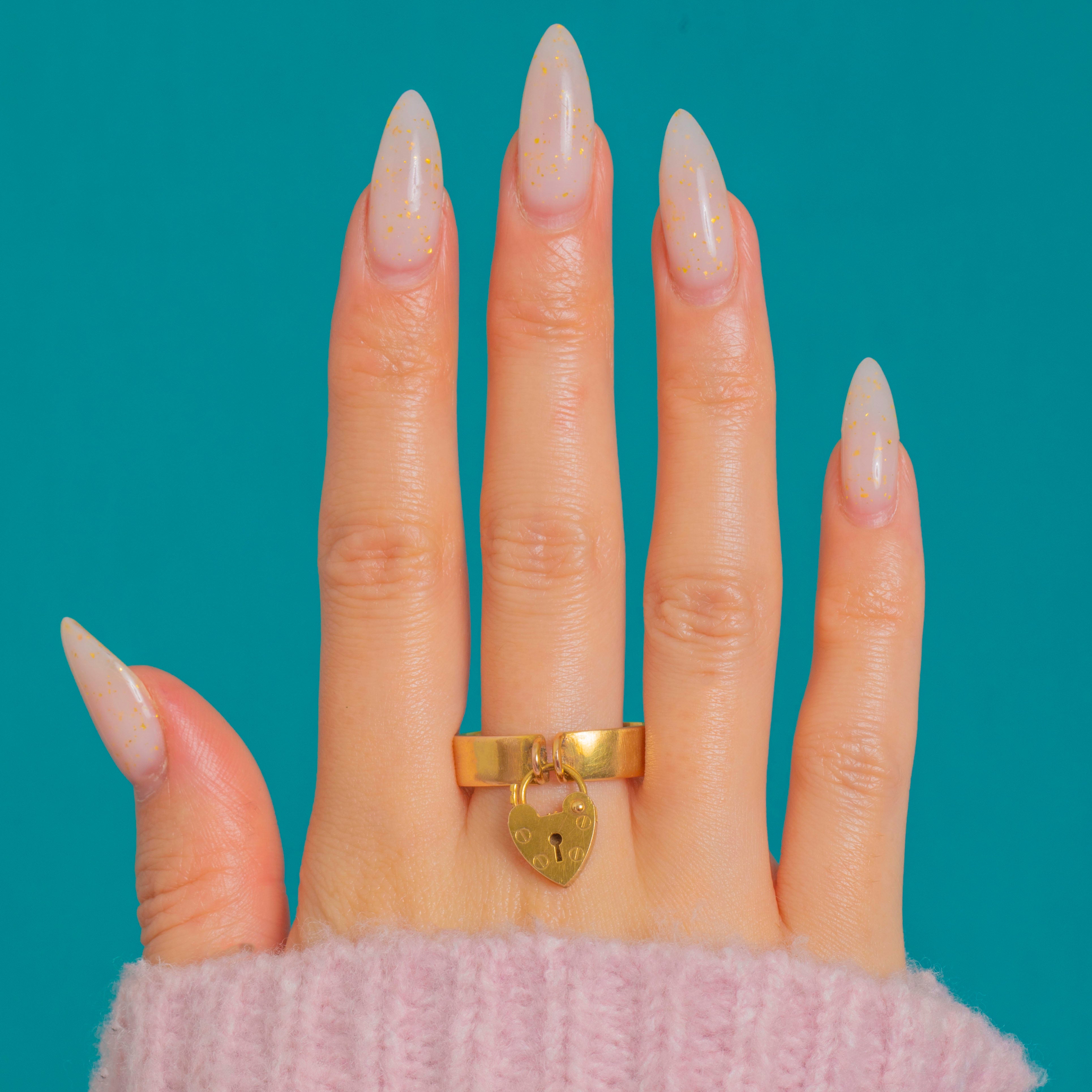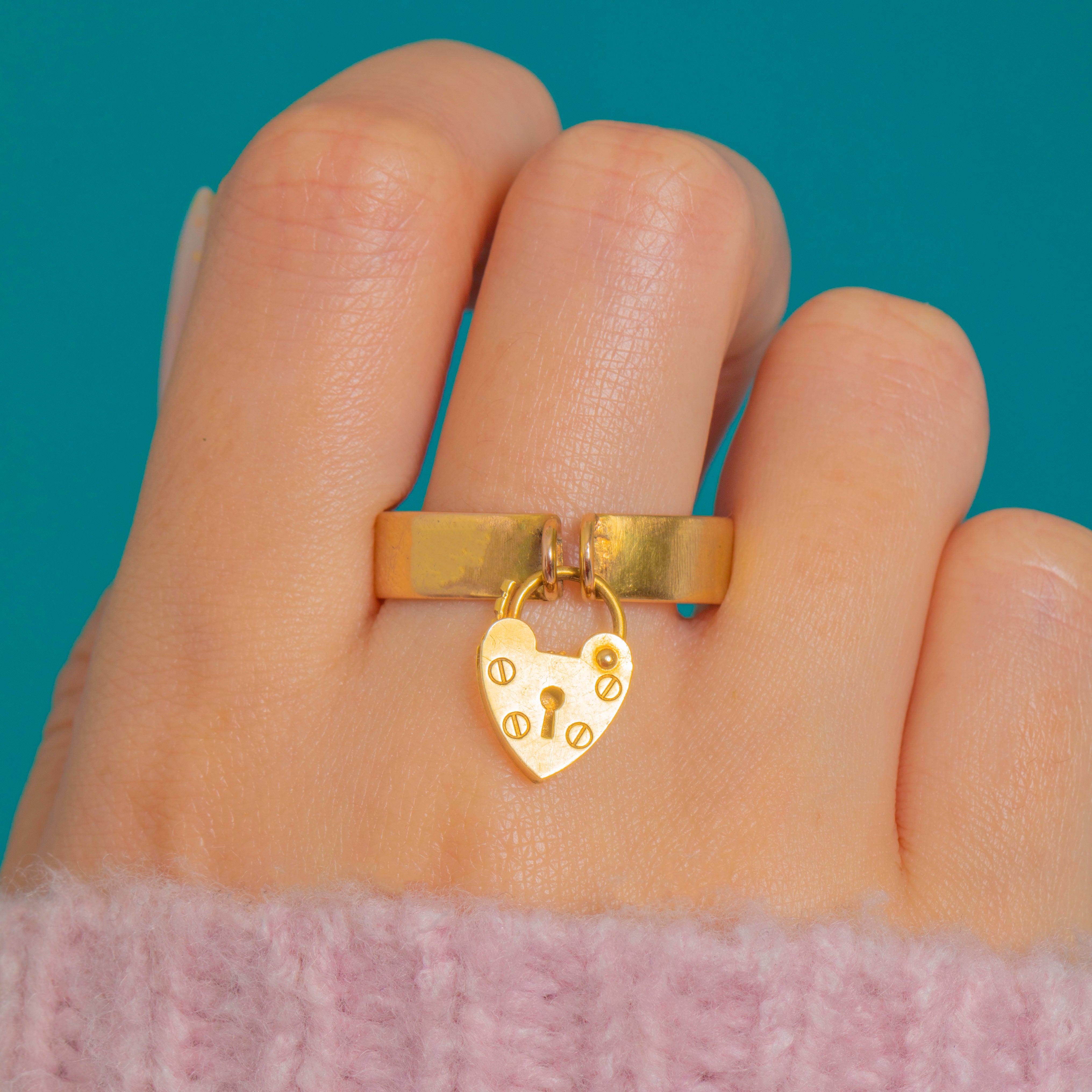 Sweet, symbolic and wonderfully wearable, this 9ct Gold heart padlock ring captures the language of love in a sleek, everyday silhouette. The polished flat band is adorned with a dainty articulated heart, detailed with a tiny keyhole and neat rivet motifs for that authentic love‑token charm.