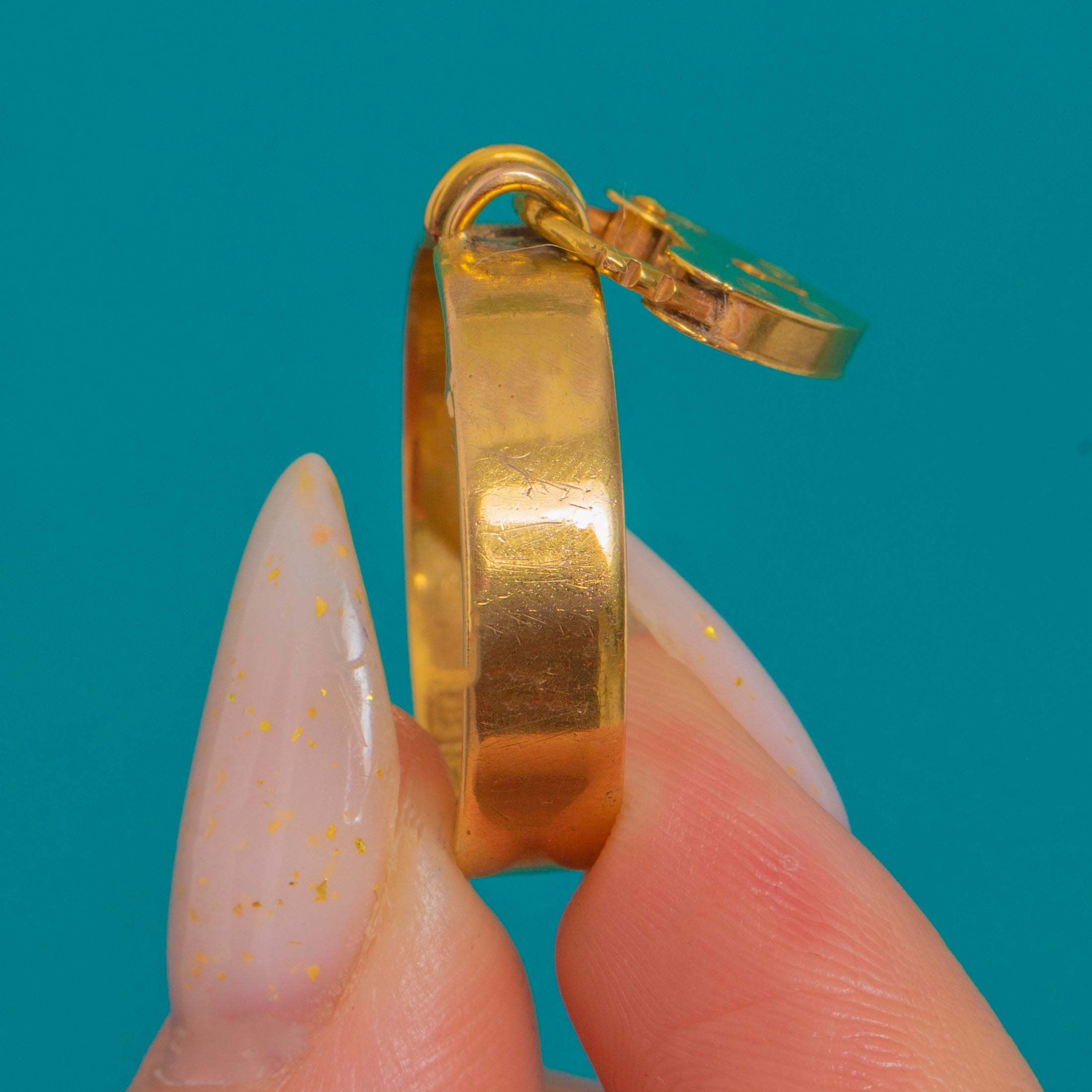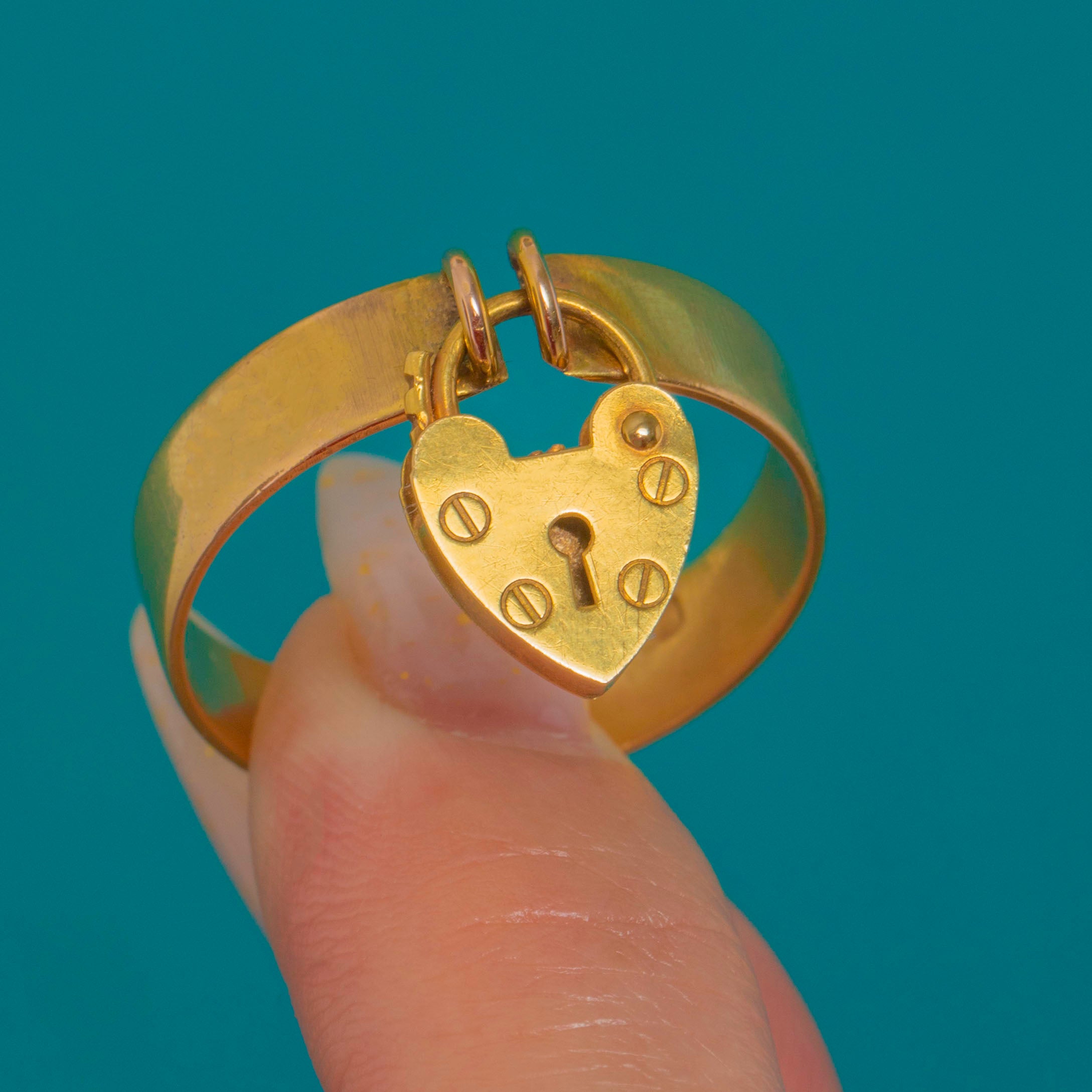 VERY GOOD: The Gold shows light surface scratches and a gentle patina consistent with age, with some wear to the band. The heart charm and joins display minor marks and tiny superficial dings under close inspection. Overall well cared for, with honest wear that enhances its character.