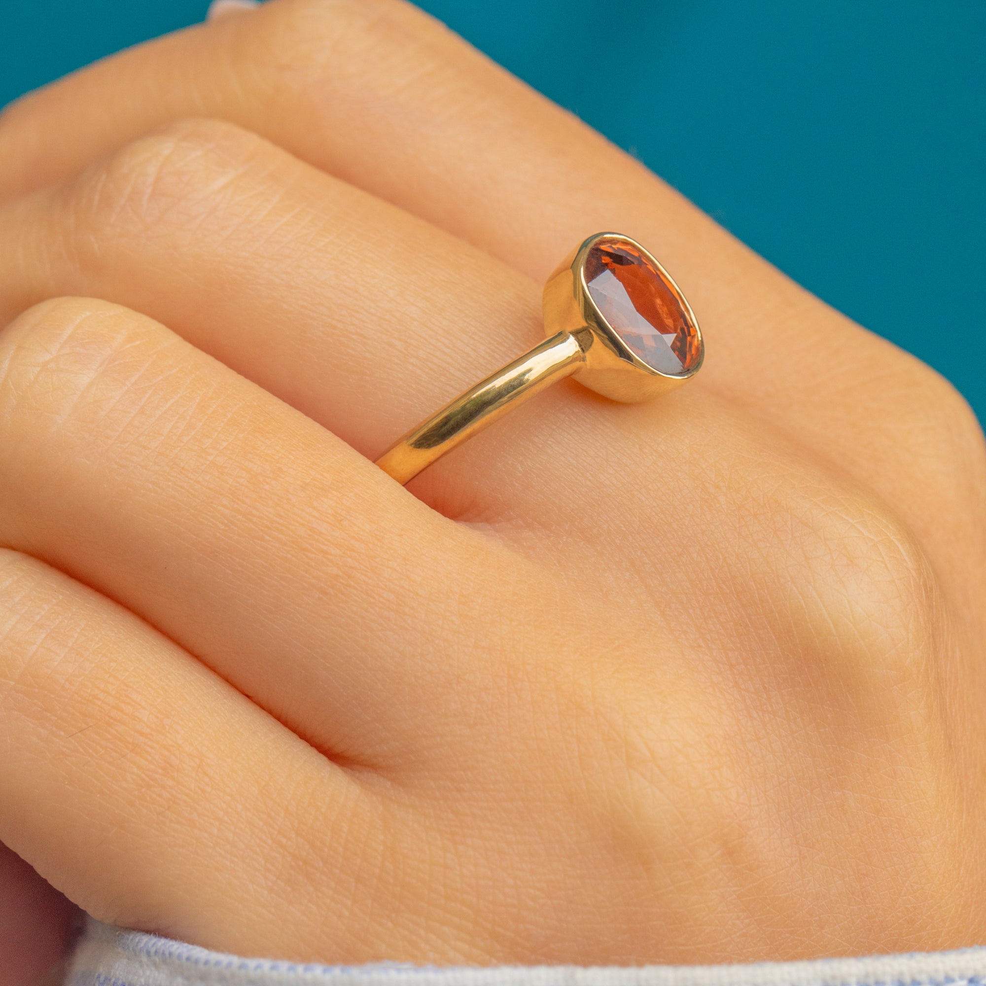 A striking Mid-Century Vintage ring set with a vibrant natural Imperial Topaz. The Topaz displays a rich golden-orange hue, perfectly complemented by a simple 9ct Gold bezel setting that allows the stone’s natural beauty to shine.