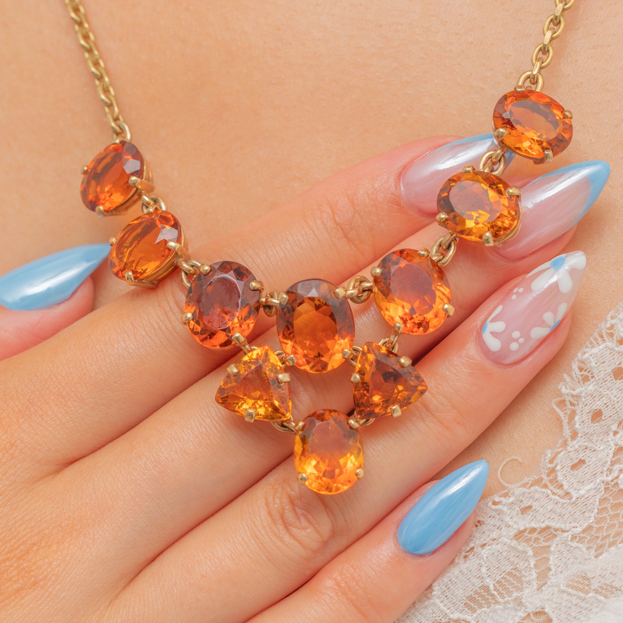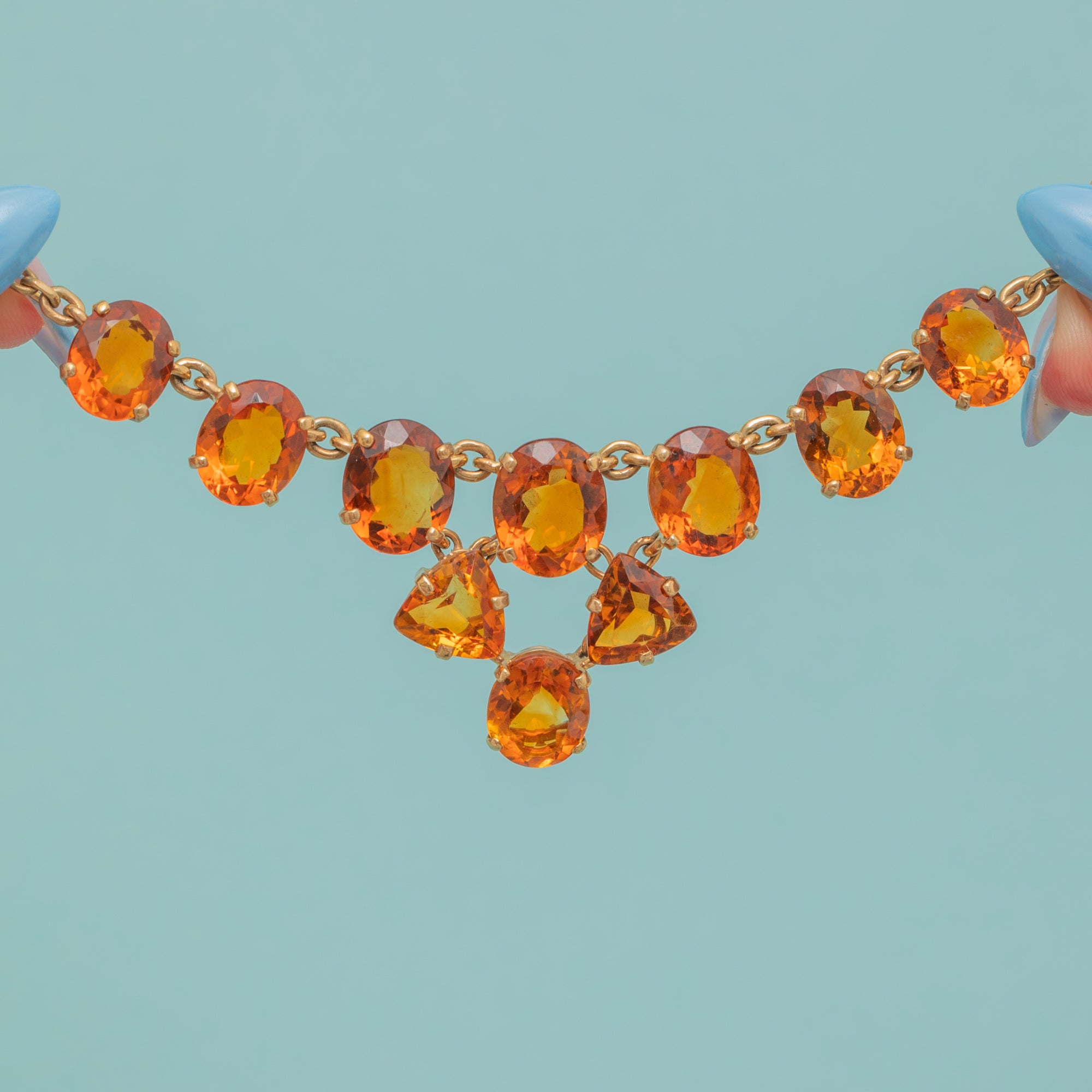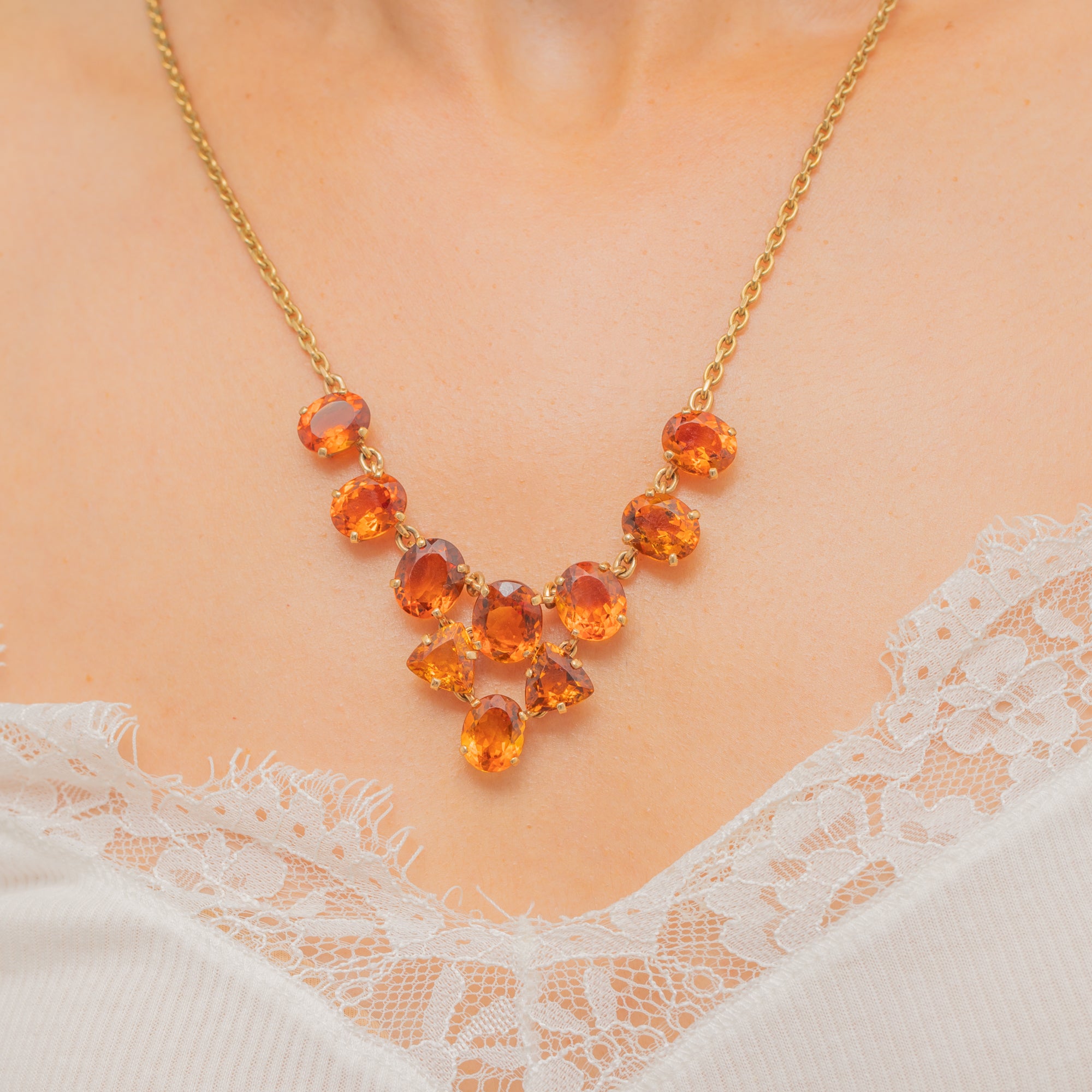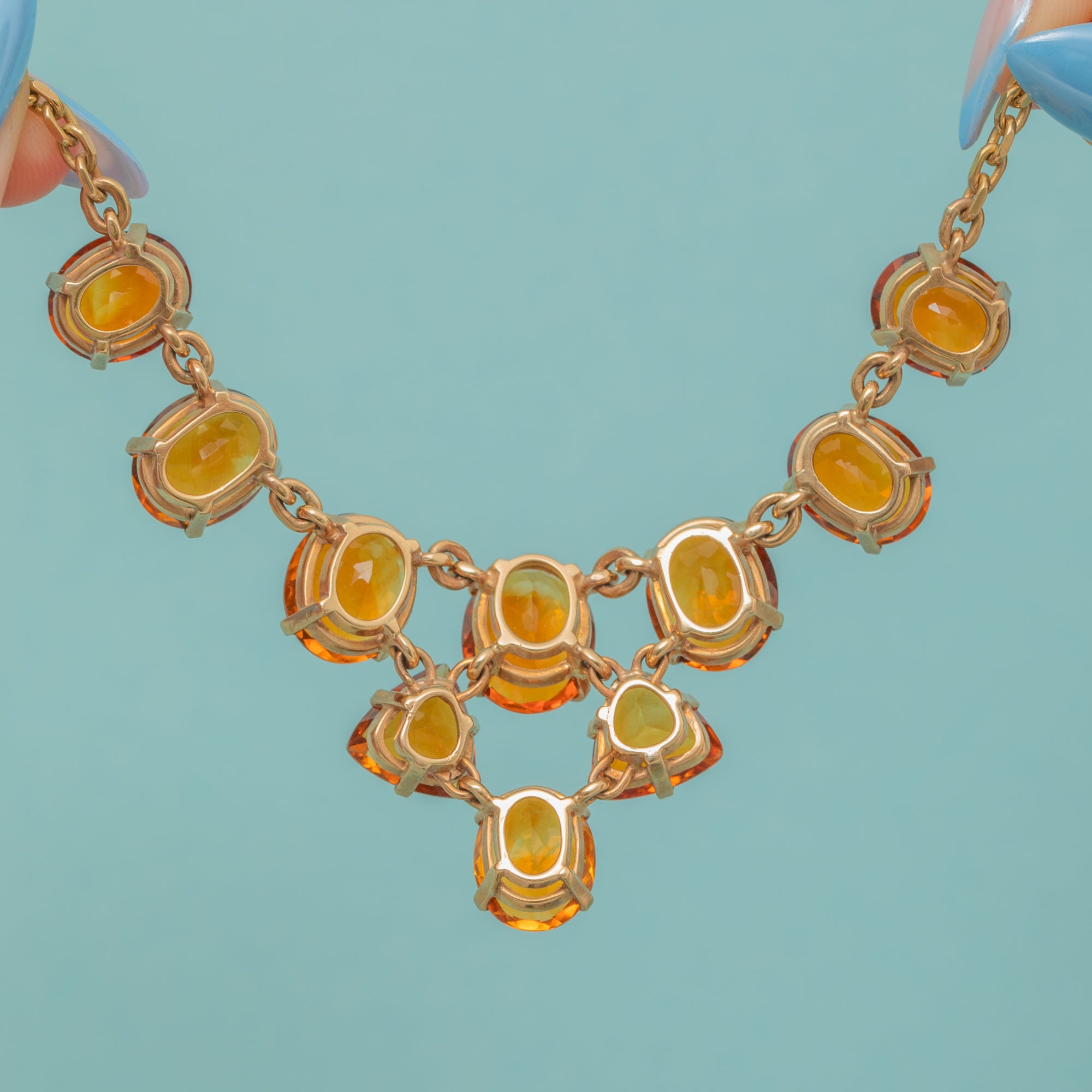 EXCELLENT: Each Madeira Citrine is radiant, free from any notable chips or nibbles, and set securely in its claws. The chain links are uniform and secure, and the bolt ring is in perfect working order. With the smooth setting backs providing comfortable wear and little else to note, this necklace can be worn with utmost confidence.