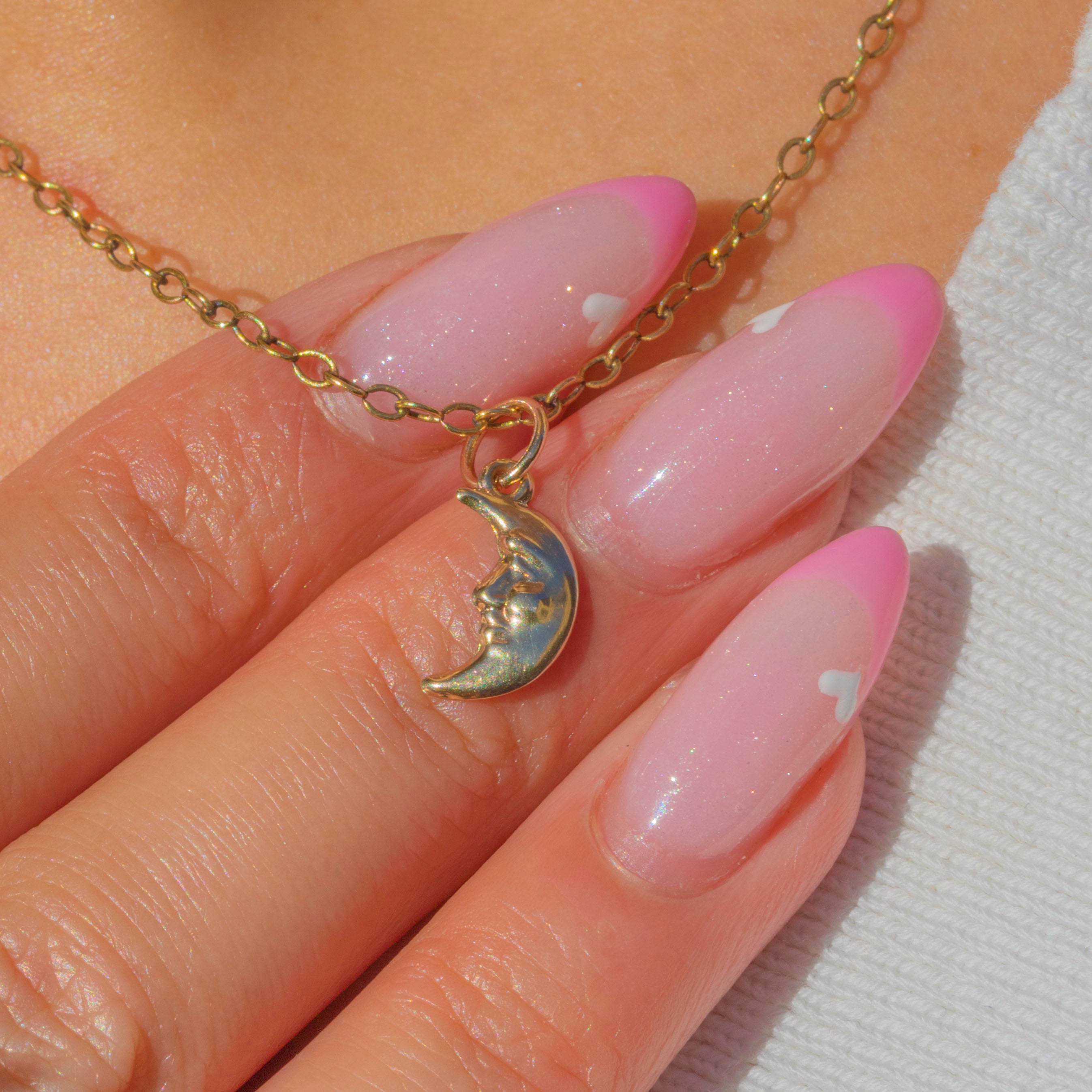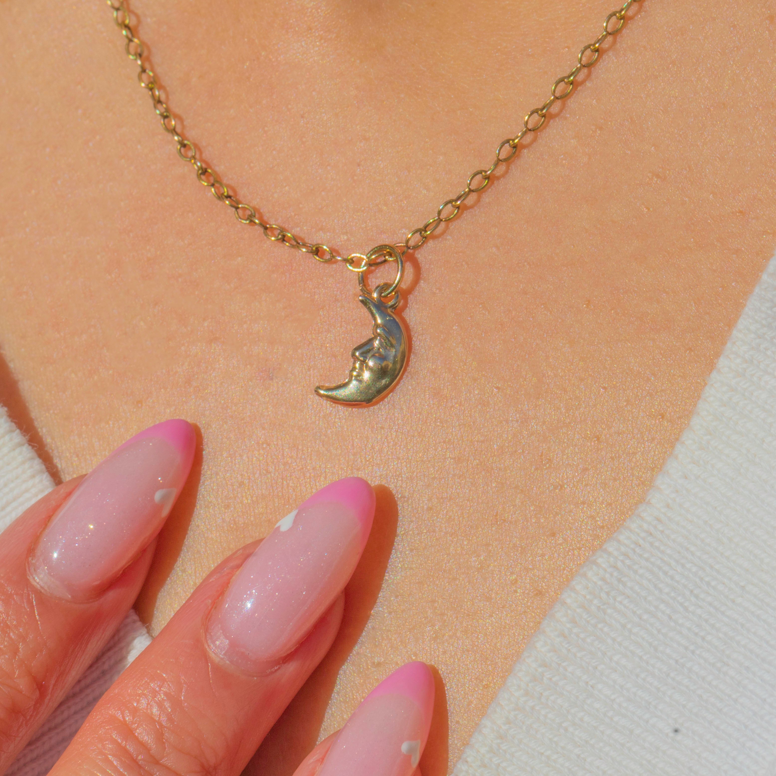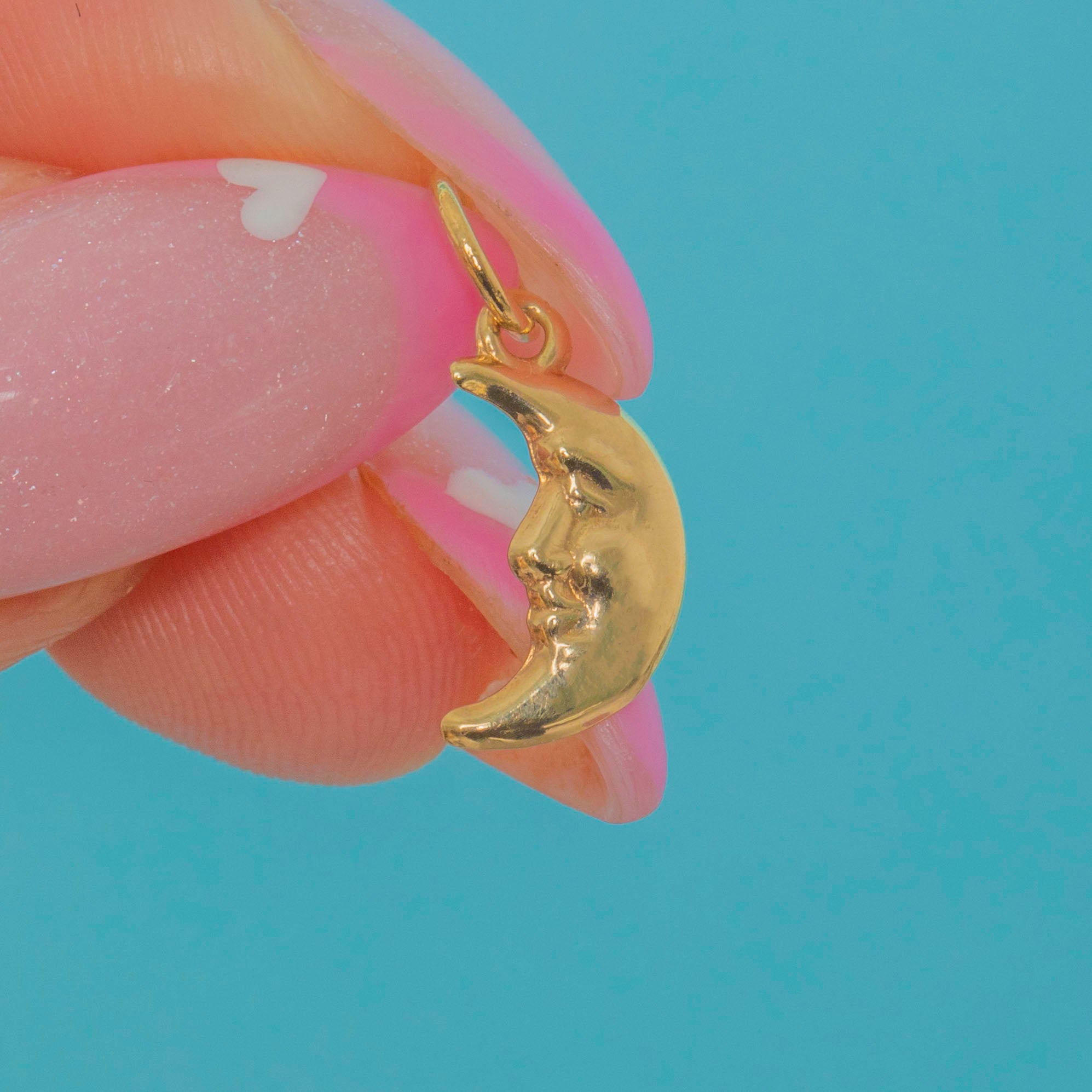 A dainty 9ct Gold Man-in-the-Moon charm with a sweet celestial motif. Lightly modelled with a serene crescent face, this tiny charm is full of character and charm, a playful nod to the stars that’s perfect for everyday wear.