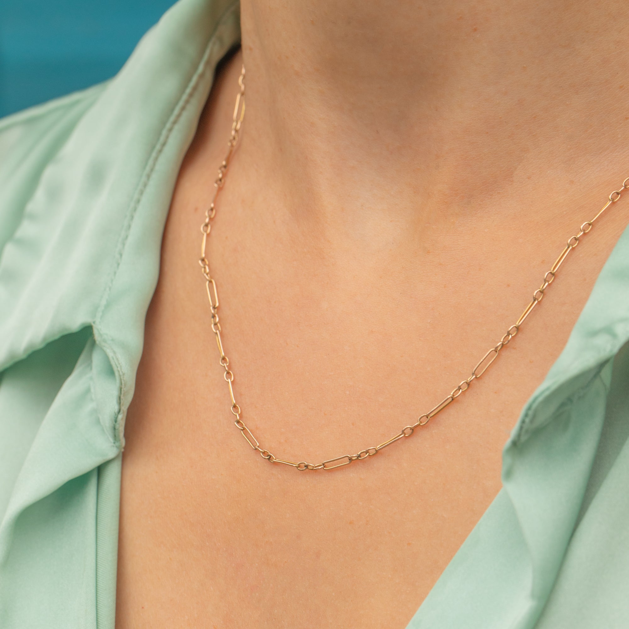 This delicate chain necklace is a wonderful example of understated antique design, featuring elegant trombone links crafted from 9ct Gold. The alternating elongated and shorter links create a refined rhythm to the design, making it elegant when worn alone or perfect for layering with other chains.
