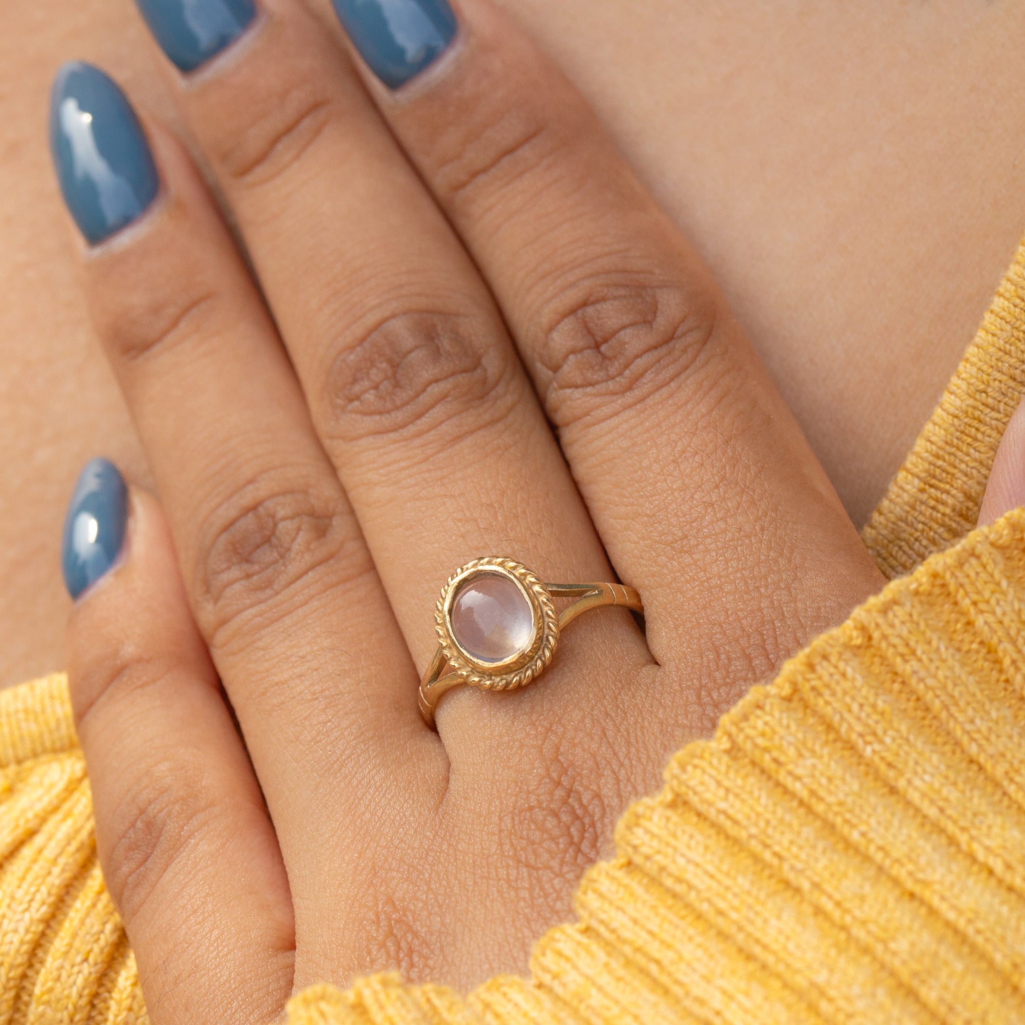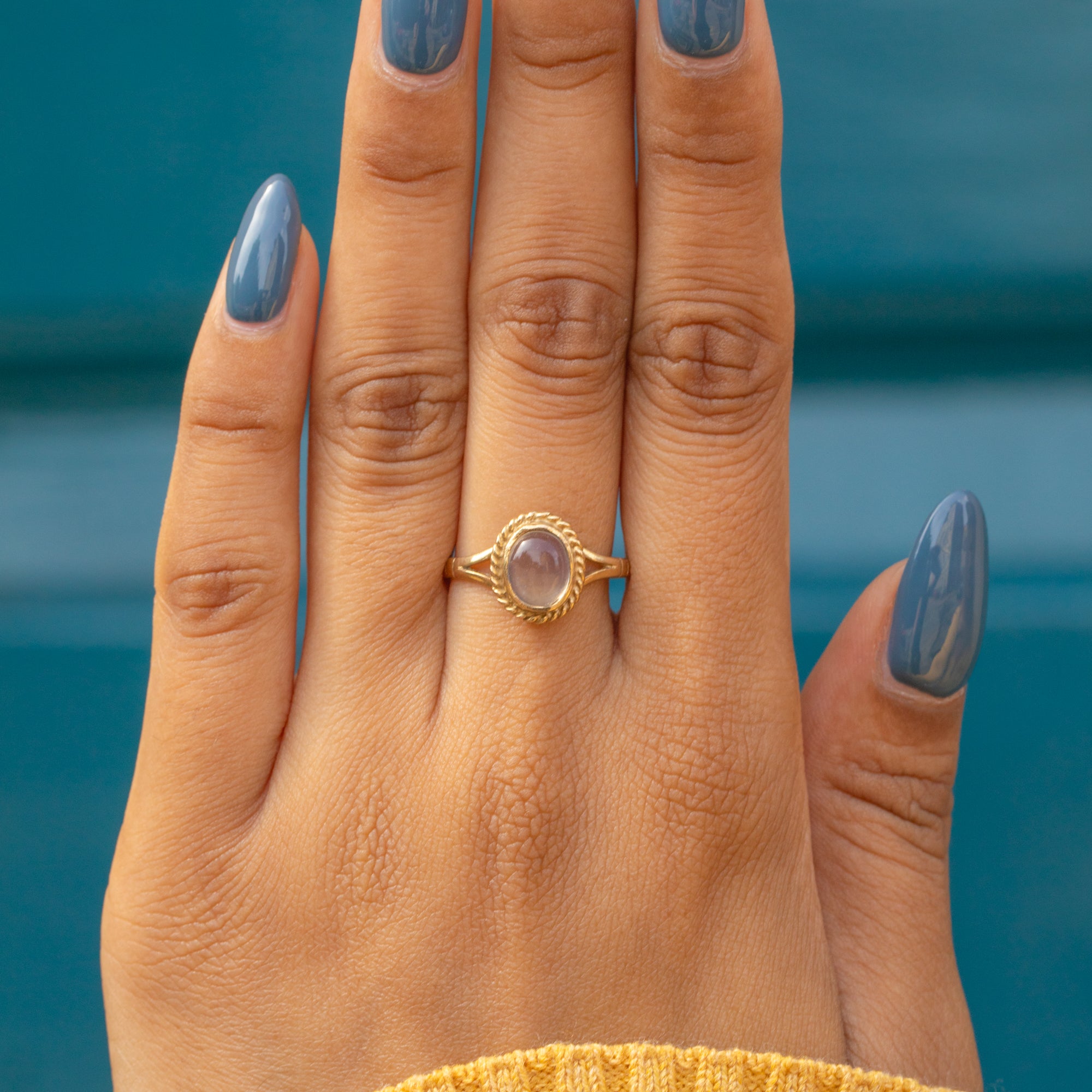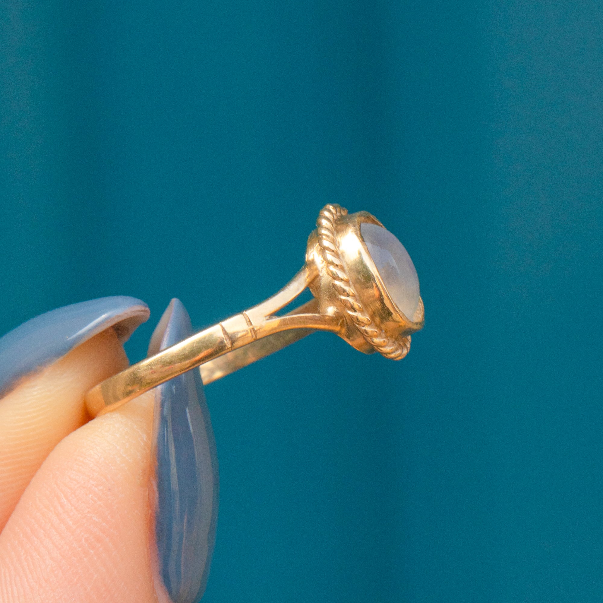 Prepare to be enchanted by this 9ct Gold Moonstone ring! The ethereal Moonstone poised in the centre sits like a mystical ball ready to read the future of any onlookers. Her milky blue adularescence is encased in buttery 9ct Gold rope detailing and boasts a high profile, she can't be missed!
