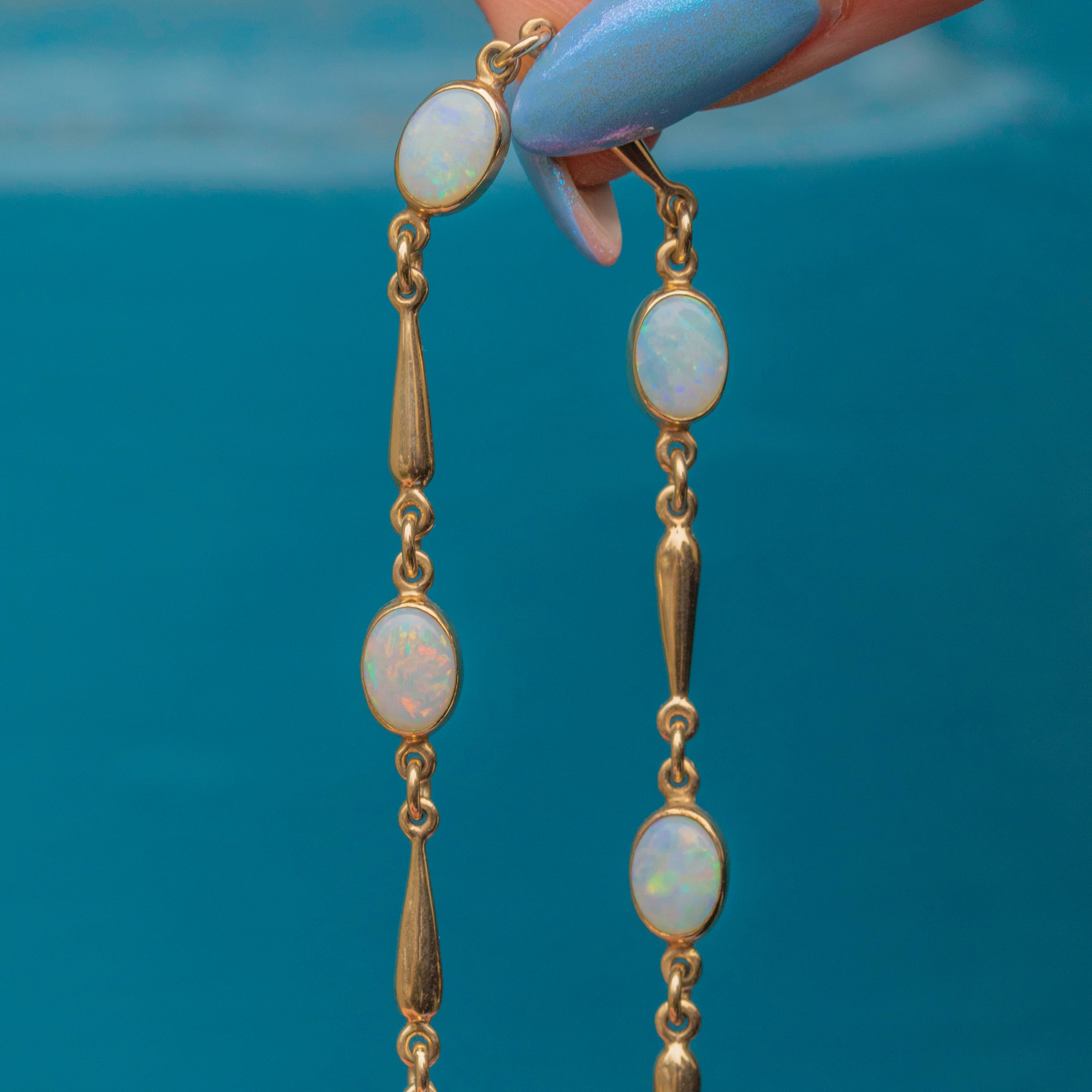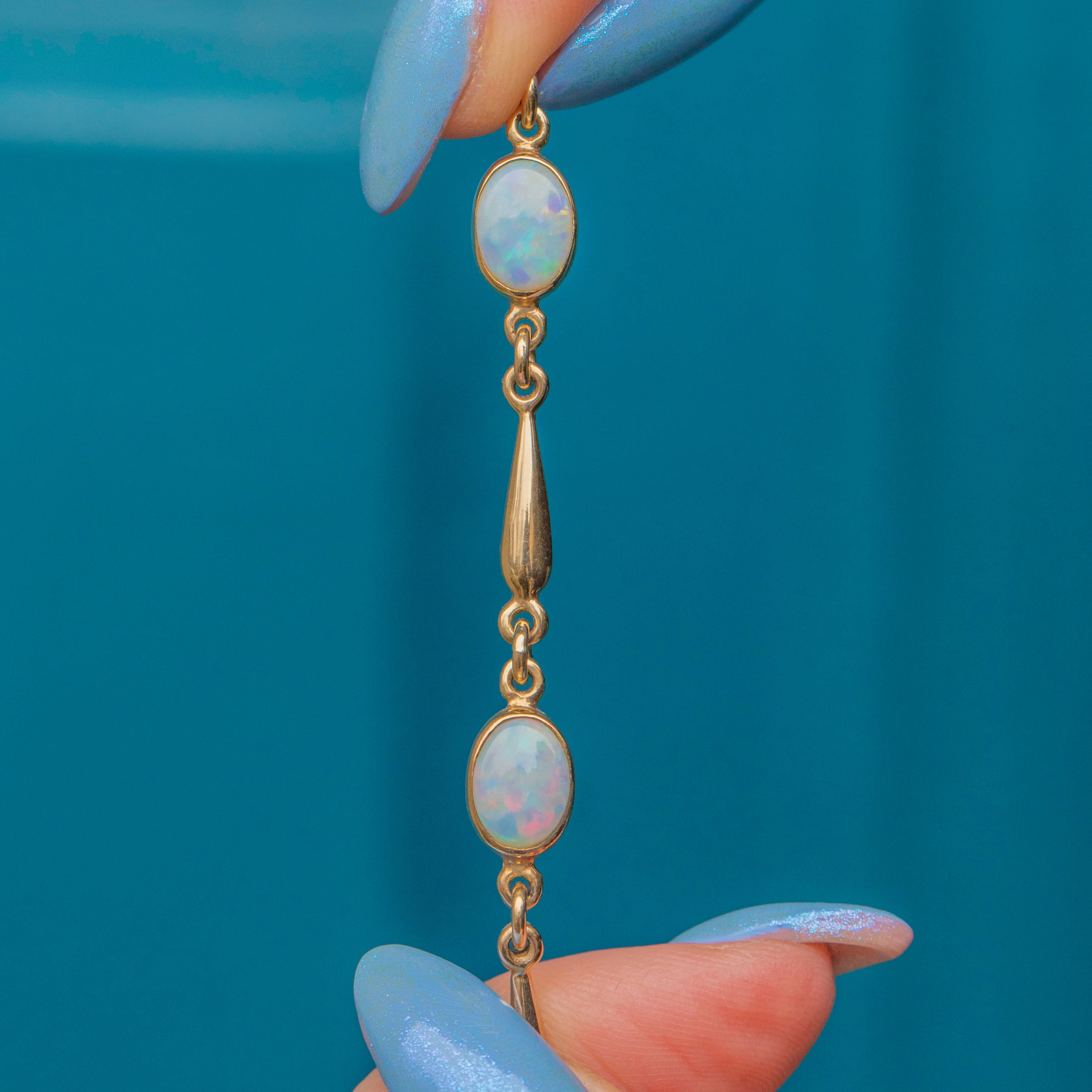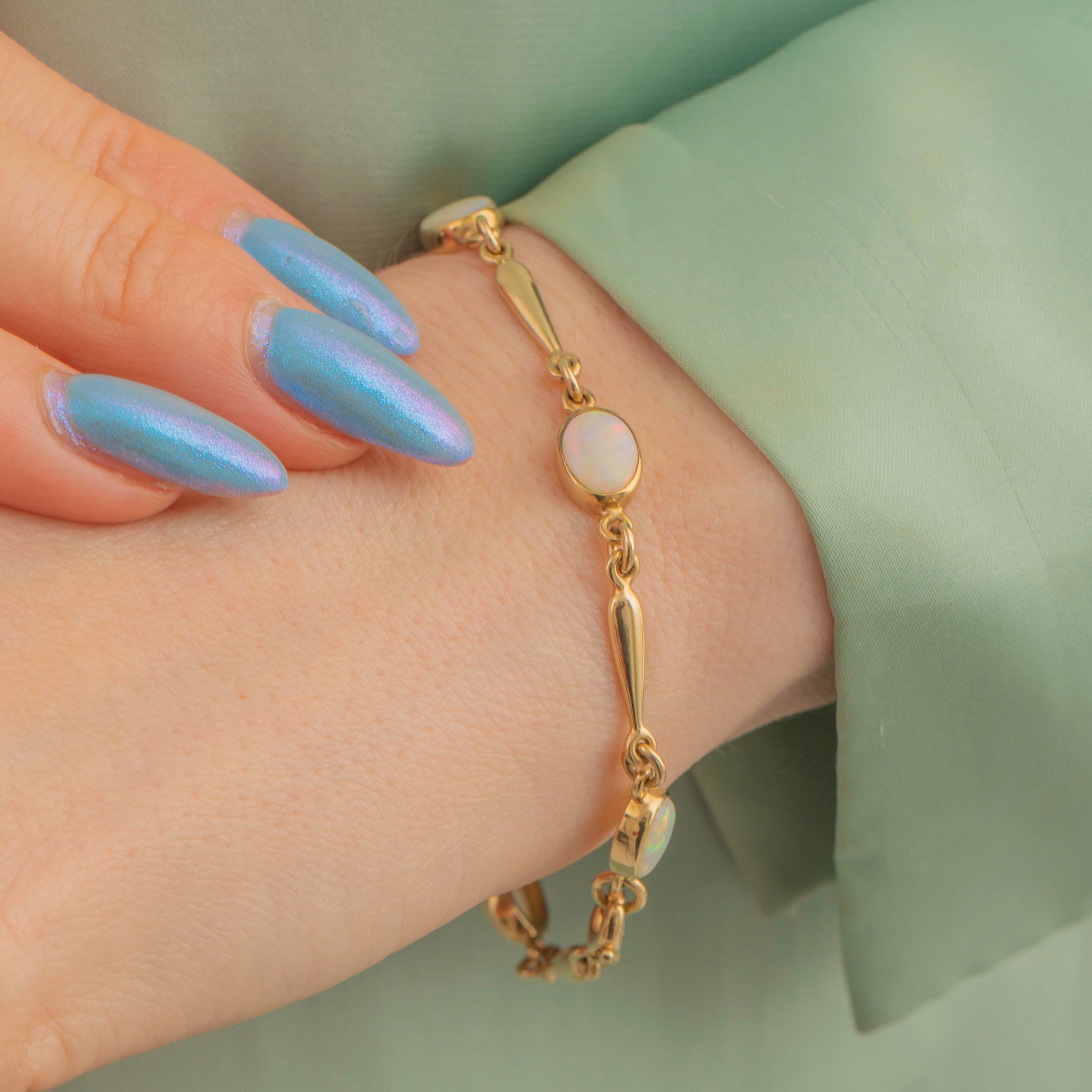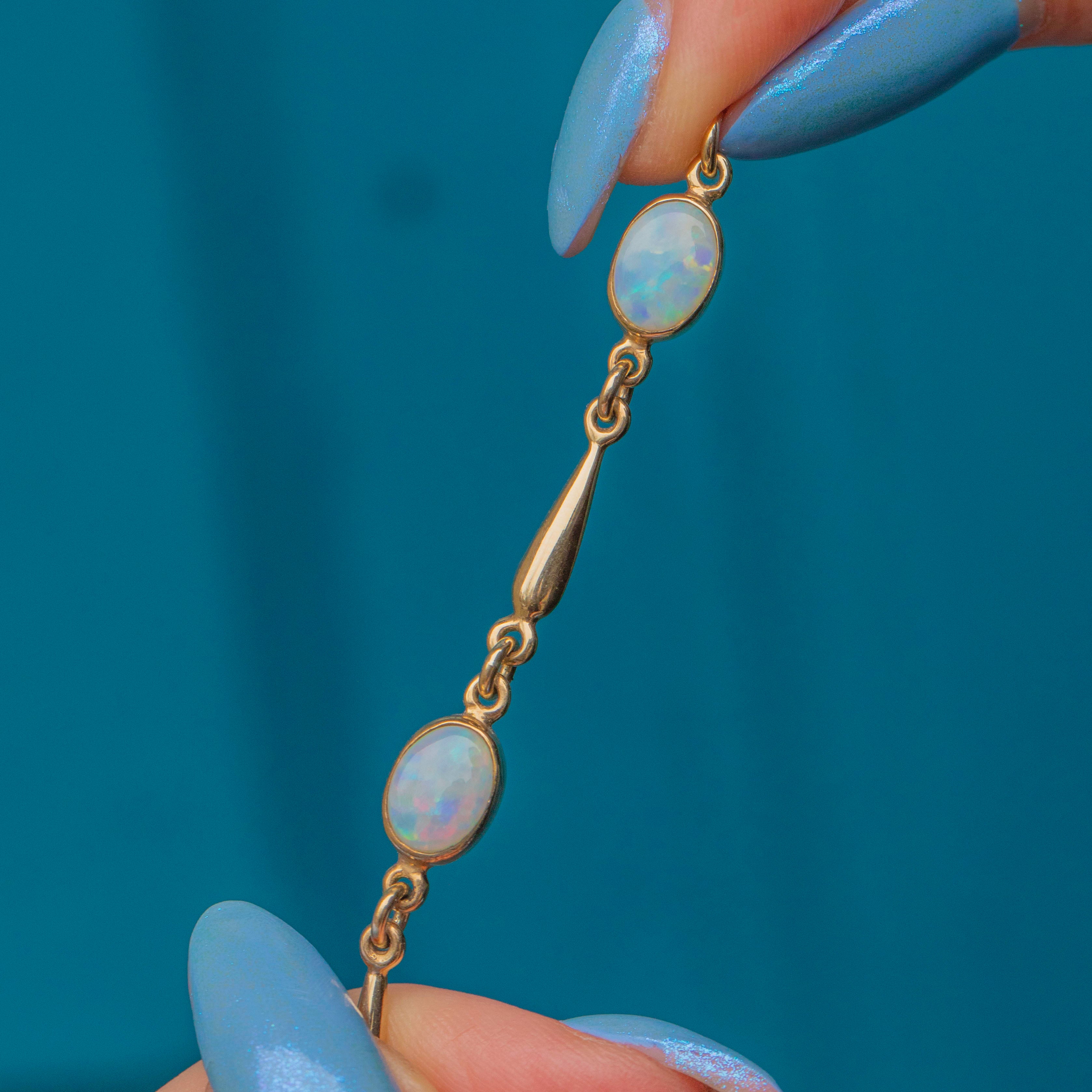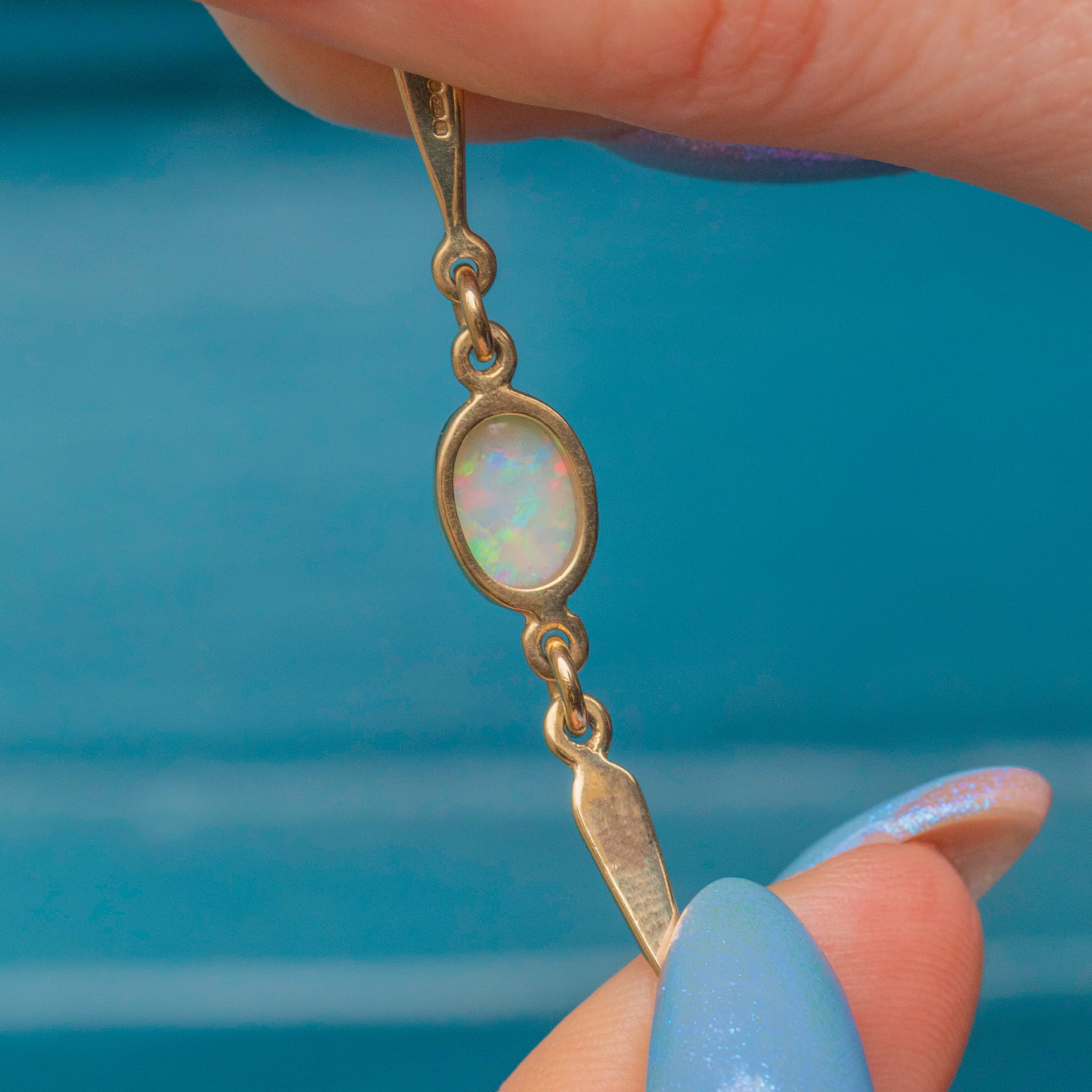 This 9ct Gold Opal bracelet is the epitome of refined elegance and sophistication. Sitting securely within buttery Gold bezel settings, this vintage Gold bracelet features five creamy oval Opals, with a combined weight of 1.60ct. Each Opal catches the light wonderfully, revealing flecks of vibrant greens and oranges against their sky blue core.