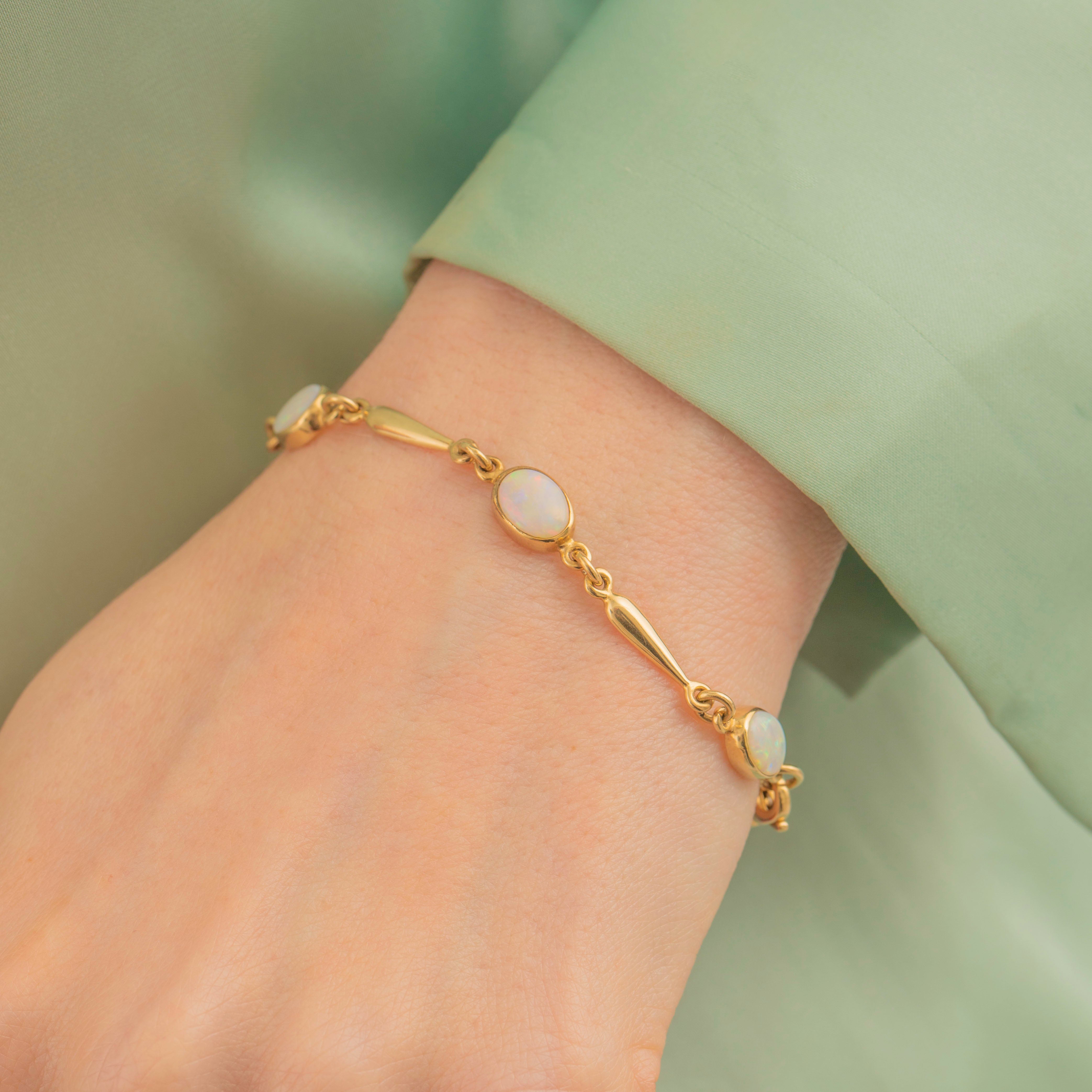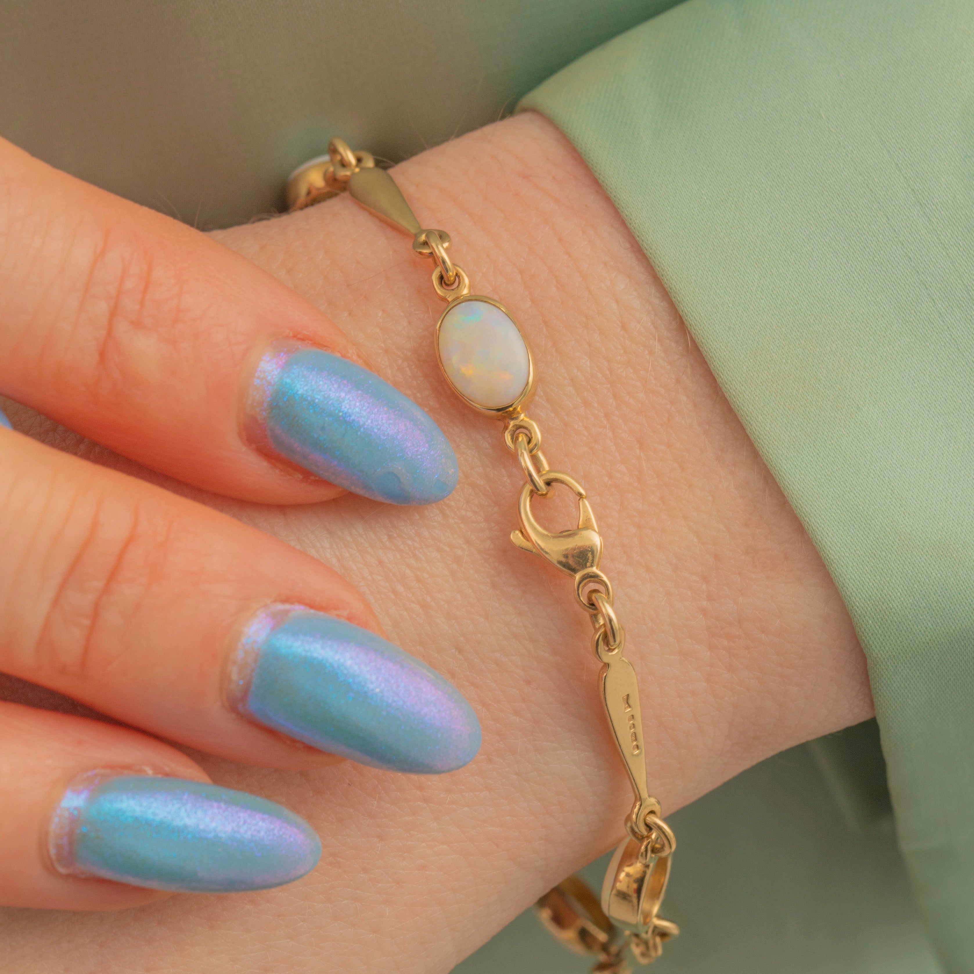 EXCELLENT. This 9ct Gold Opal bracelet is in excellent condition. Each Opal is free from notable signs of wear, sitting securely within its bezel and the bracelet is fully hallmarked to the year 1998. With a secure clasp you can wear this sleek piece of vintage jewellery with absolute confidence!