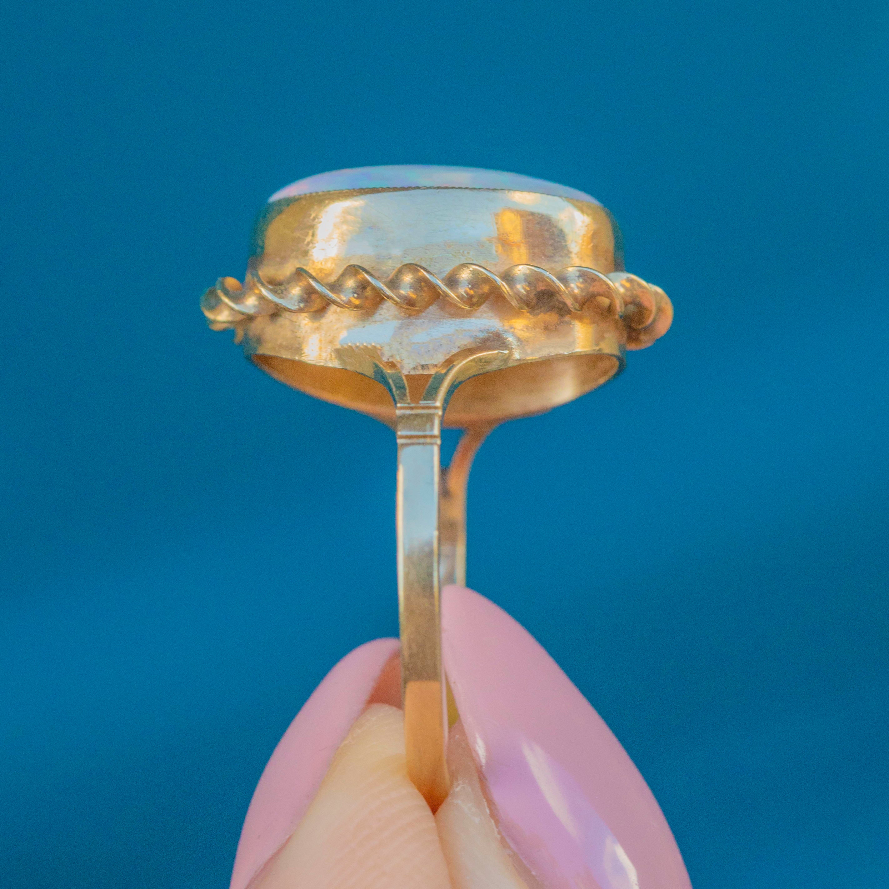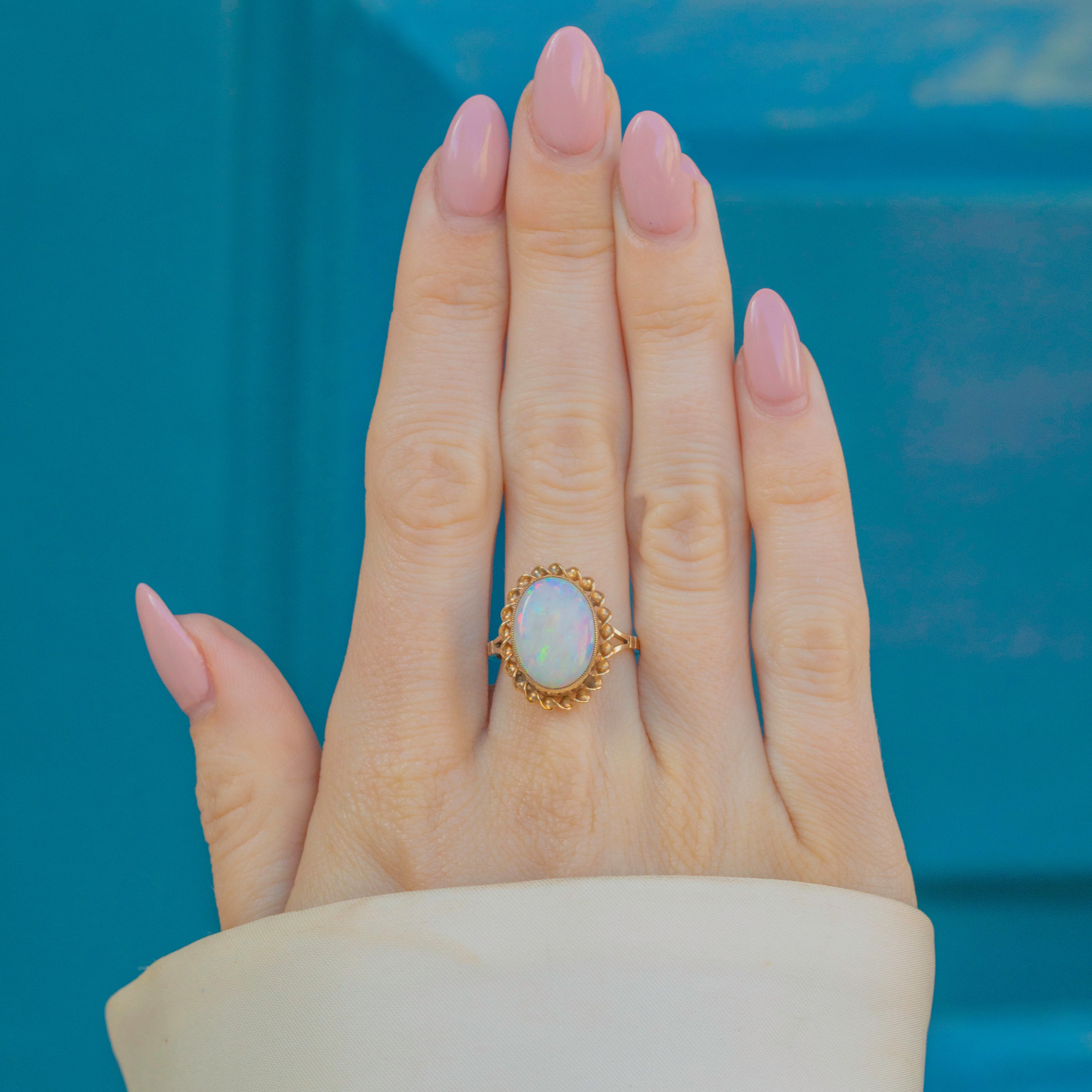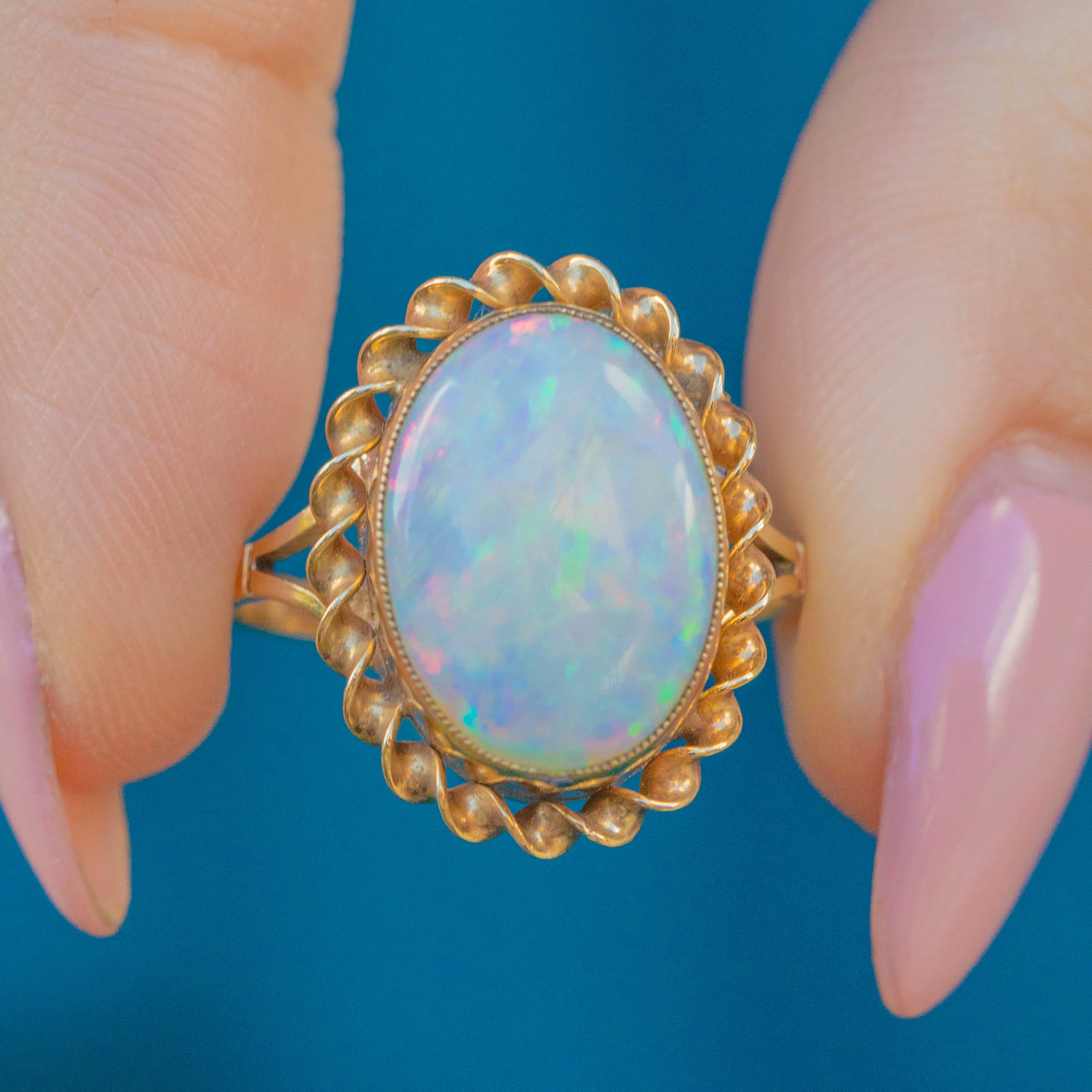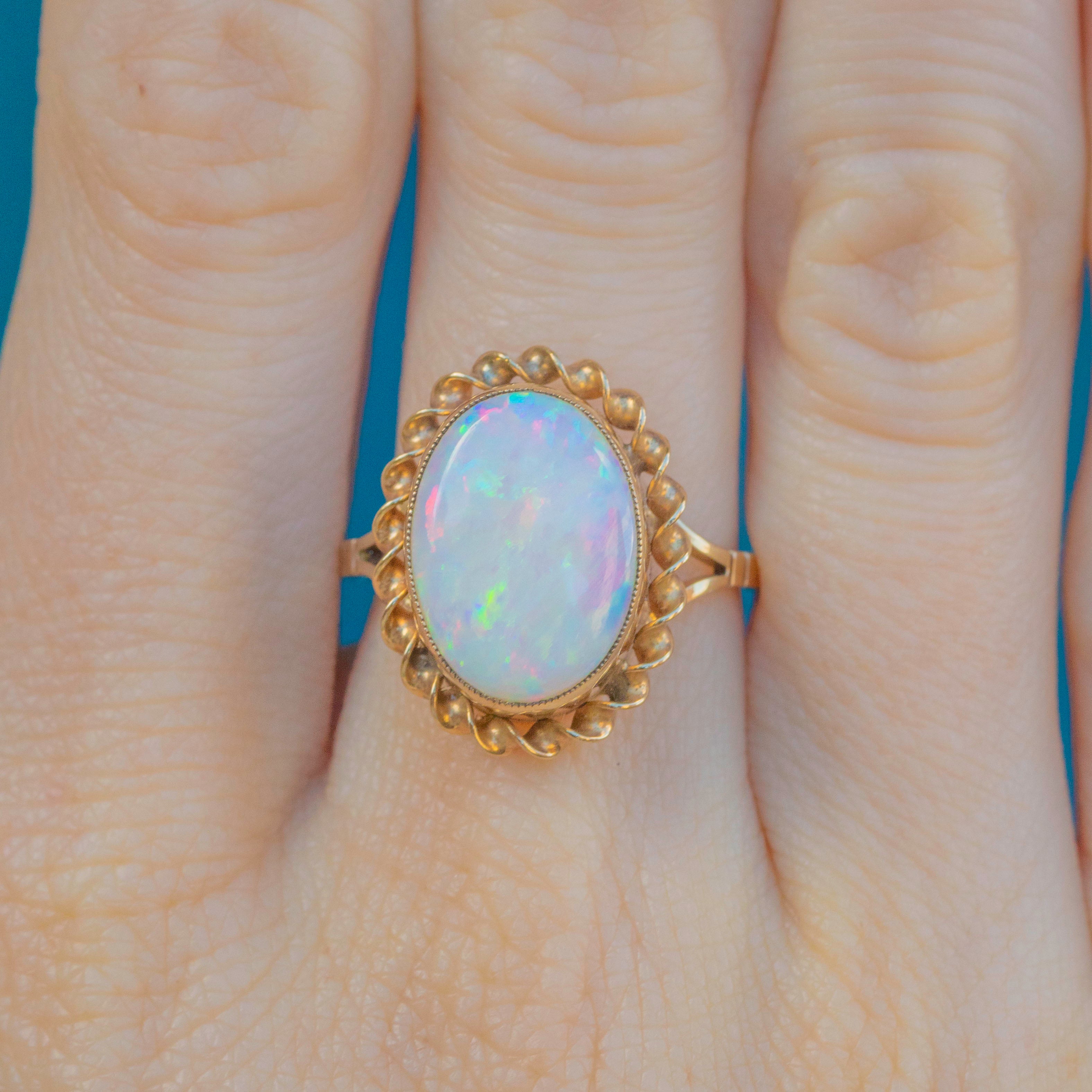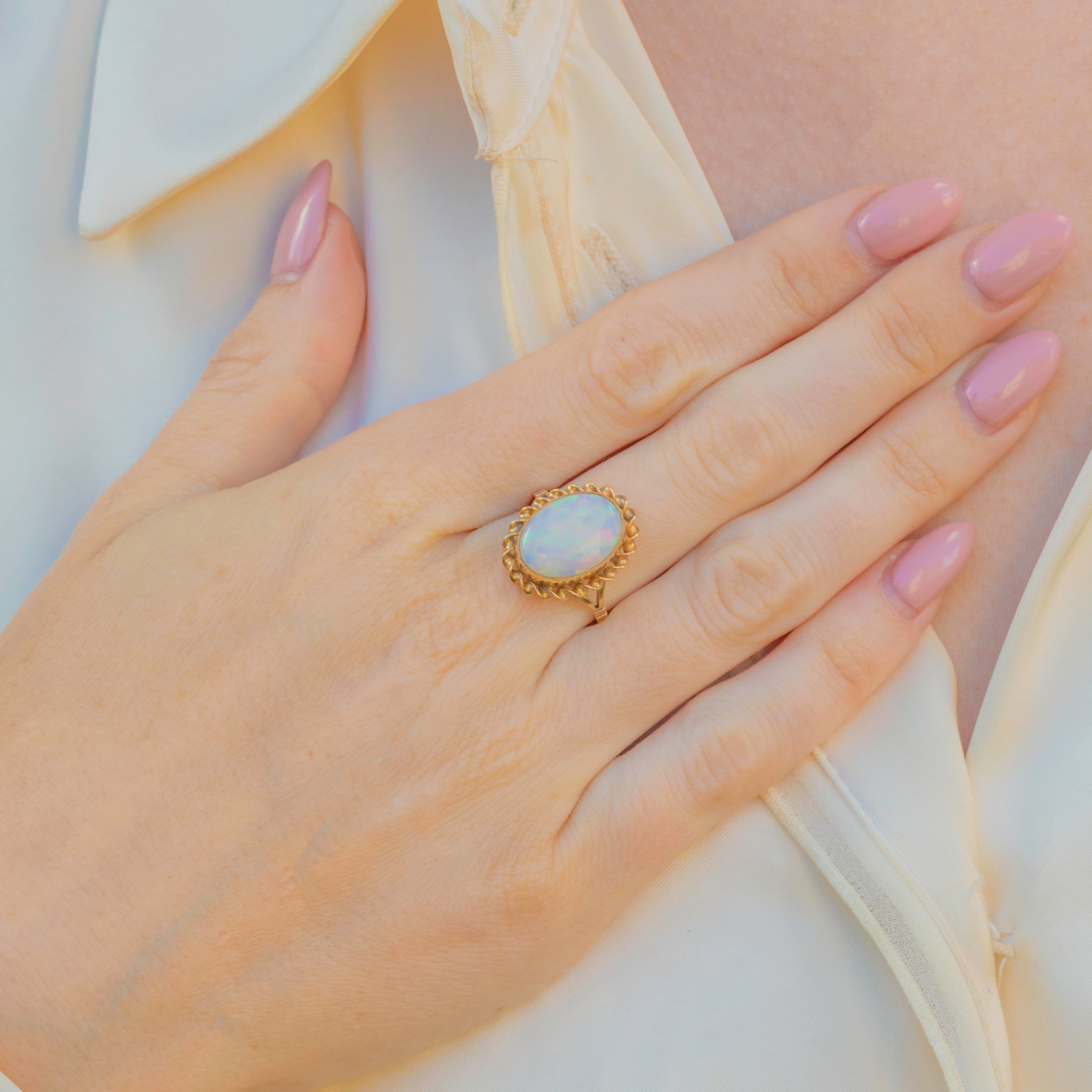 The smoothly cut Opal cabochon is wrapped up in a chunky bezel and haloed by a twisted rope border for a decorative finishing touch. Make a statement wherever you go with this eye-catching mid-century vintage adorning your hand!