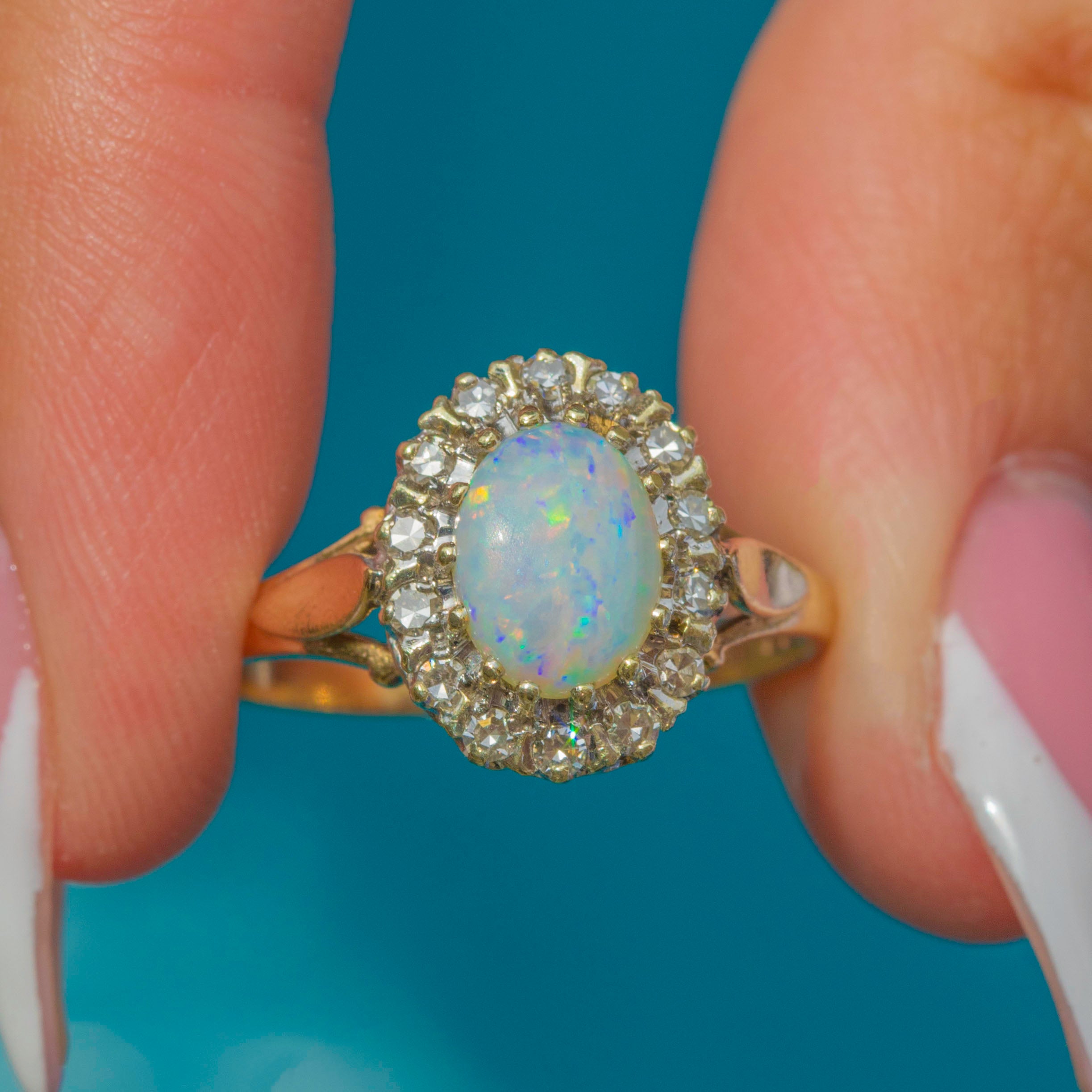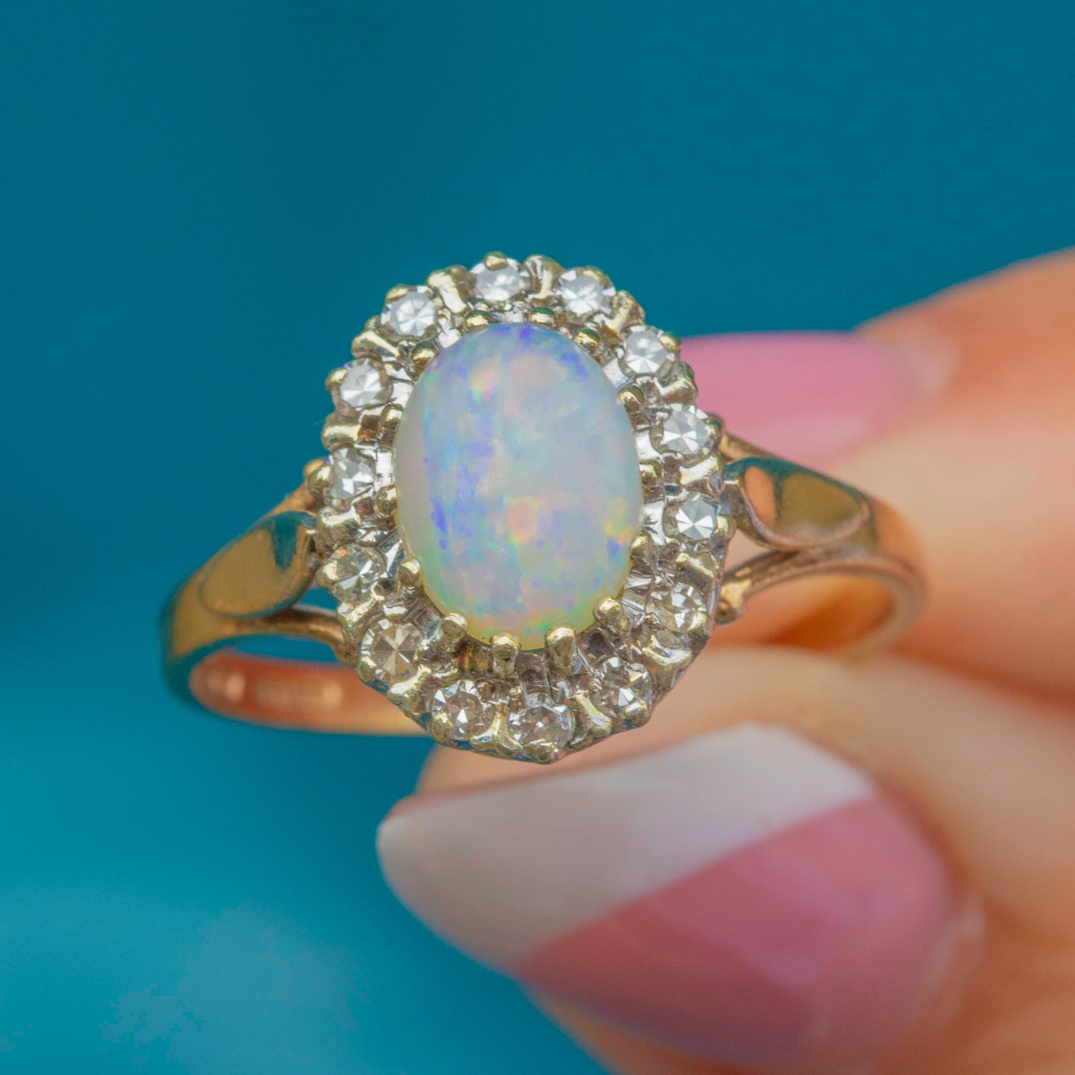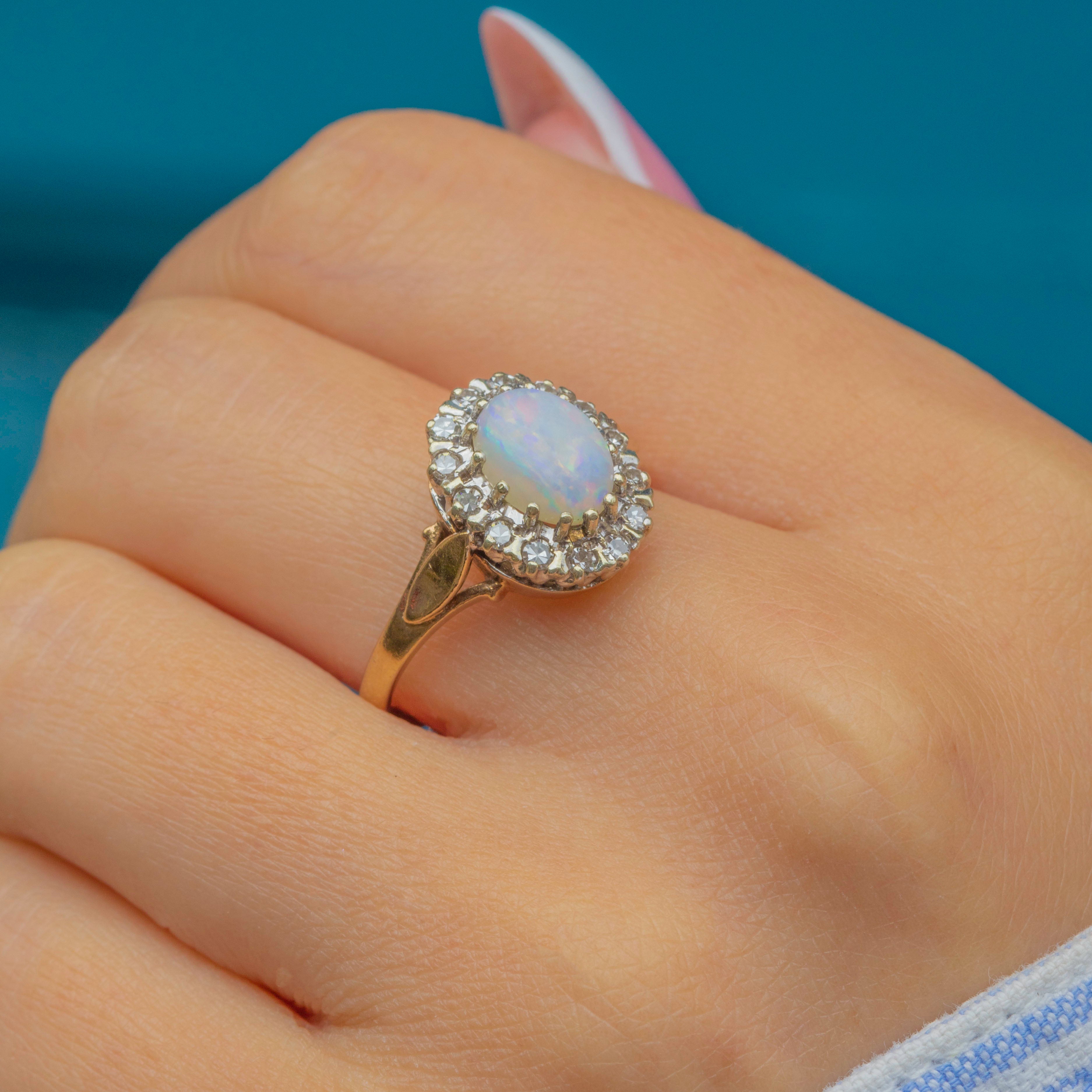 A luminous Modern Vintage cluster ring crafted from warm 9ct Gold. An oval Opal with vibrant play-of-colour sits at the centre, embraced by a sparkling halo of Diamonds for a classic, elegant silhouette. The openwork gallery and tapered shoulders give a pretty, wearable profile.