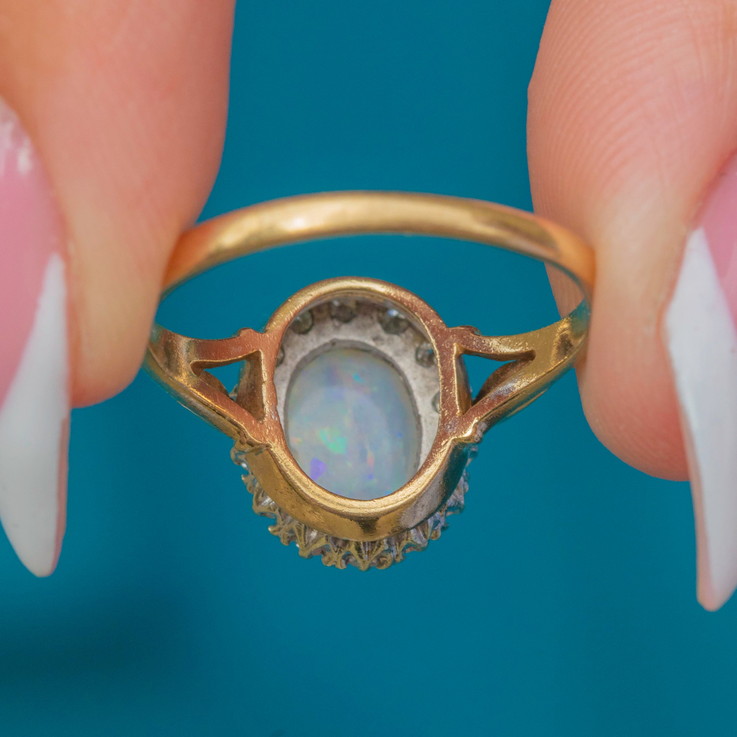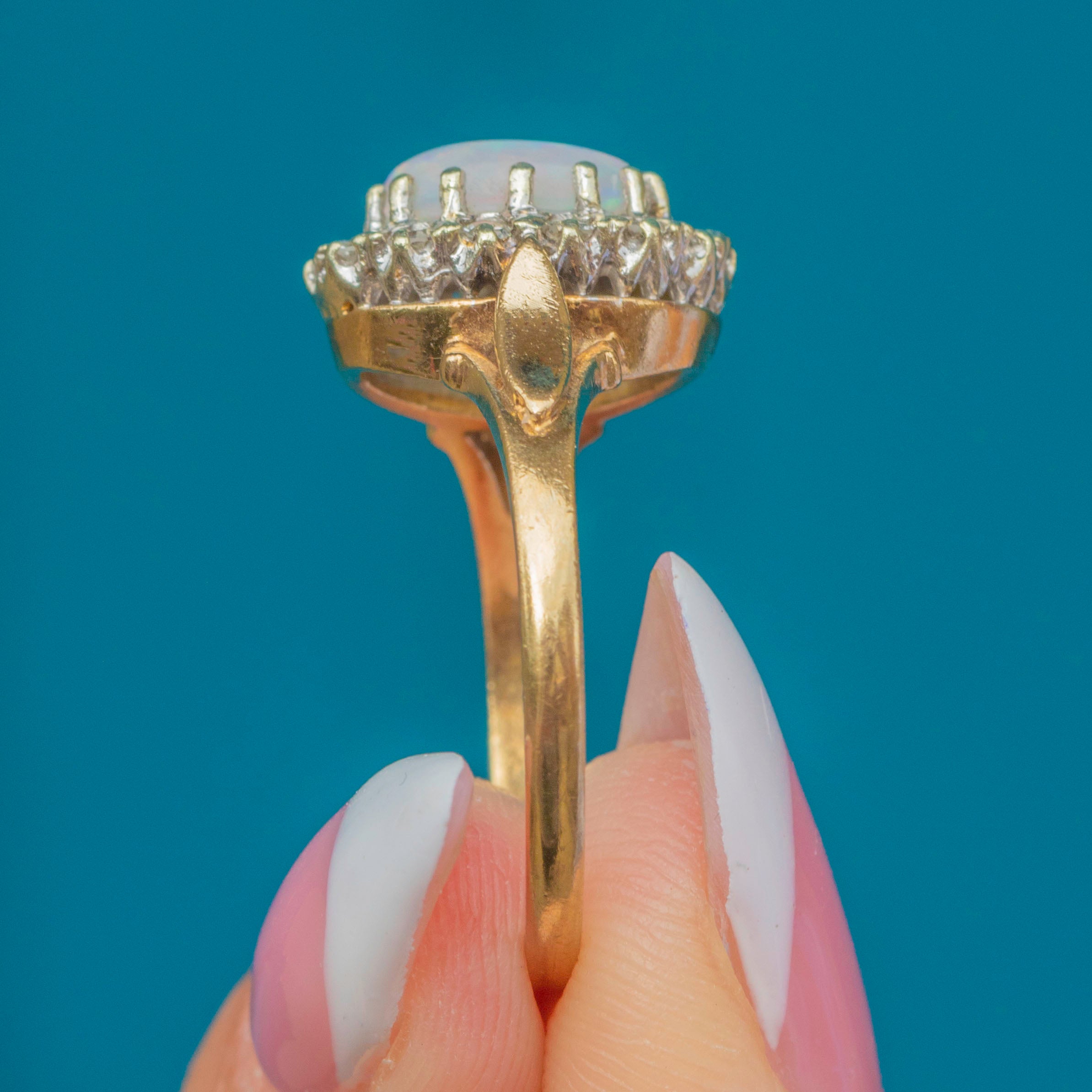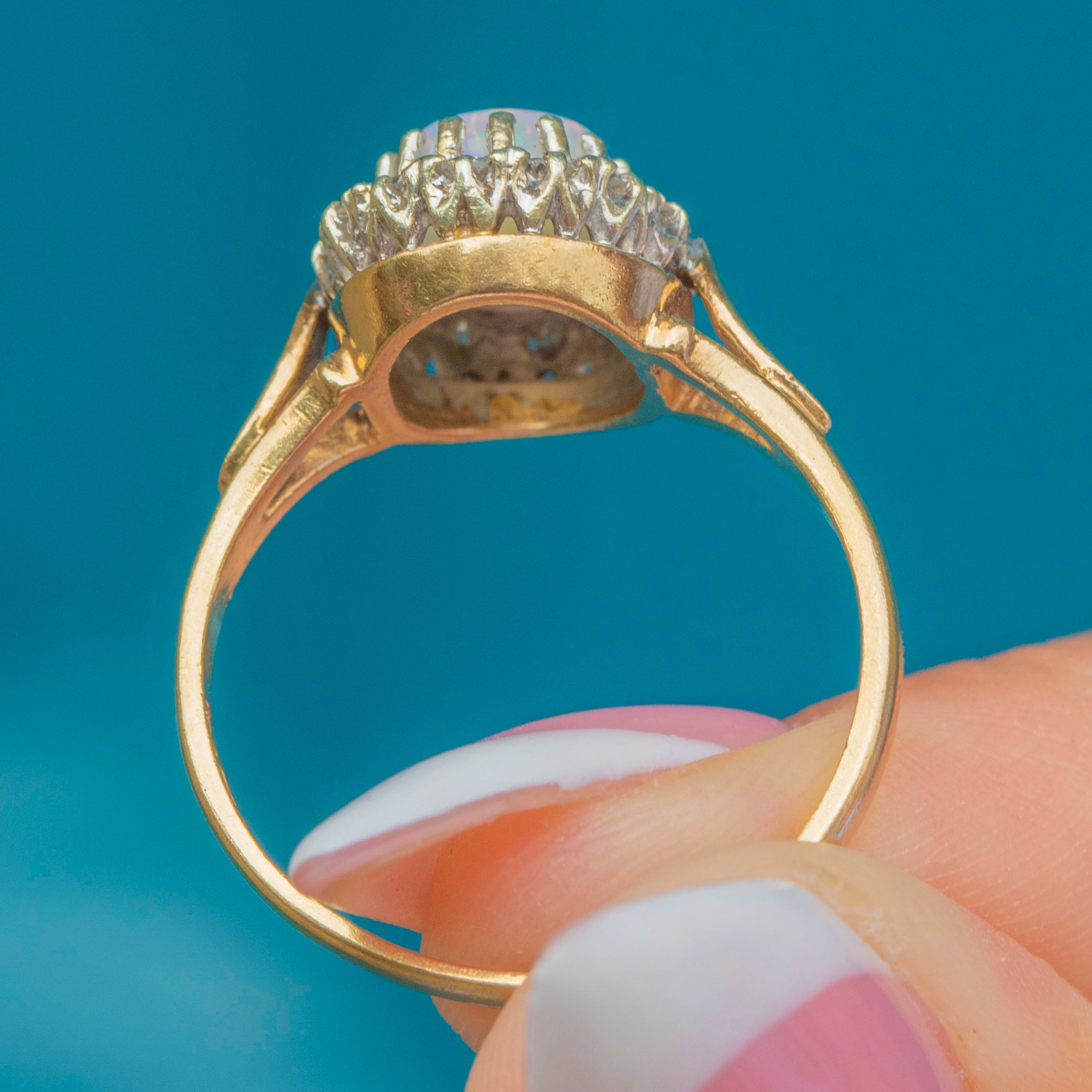 A luminous Modern Vintage cluster ring crafted from warm 9ct Gold. An oval Opal with vibrant play-of-colour sits at the centre, embraced by a sparkling halo of Diamonds for a classic, elegant silhouette. The openwork gallery and tapered shoulders give a pretty, wearable profile.