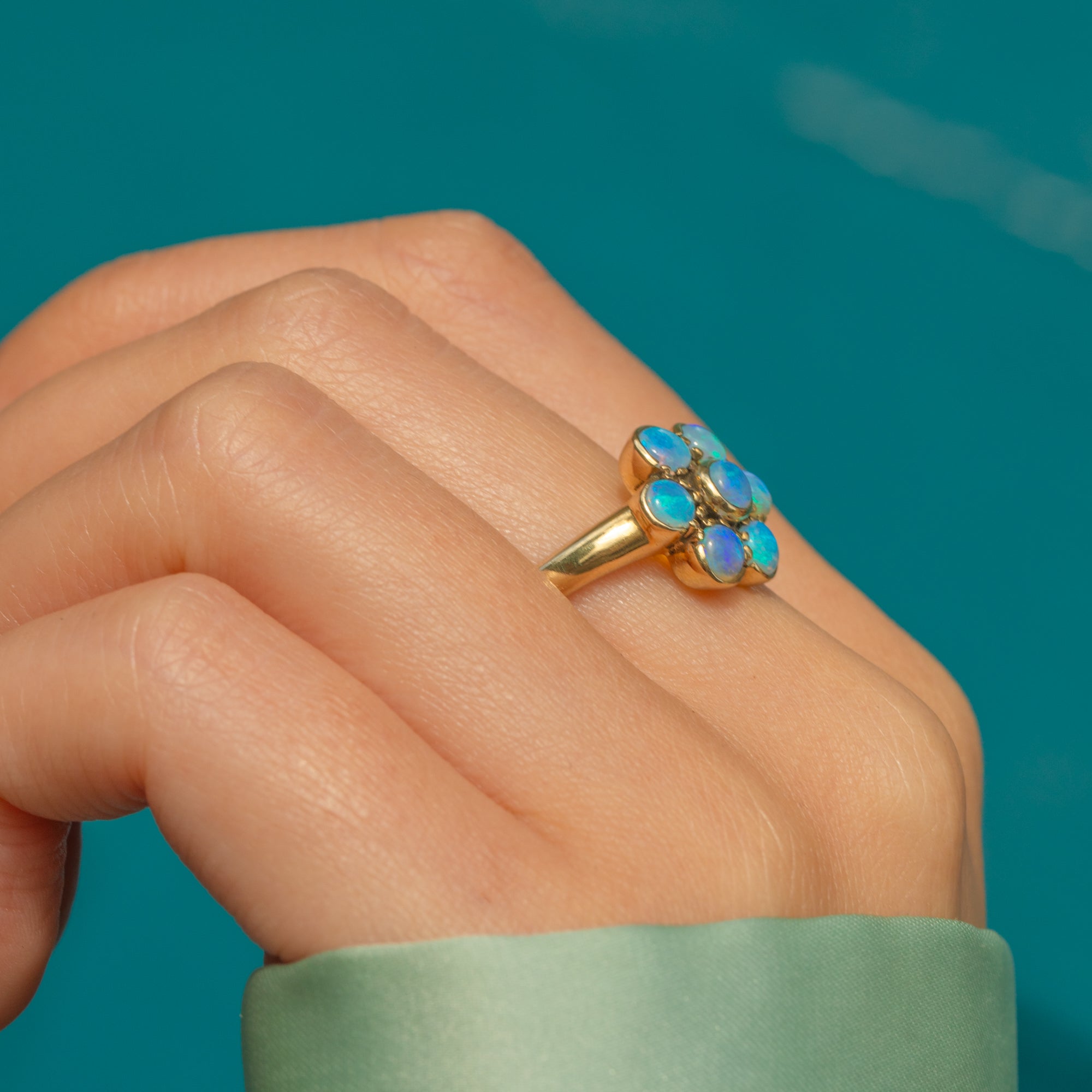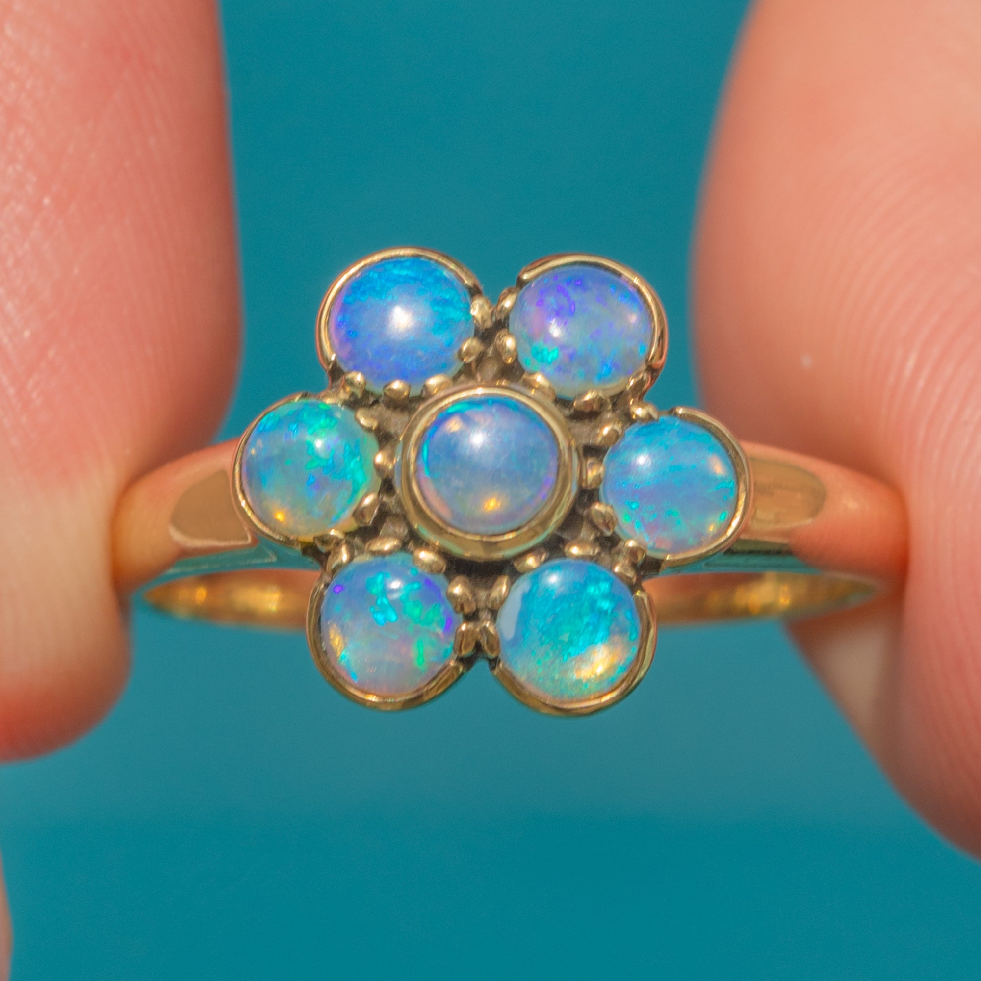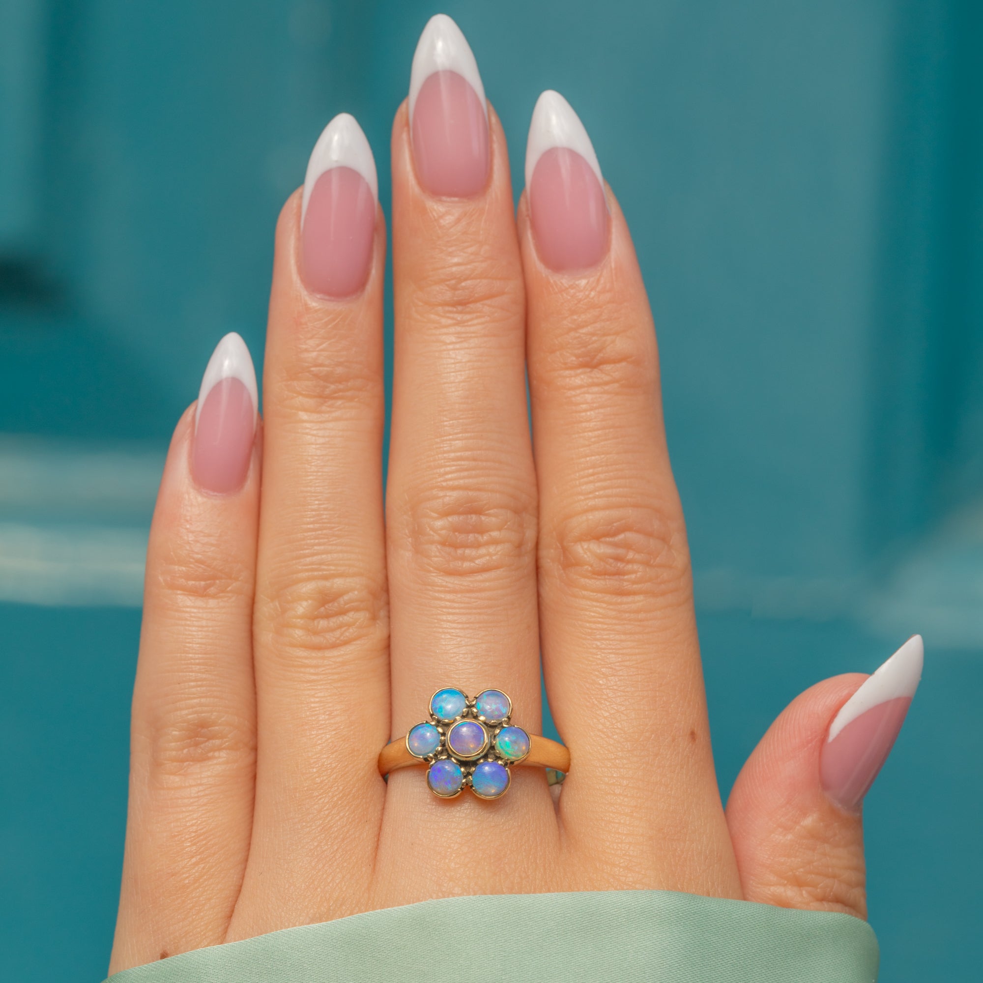 We adore this 9ct Gold Opal flower cluster ring. This vintage beauty features a pretty Opal flower, resting on a crisp 9ct Gold band!