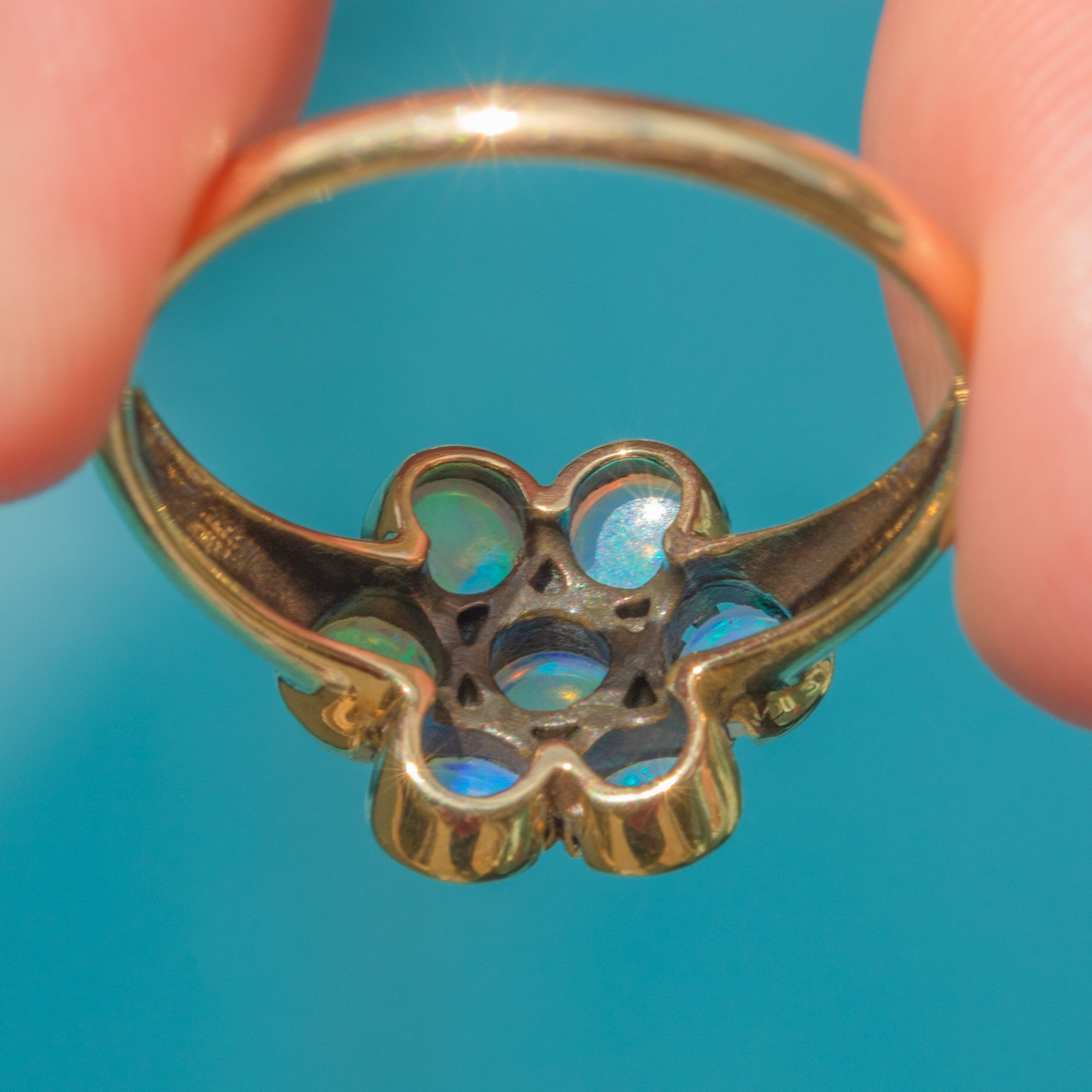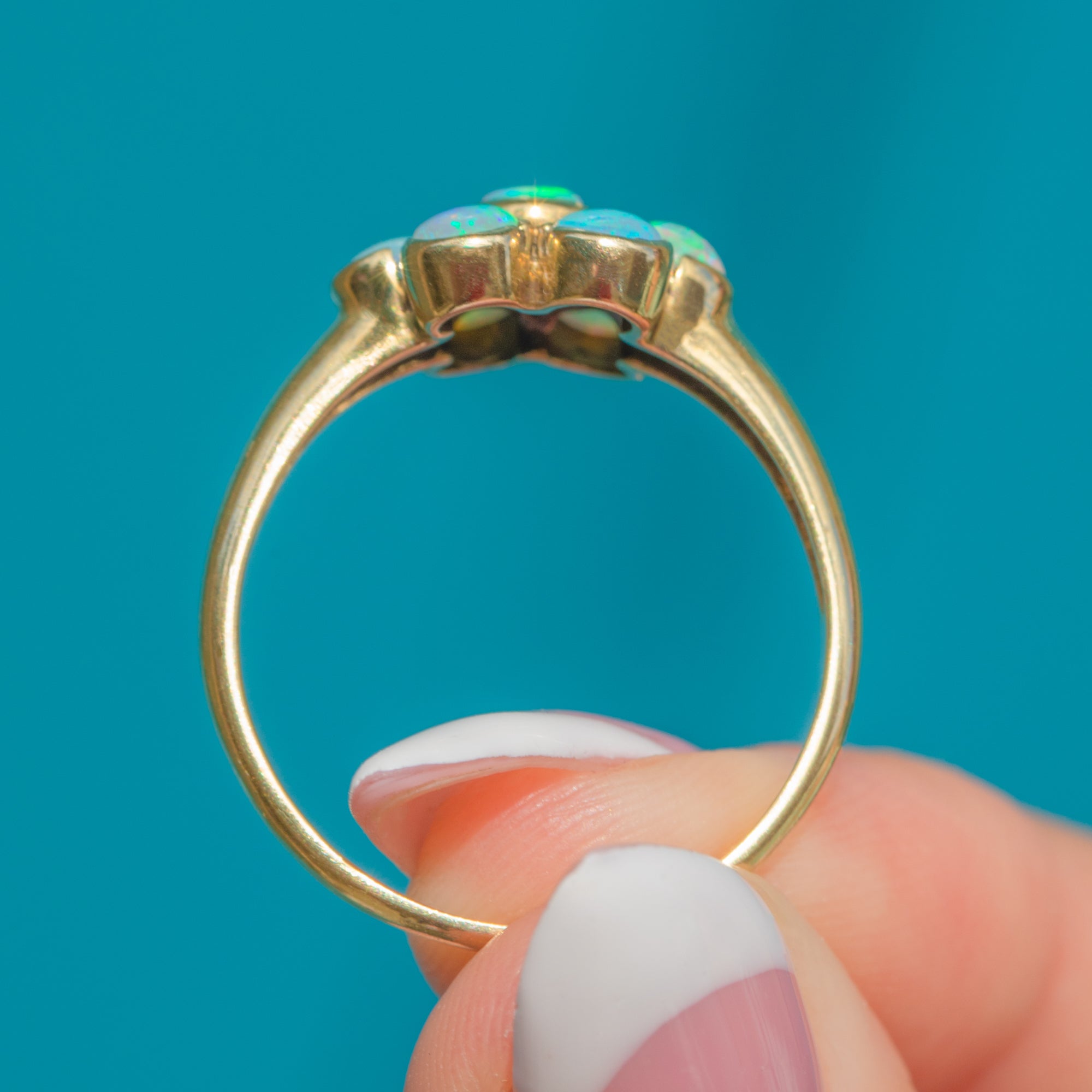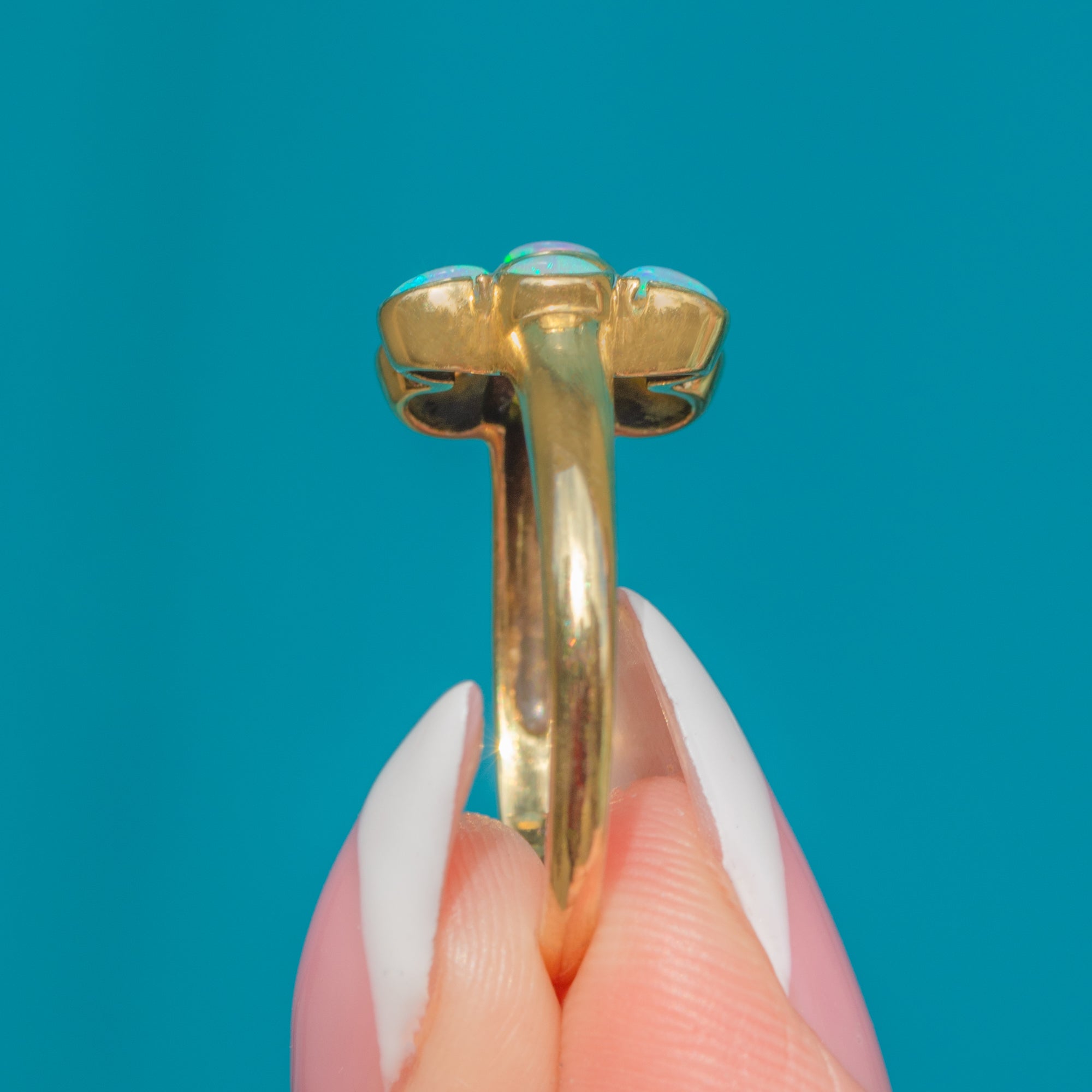 EXCELLENT: The ring has a robust 9ct Gold band and the Gold is bright and buttery. The Opals are secure in their settings and have a wonderful play of colour, free from chips or scuffs. This is a lovely piece with great wear potential!