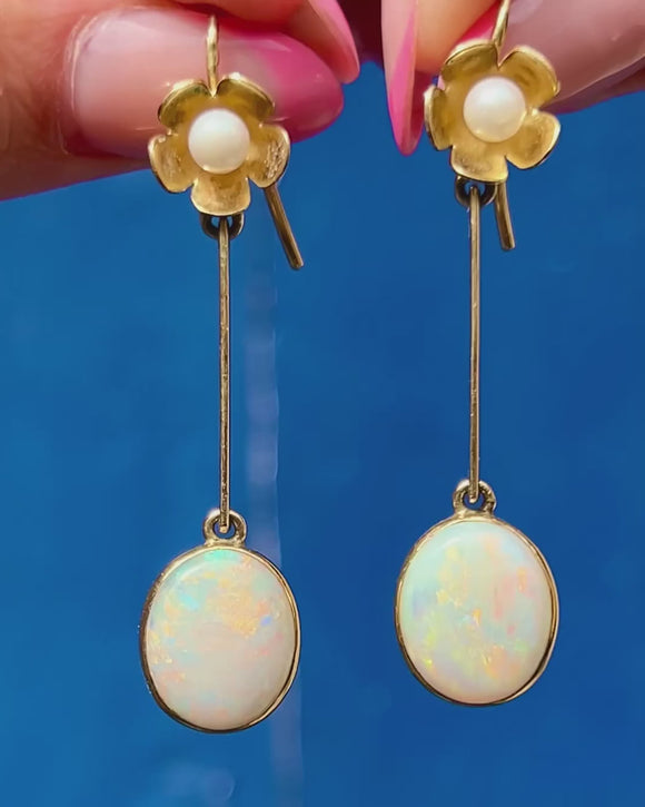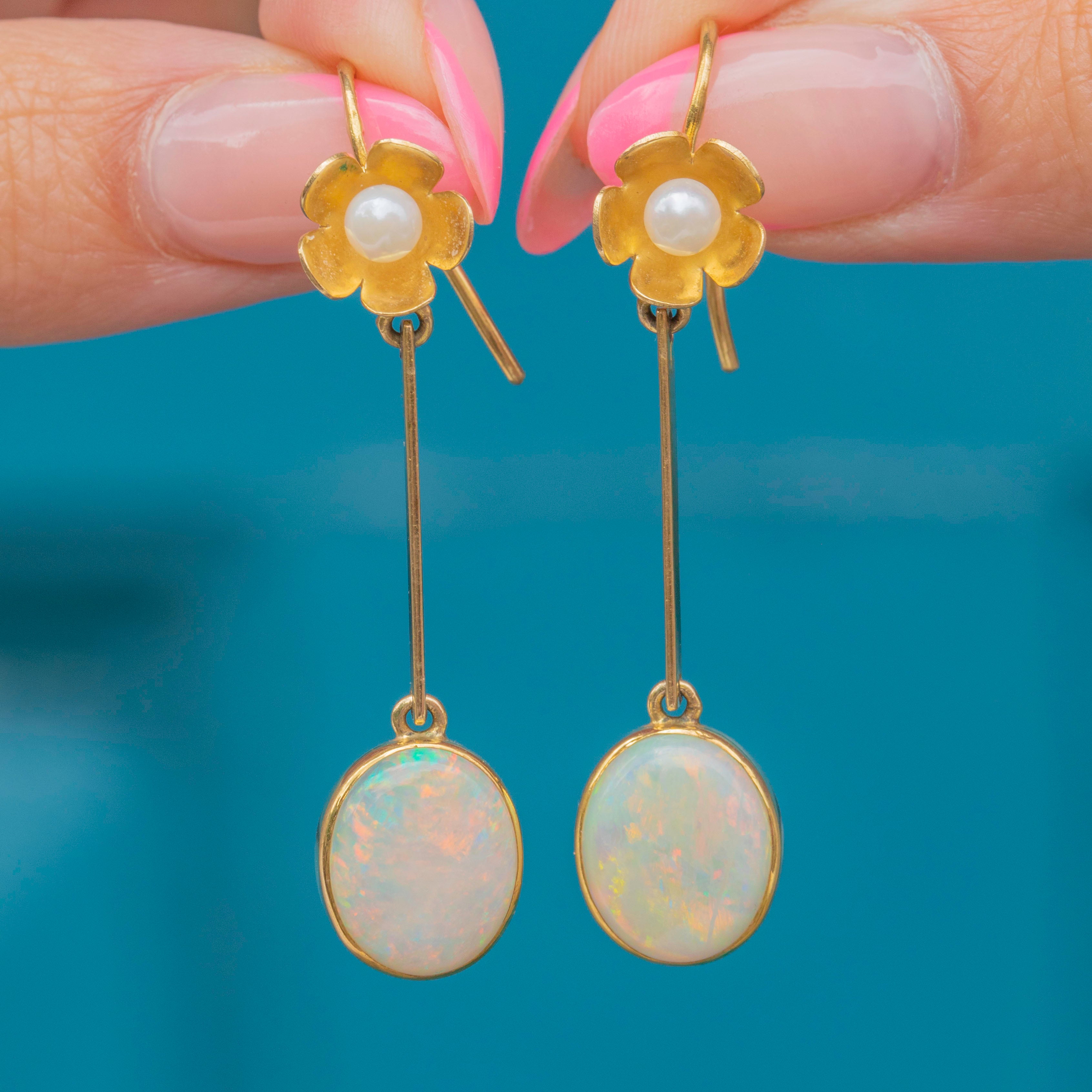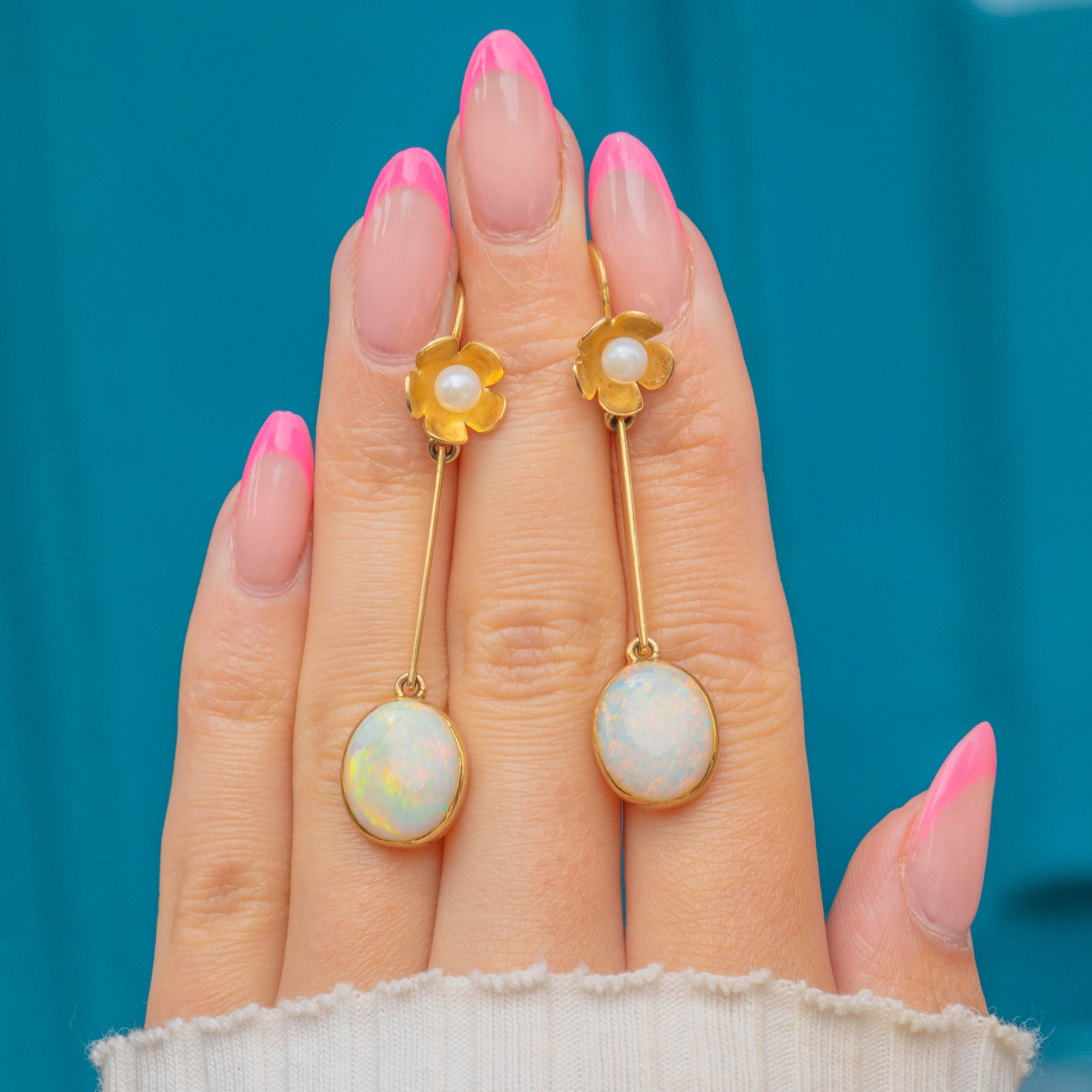 VERY GOOD-EXCELLENT: These vintage Opal and Pearl floral drop earrings are in great condition. Each Opal and Pearl is radiant, and free from any evident signs of wear. There are small spots of discolouration to the Gold, though this is difficult to spot without a loupe. With securely attached hooks, these drop earrings can be worn with confidence.