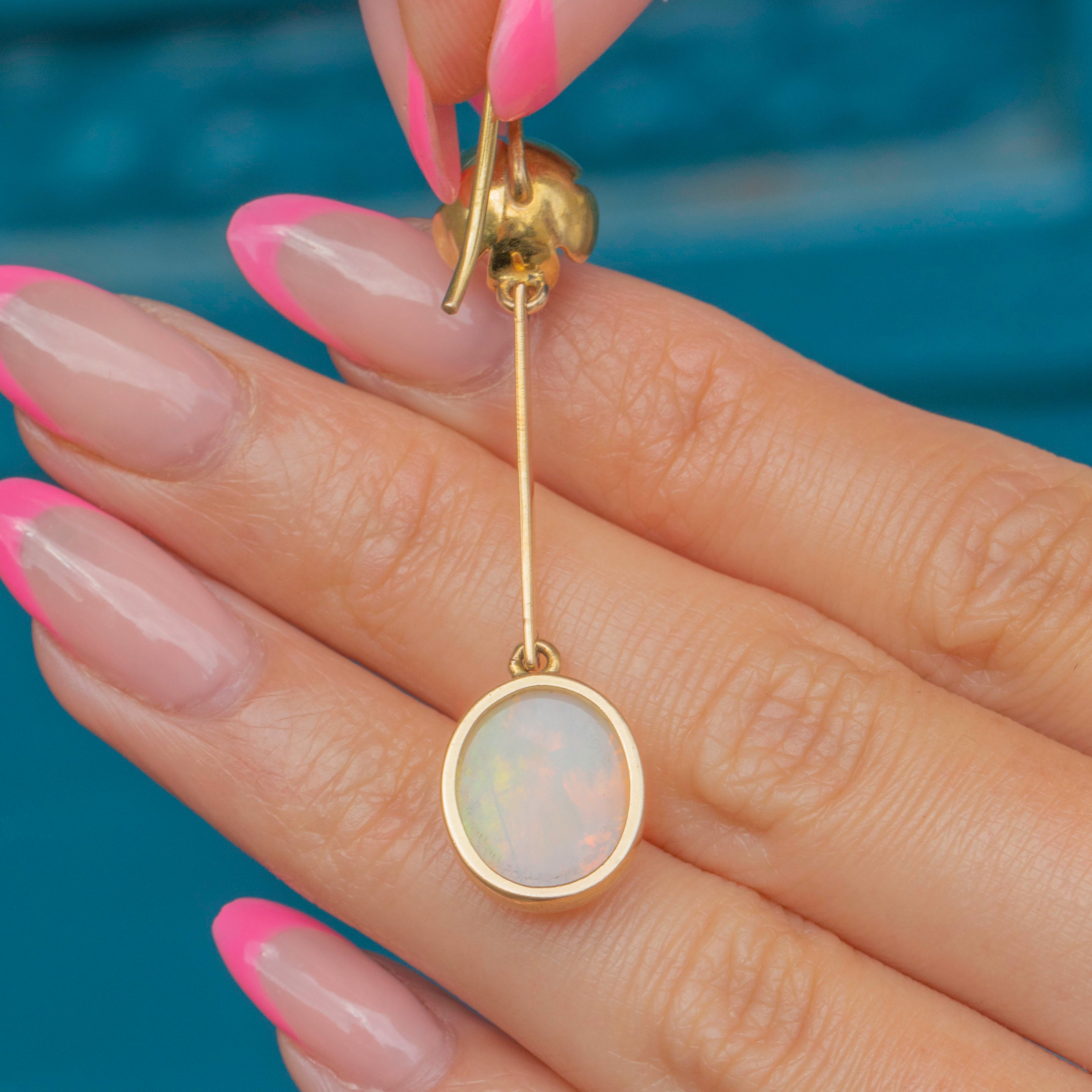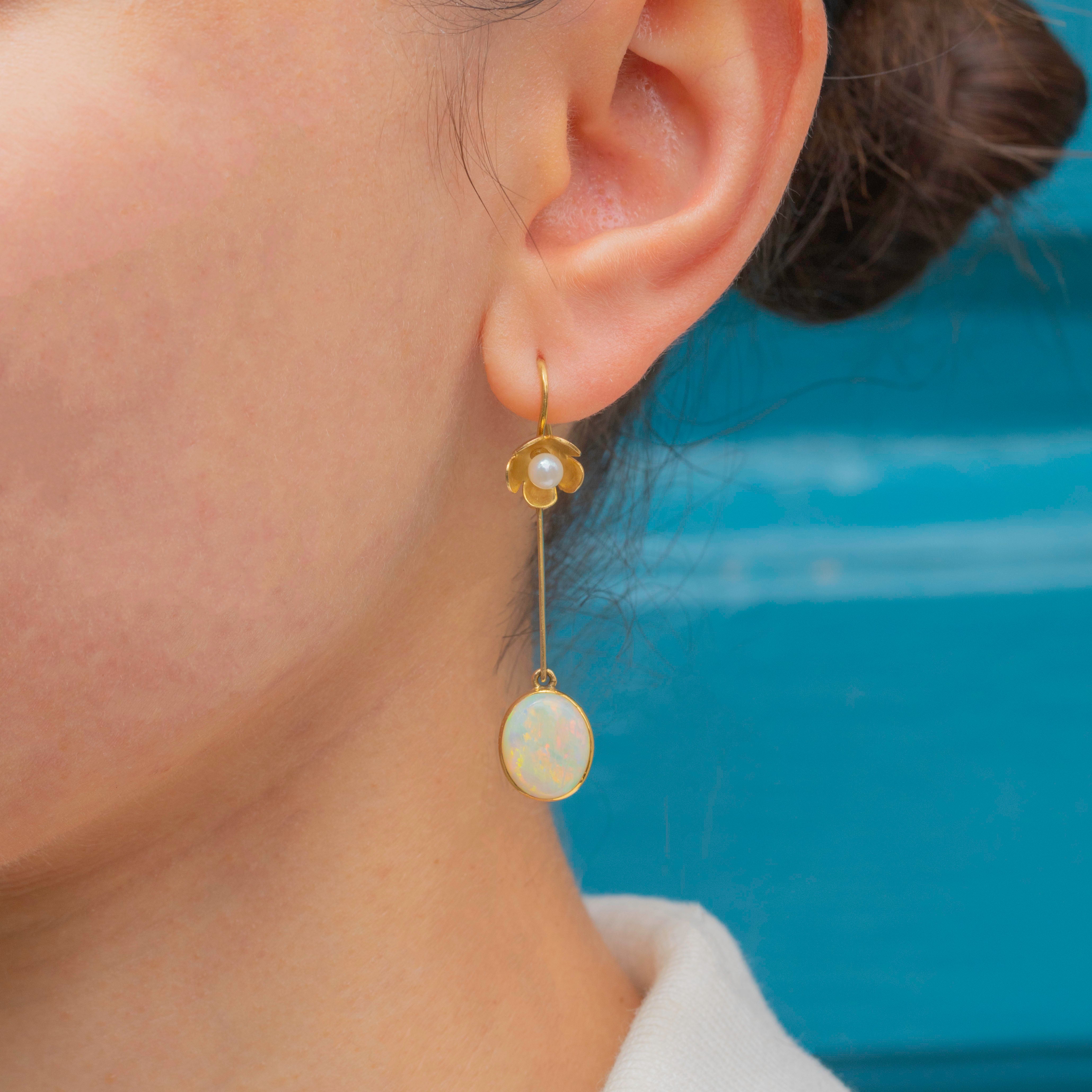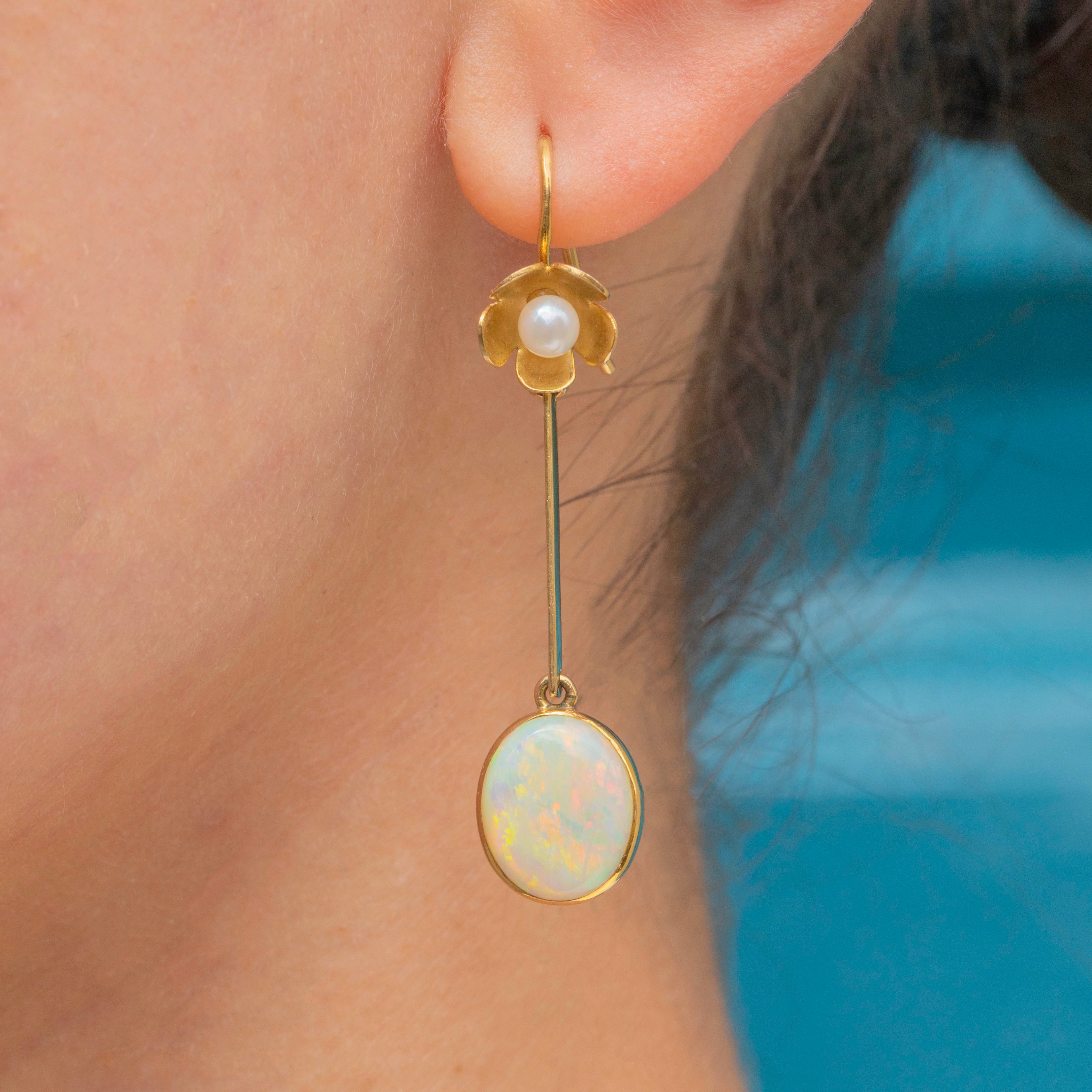 VERY GOOD-EXCELLENT: These vintage Opal and Pearl floral drop earrings are in great condition. Each Opal and Pearl is radiant, and free from any evident signs of wear. There are small spots of discolouration to the Gold, though this is difficult to spot without a loupe. With securely attached hooks, these drop earrings can be worn with confidence.