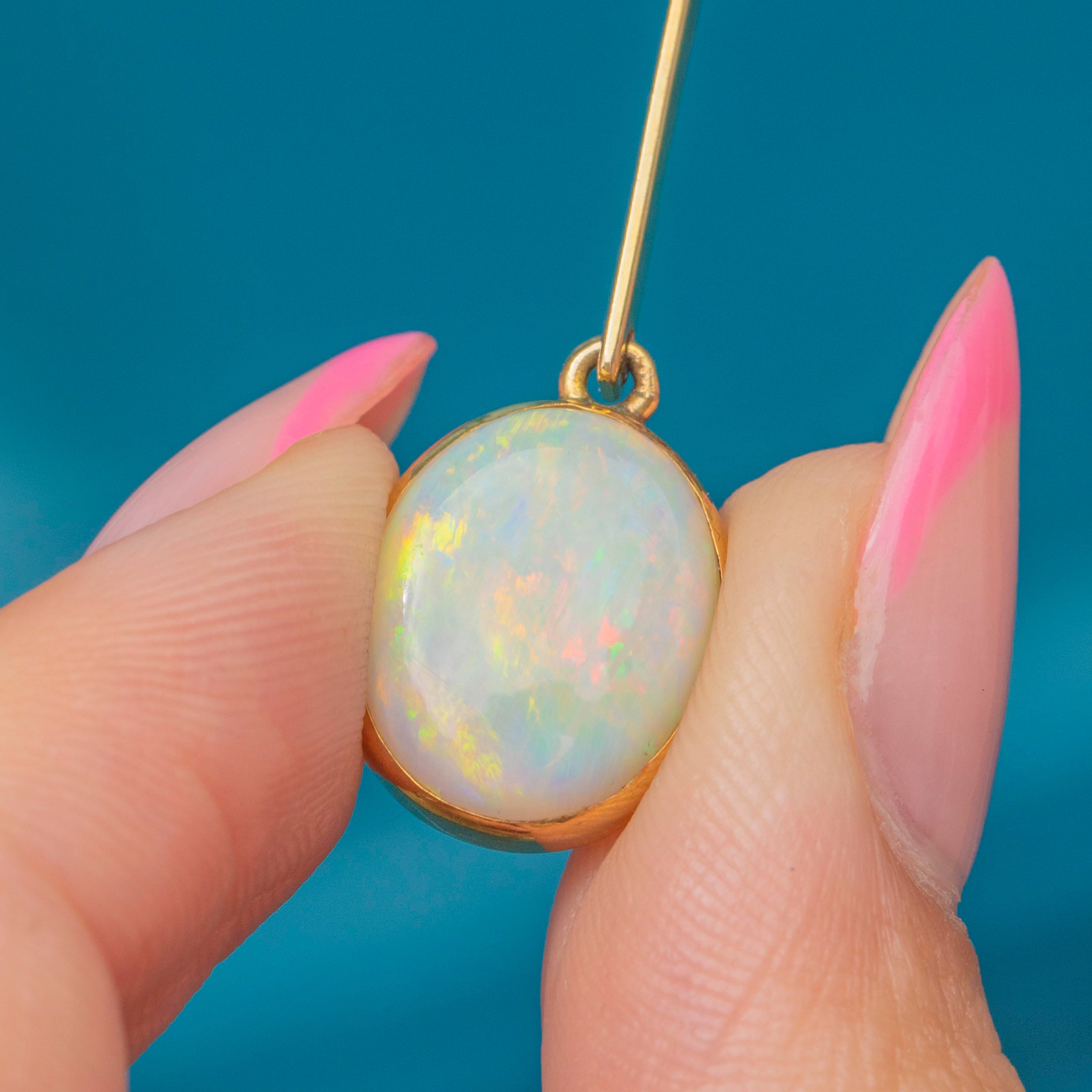 Crafted from buttery 9ct Gold, these whimsical drop earrings each suspend a plump oval Opal, catching the light beautifully and radiating a kaleidoscope of vibrant blues greens and orange.