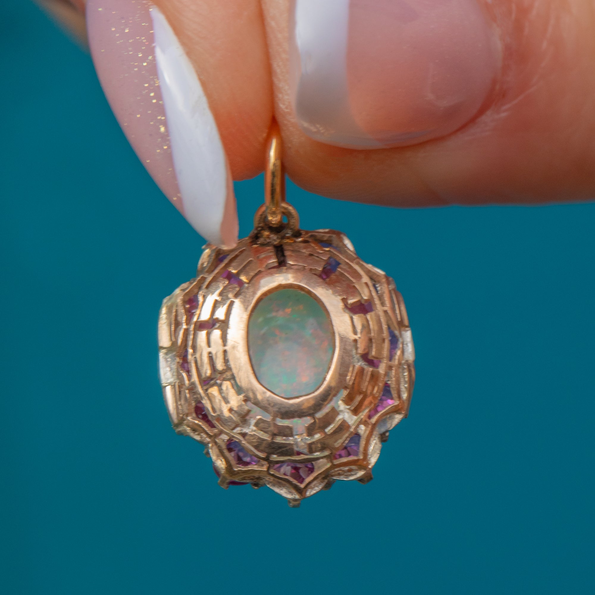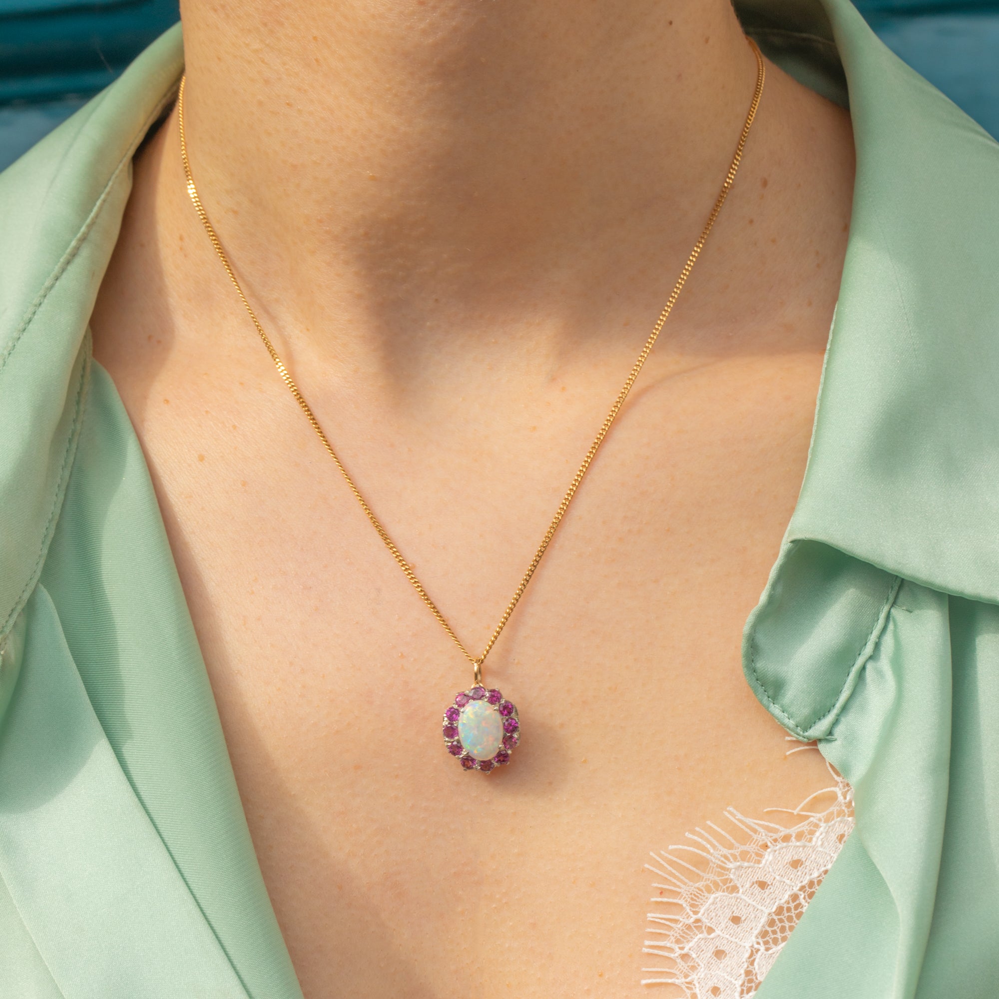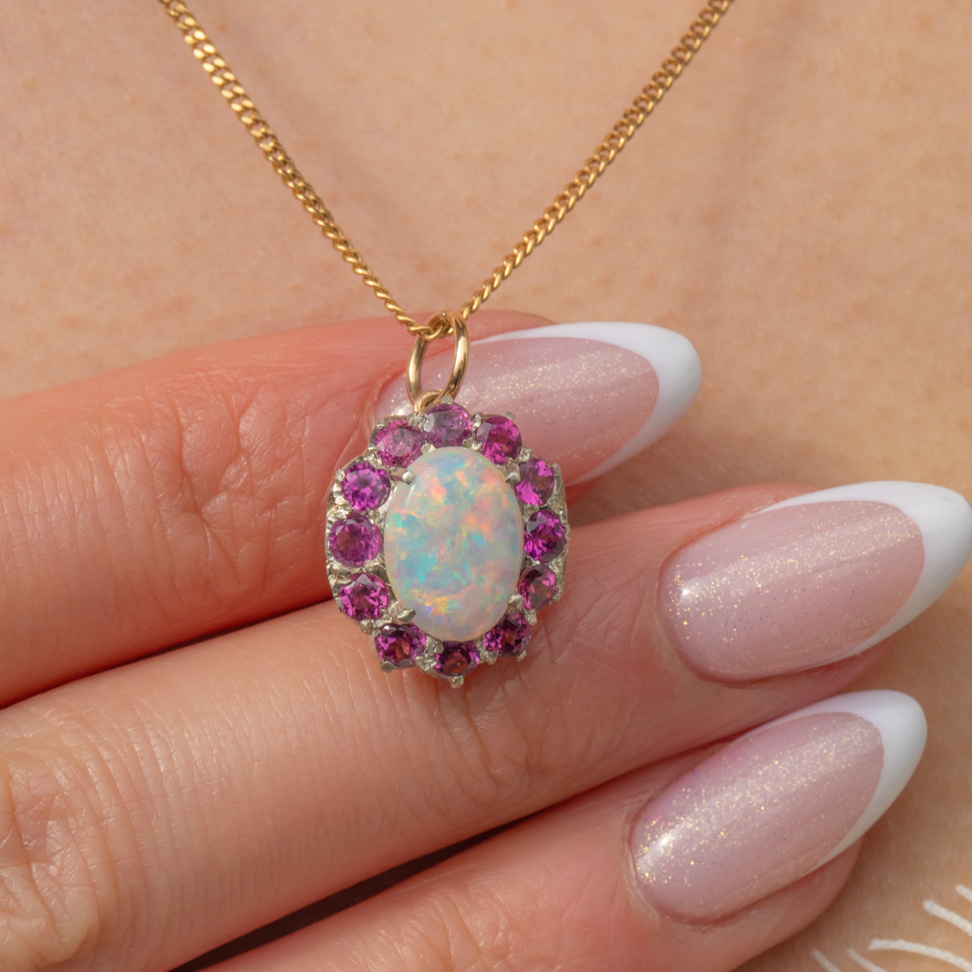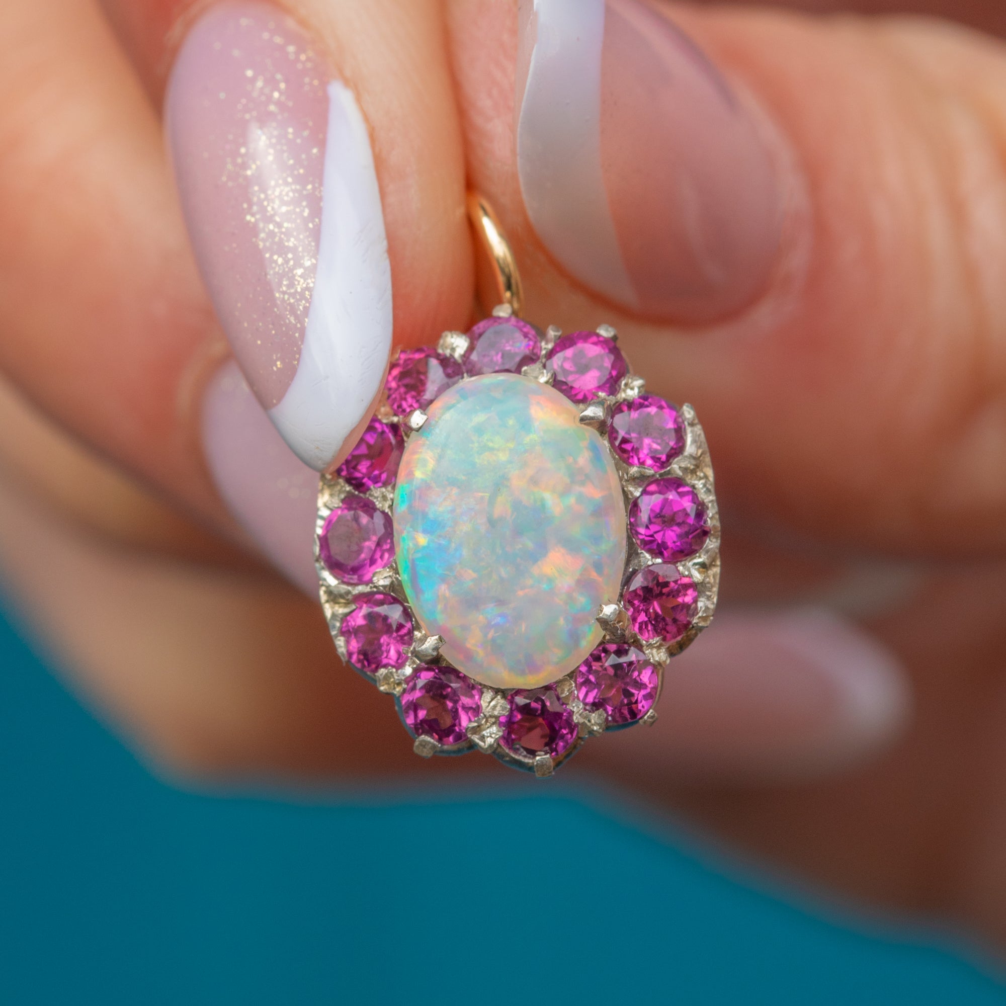 This gorgeous 9ct Gold Opal Rhodolite Garnet cluster charm will bring a vibrant pop of colour to your décolletage! Exquisitely crafted, this charming 1920's Art Deco pendant displays a kaleidoscopic 0.78ct Opal cabochon haloed by bright fuschia Rhodolite Garnets.