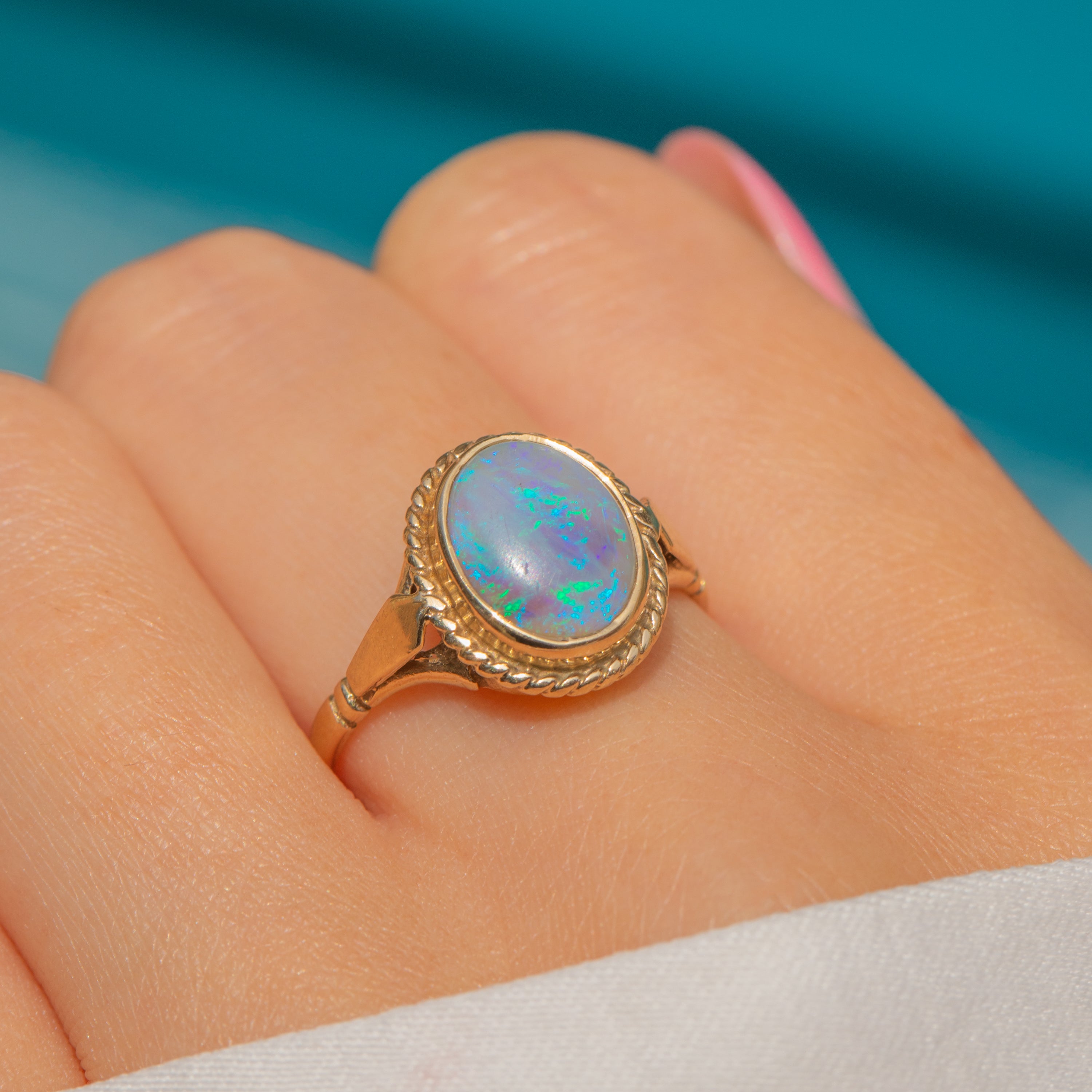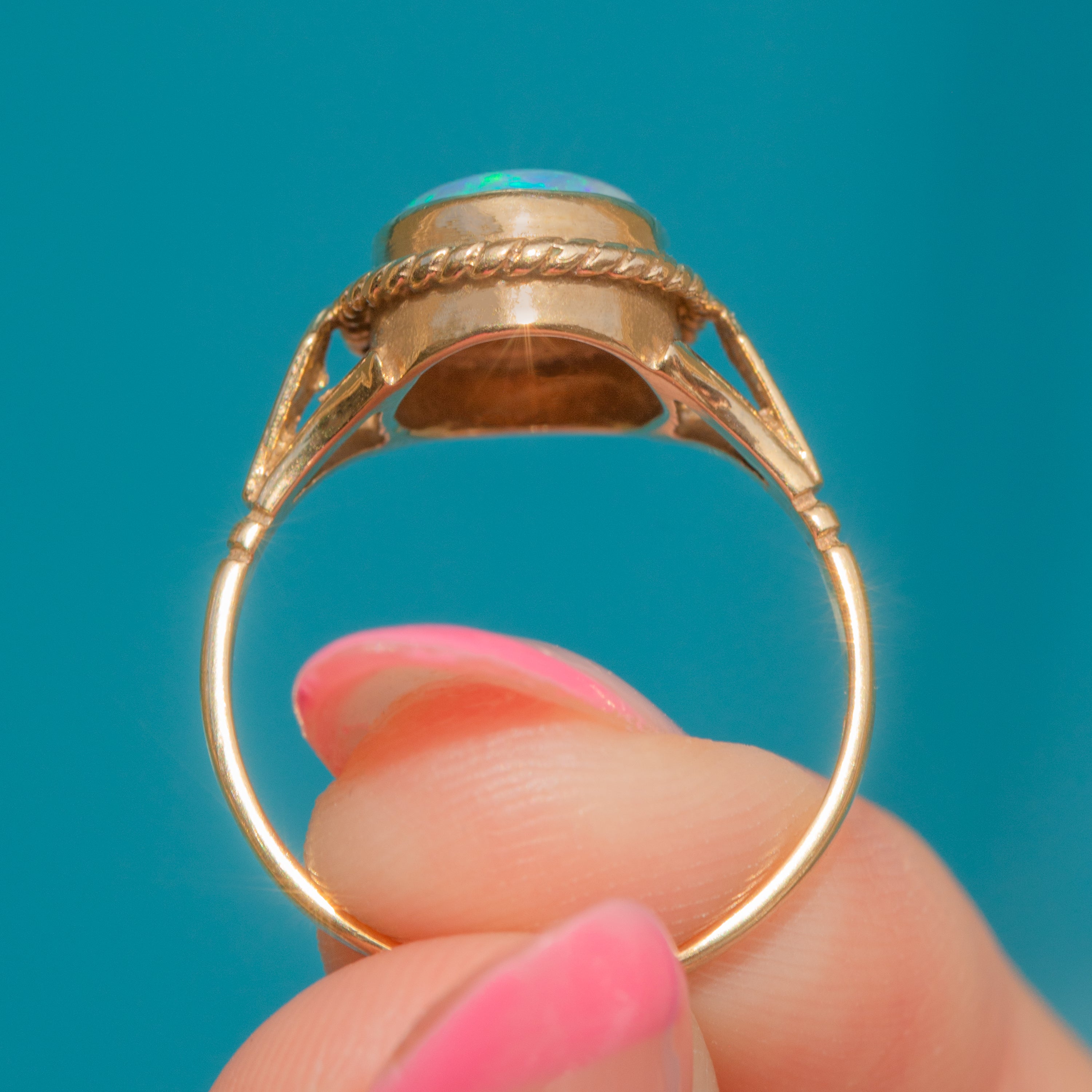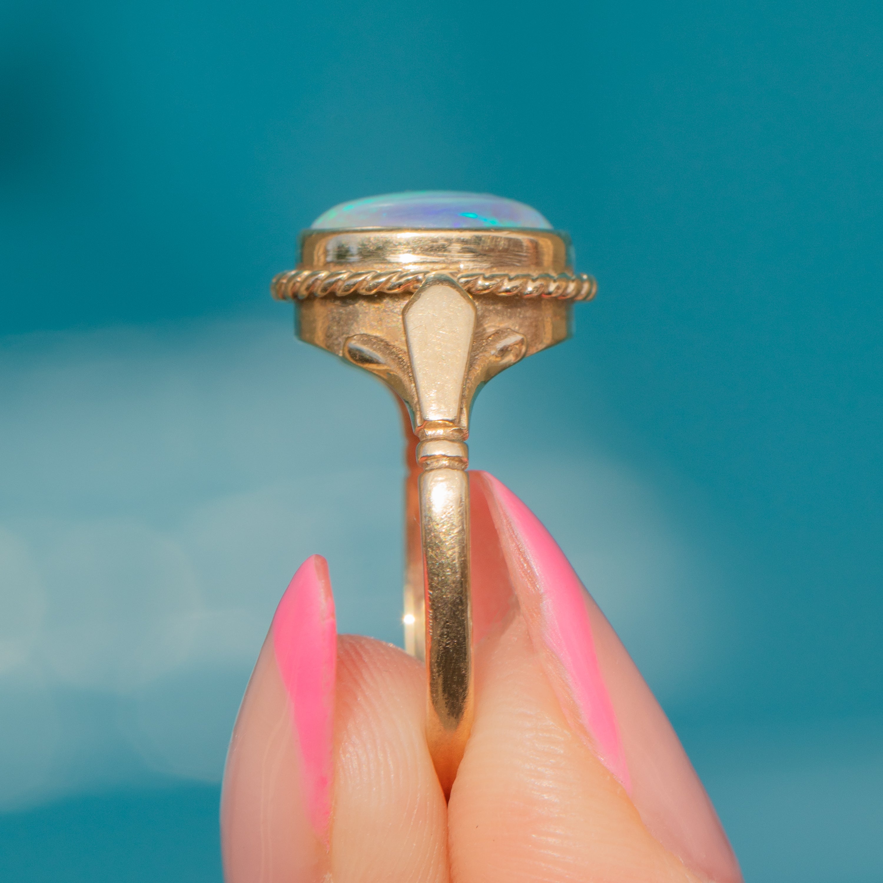The Opal is embraced by a buttery 9ct Gold bezel, adorned by a twisted rope border for a striking finish. This large Opal ring