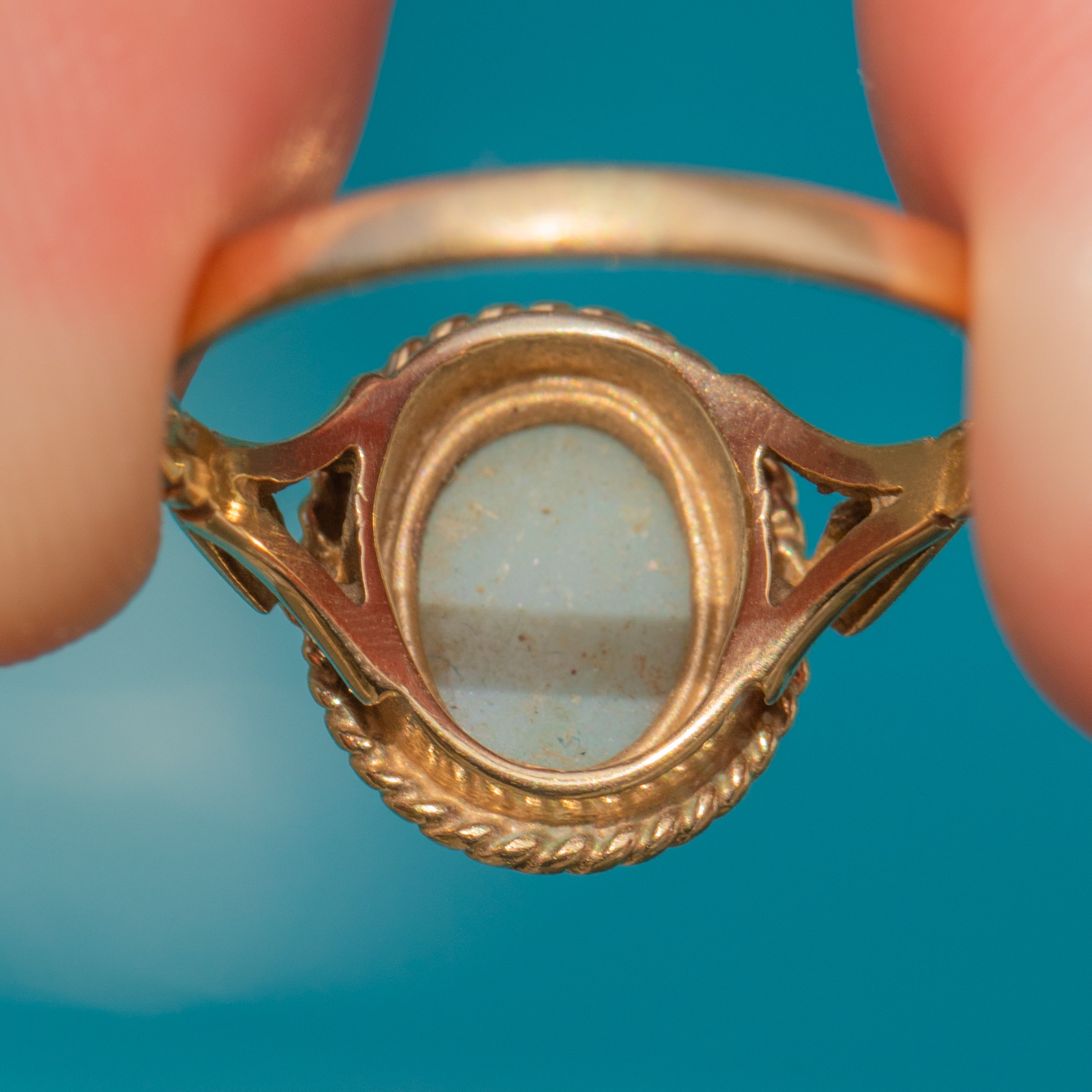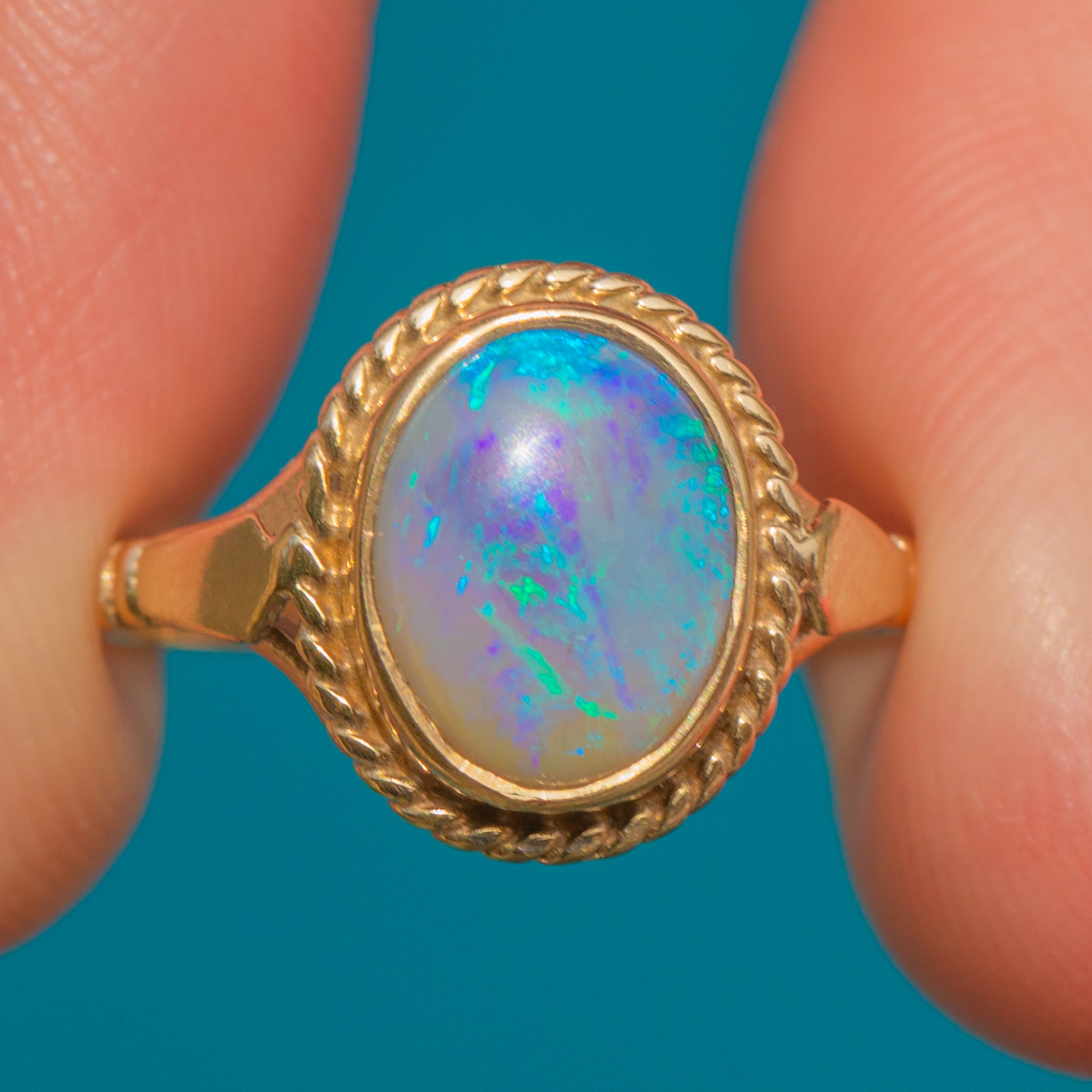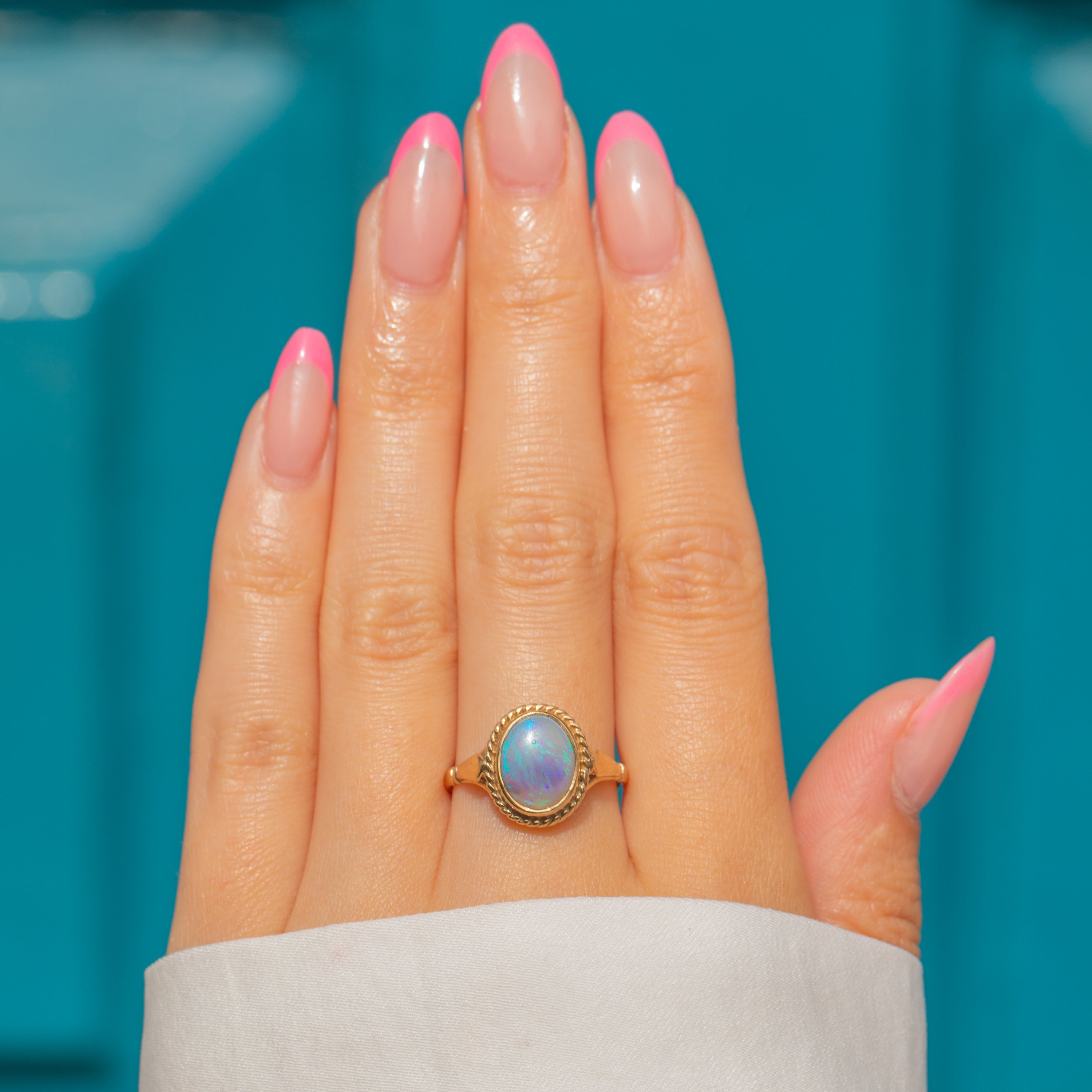 The Opal is embraced by a buttery 9ct Gold bezel, adorned by a twisted rope border for a striking finish. This large Opal ring
