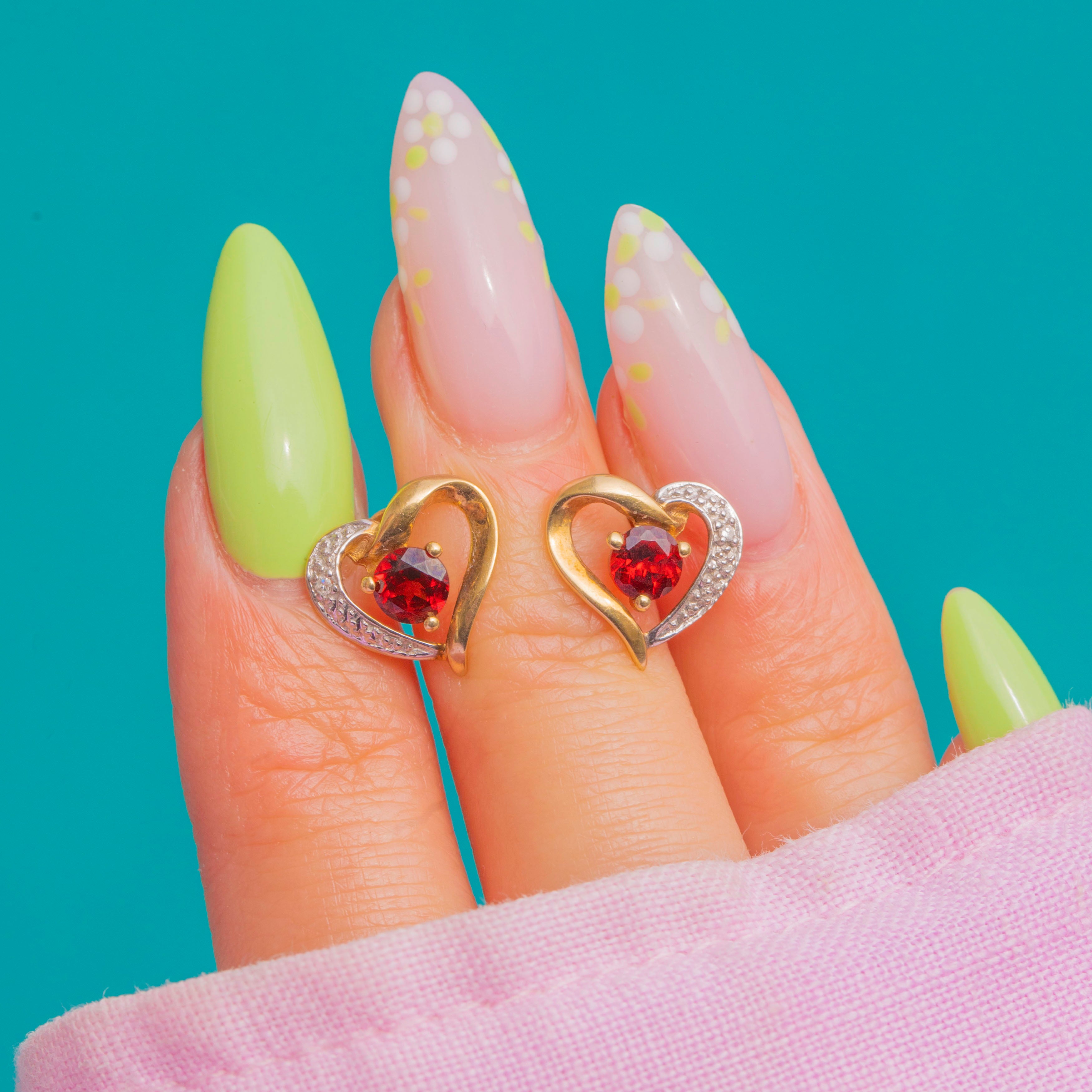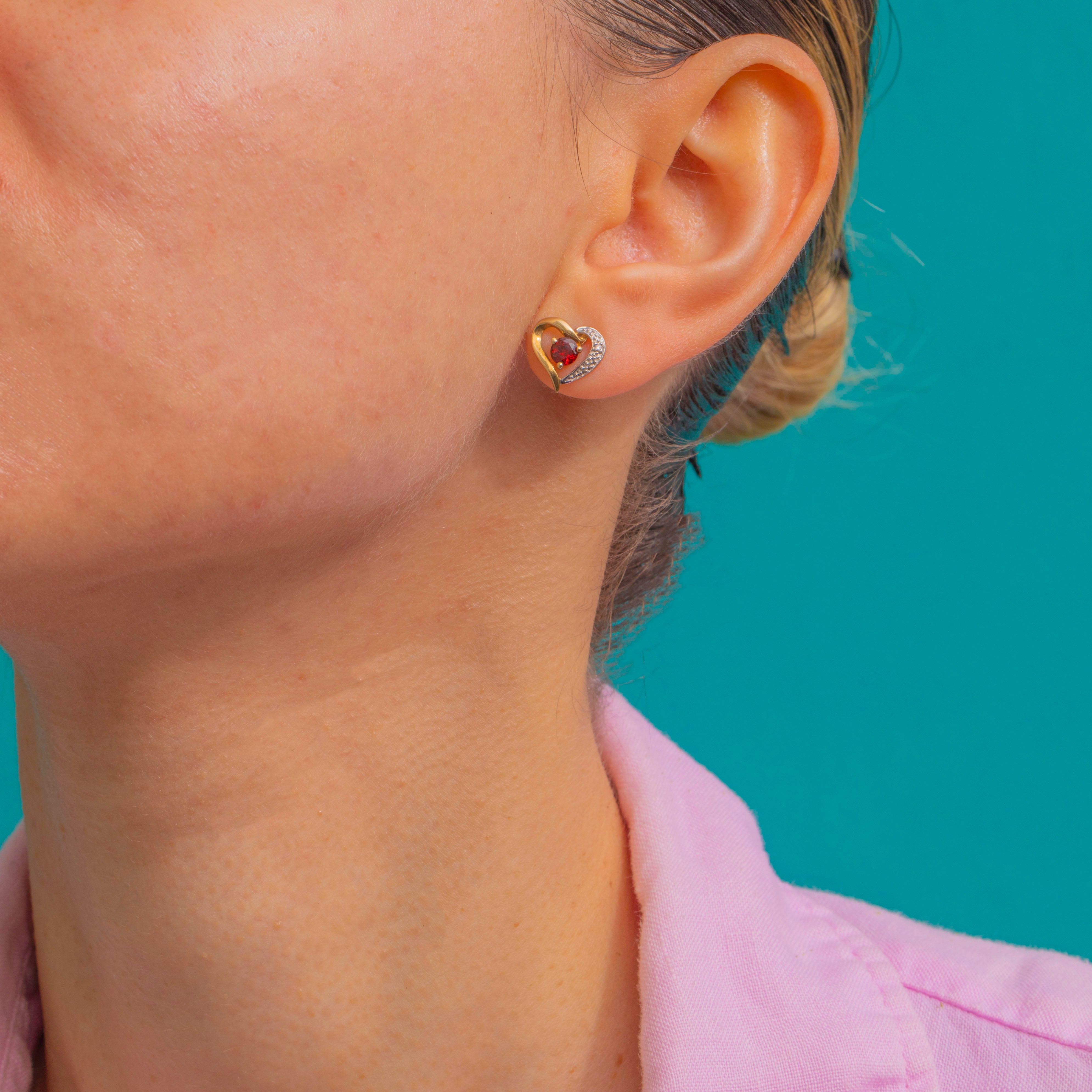 Sweet, sparkling and so easy to wear, these 9ct Gold open-heart studs pair warm Gold with a luscious Garnet centre and a sweep of glistening Diamonds. The asymmetric, open silhouette feels romantic yet timeless, with a deep-red focal stone poised in a neat three-prong setting and a ribbon of tiny Diamonds adding a flash of white sparkle along one side.