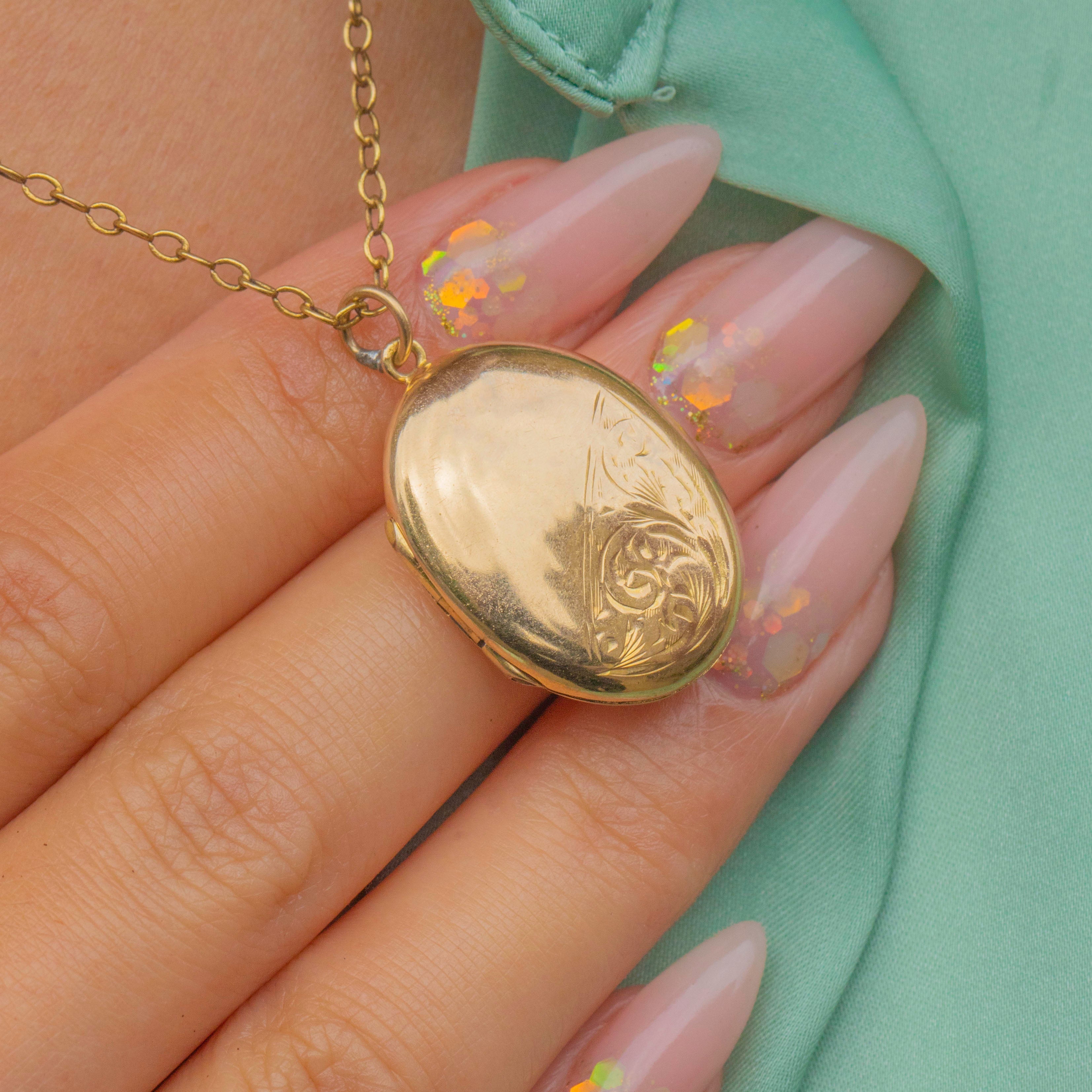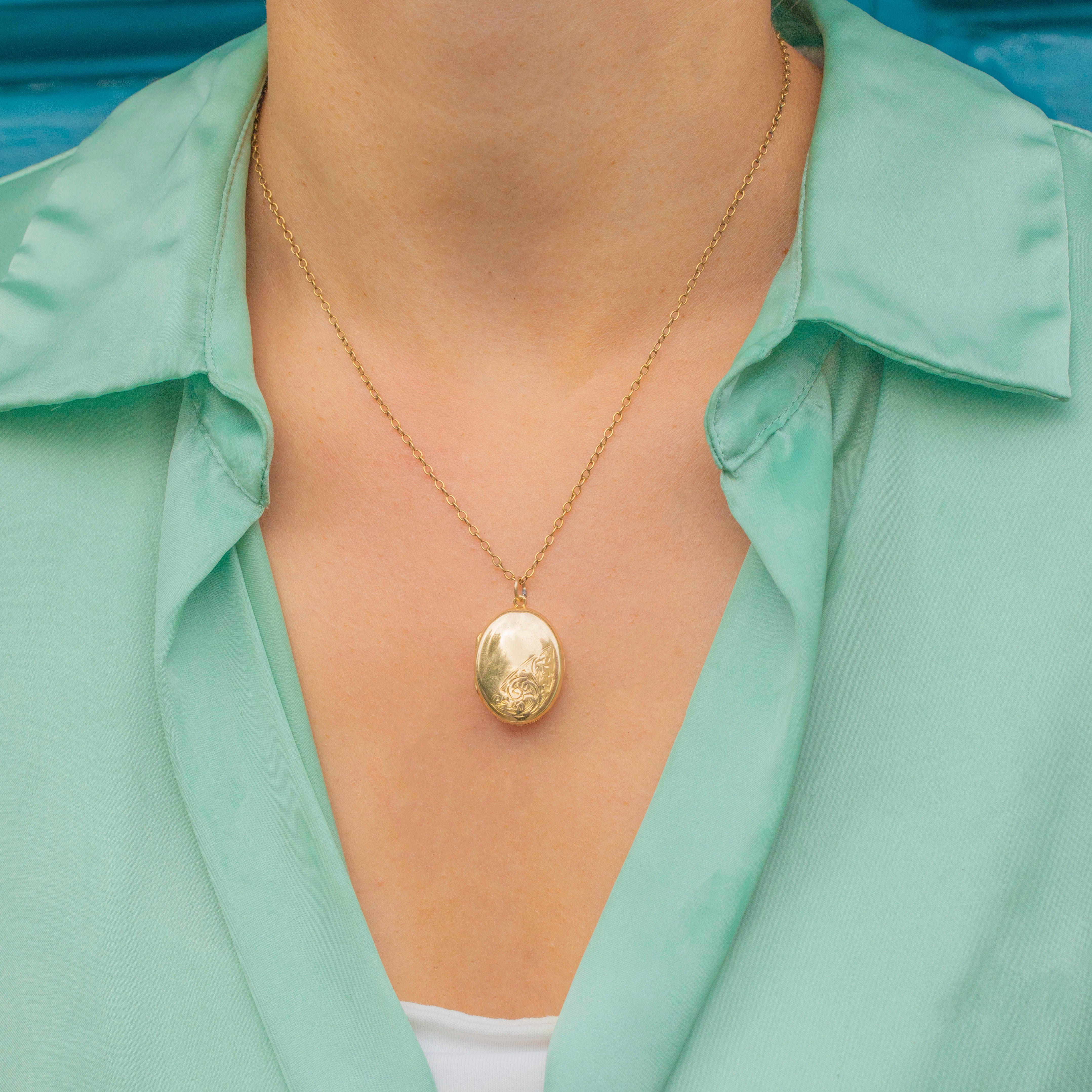 This Edwardian oval locket offers timeless elegance in glowing 9ct Gold. The smooth front is embellished with a delicate flourish of hand engraving, balancing the simplicity of polished Gold with decorative charm. Inside, it opens to reveal two compartments ready to hold cherished photographs or mementos.