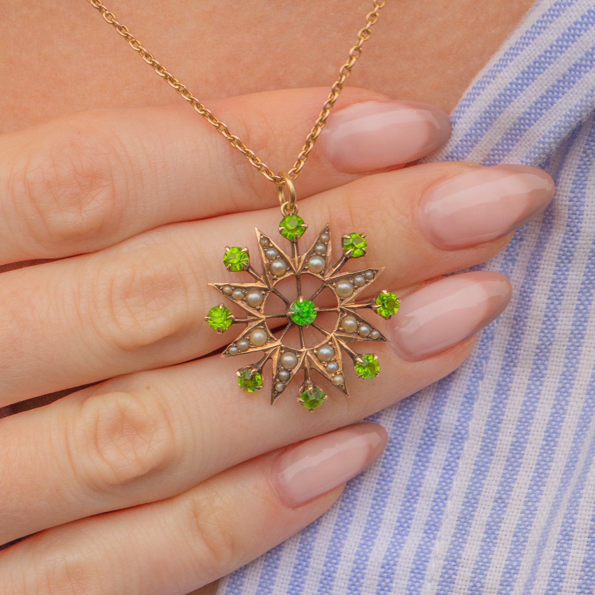 Featuring a gorgeous intricate star design, this Edwardian pendant is comprised of lustrous graduating natural Pearls, accented by vibrant green Paste stones. The pendant radiates timeless elegance, with each stone beautifully set to enhance the piece’s brilliance and accentuate the lustrous beauty of the Pearls and Paste.