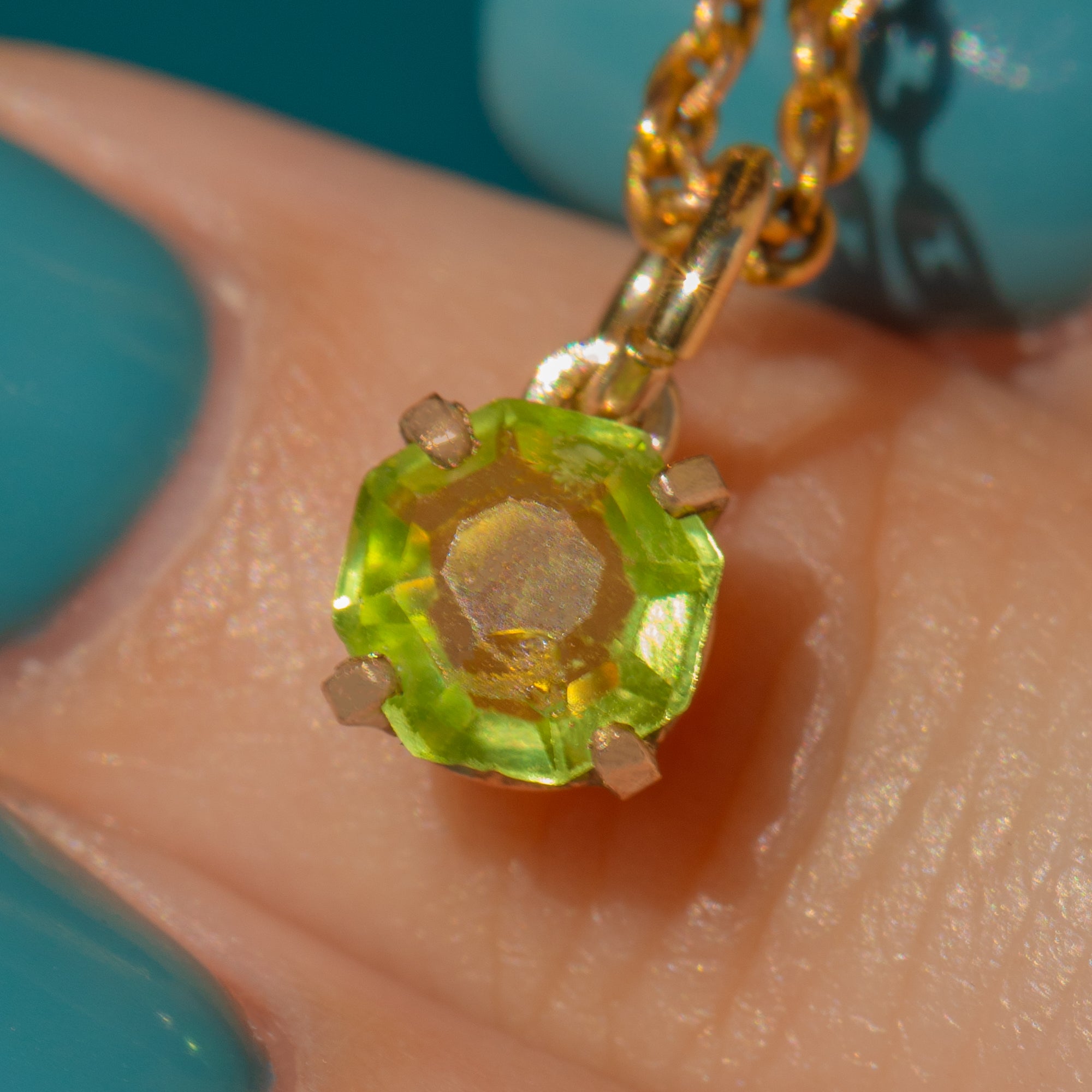 Add some zest to your repertoire with this 9ct Gold Peridot charm! With vivid lime hues swimming around the faceted form of her 0.75ct Peridot, she will add a punchy kick to any antique chain you suspend her form.
