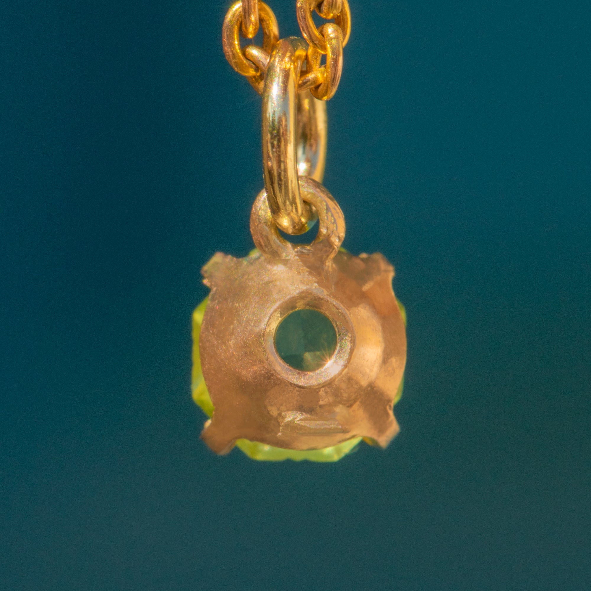 VERY GOOD. This 9ct Gold Peridot charm is in very good condition! The Peridot sits securely within the claw settings and her colour remains vivid throughout. On the bottom of the table, she has a small nick, however, it is small enough that it can only be seen under the inspection of a jeweller's loupe. There is some excess Gold at the bottom of the setting however this does not affect her overall beauty. The perfect fruity addition to any antique jewellery collection!