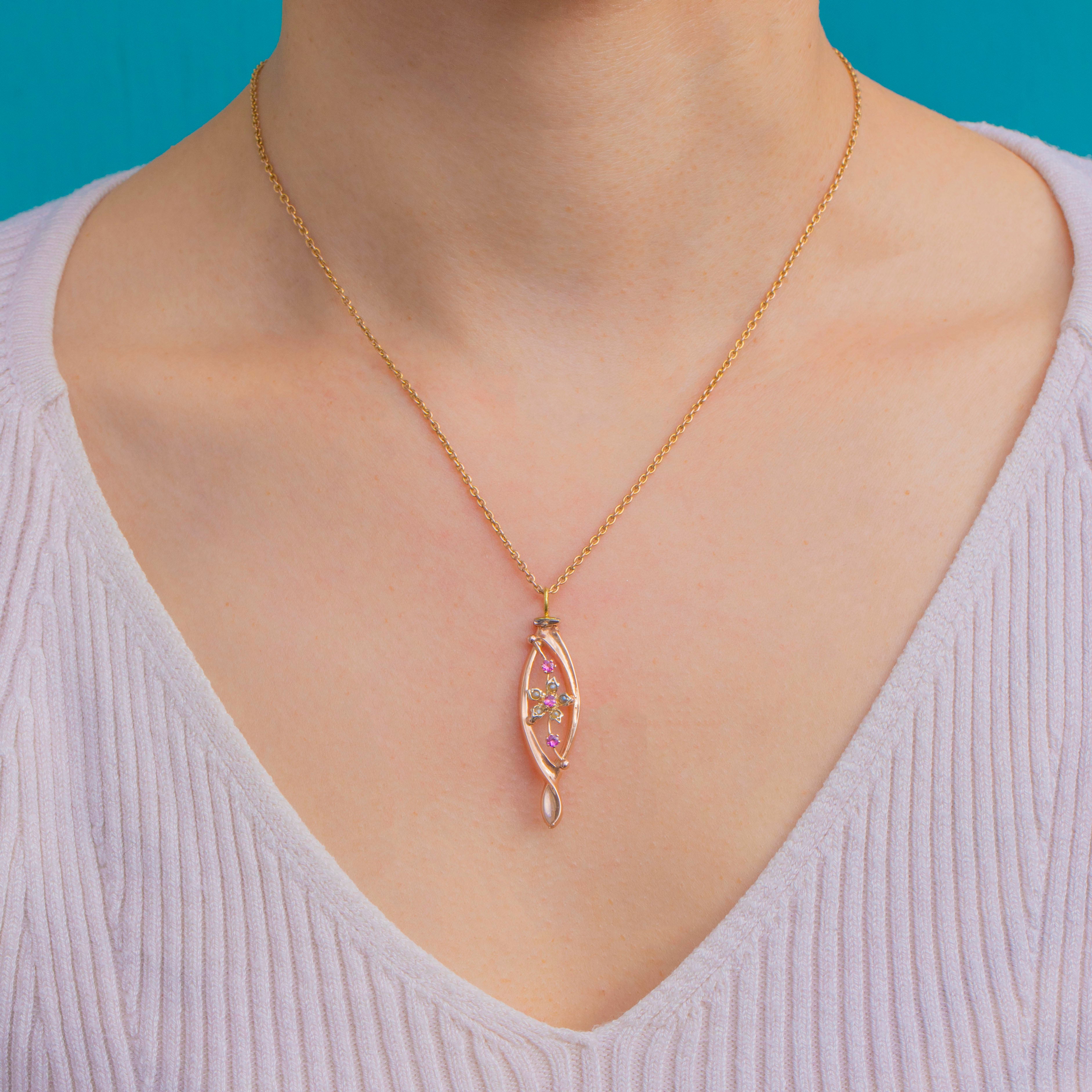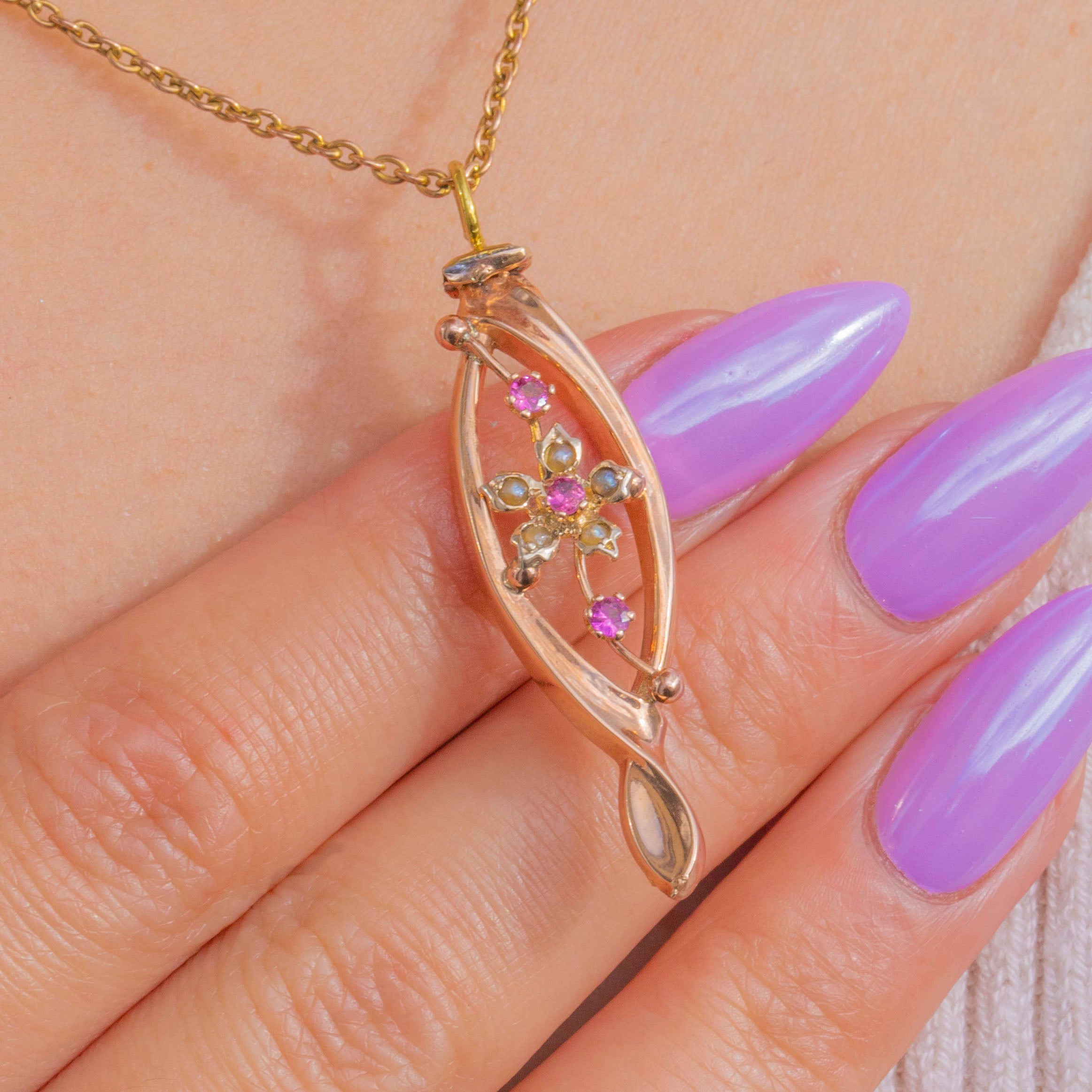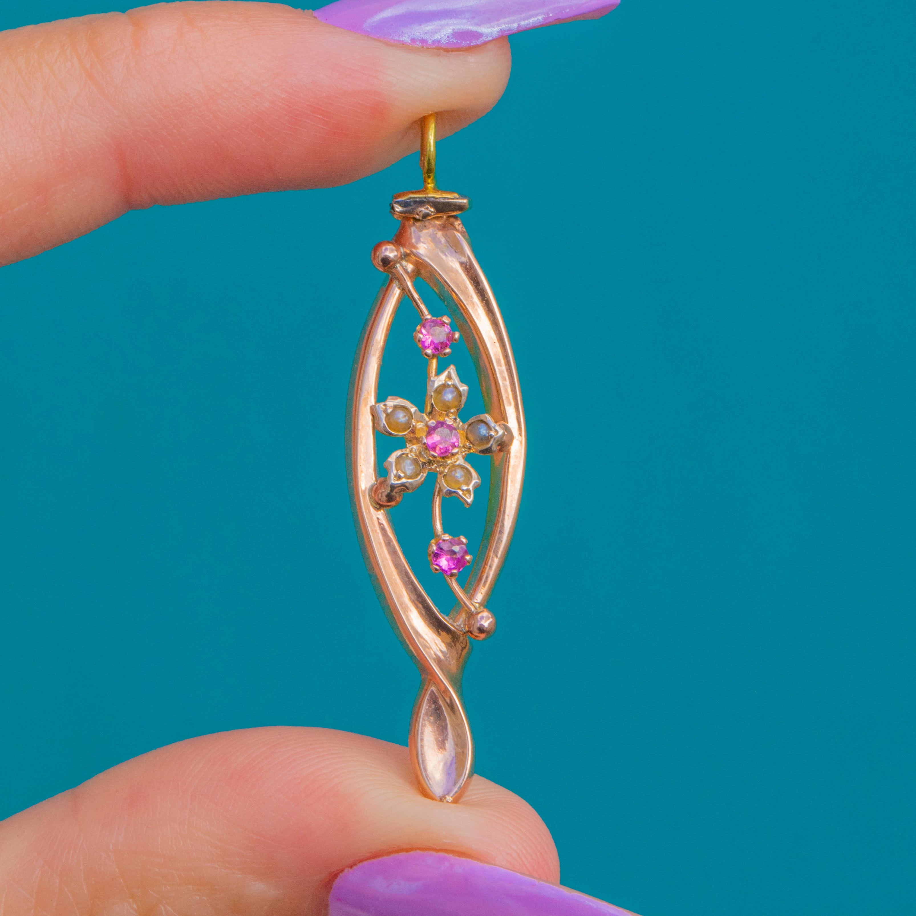 A dreamy Edwardian treasure, this 9ct Gold pendant traces an elegant open twist navette, framing a dainty floral spray of vivid pink Garnets and luminous Seed Pearls. The airy openwork and graceful lines let the gemstones dance with the light, while the warm glow of Gold adds soft radiance.