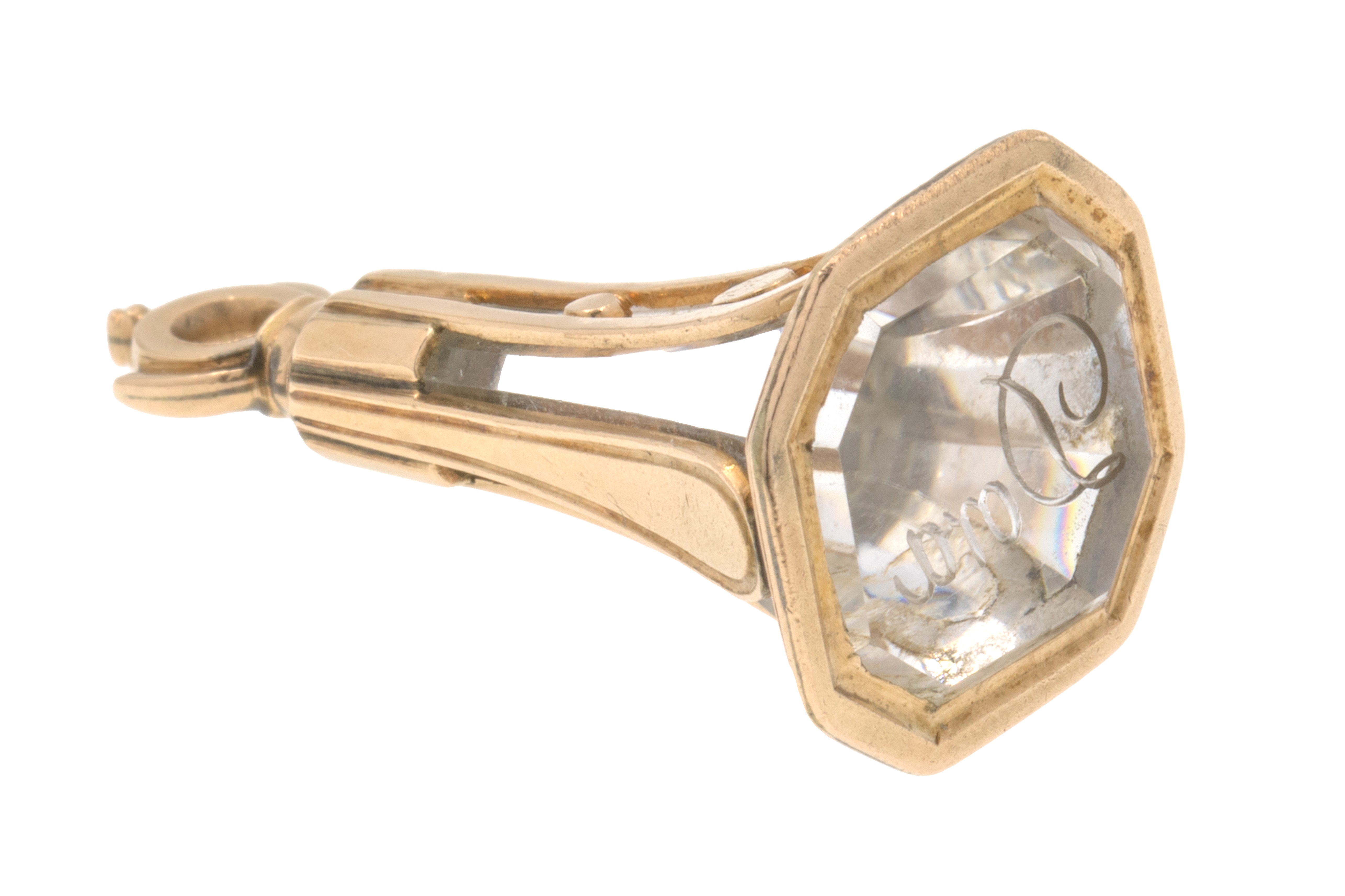VERY GOOD. A 9ct Gold Rock Crystal seal pendant in very good antique condition. Her 9ct Gold has no signs of wear and her sturdy bale allows you to suspend her around your neck from a chain of choice with confidence. The Rock Crystal has the odd light scratch commensurate with age, but nothing untoward. The intaglio is crisp and readable, with no wax caught inside the engraving.