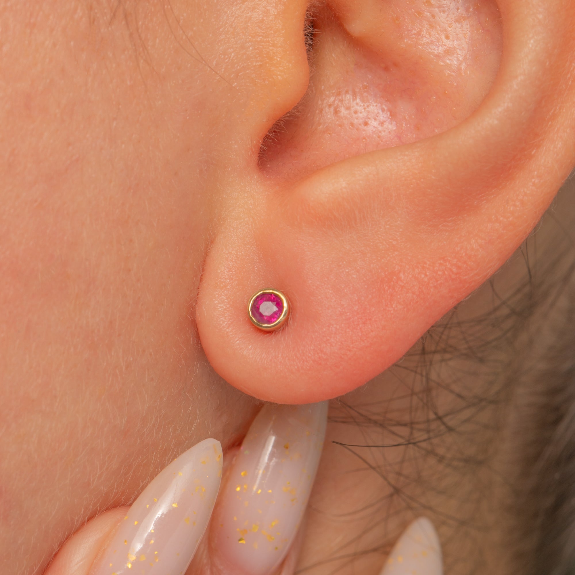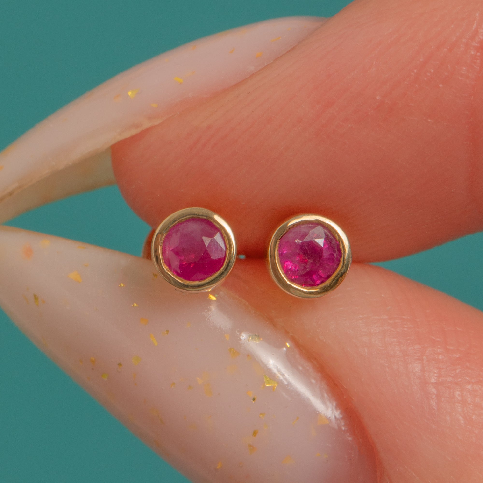 Petite and beautifully refined, these Victorian 9ct Gold Ruby studs deliver a vivid kiss of colour in a smooth, minimalist bezel. Each round Ruby glows a lively pink-red, its facets catching the light against the warm Gold rim for an effortlessly elegant look.