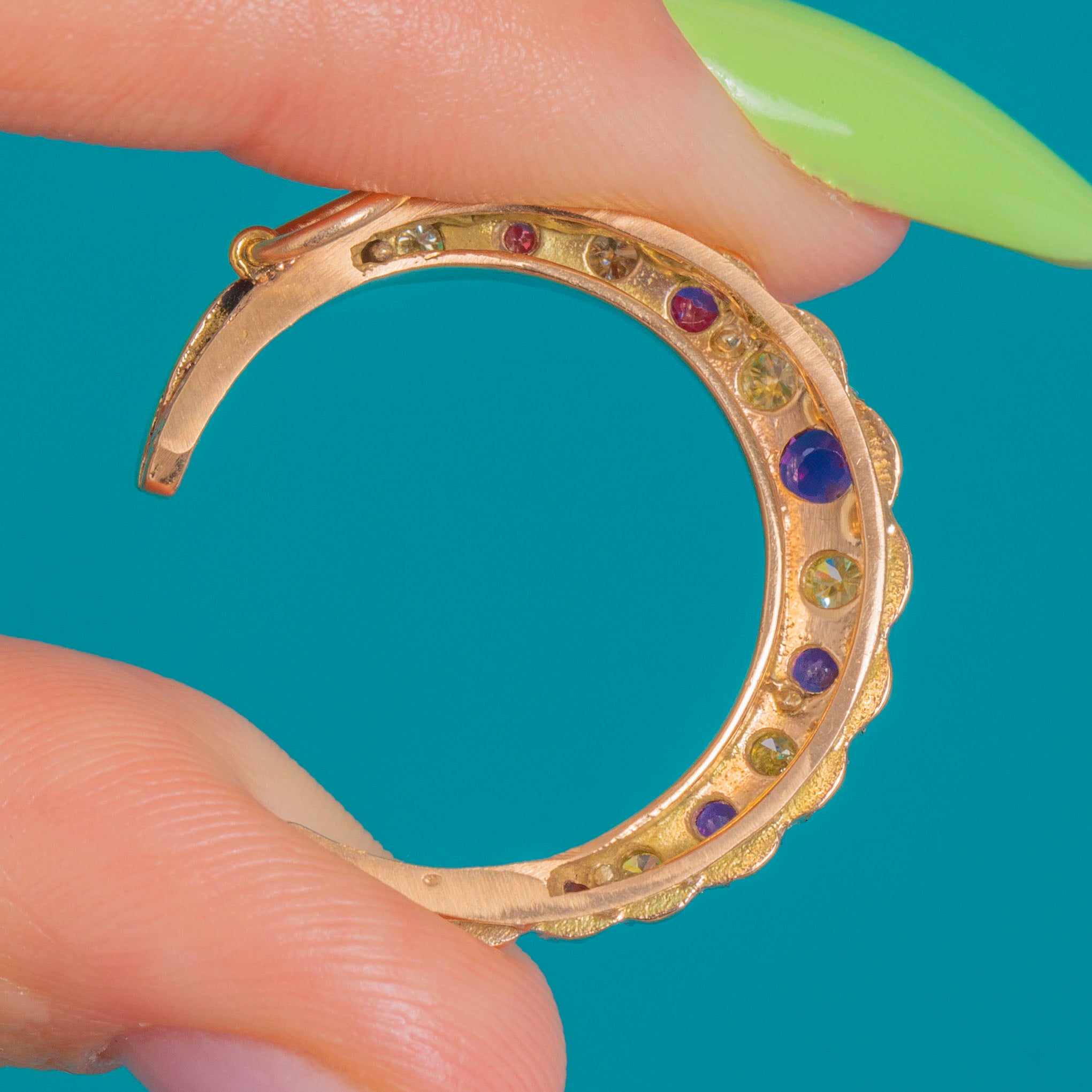 A celestial classic with a chic two‑tone twist, this Vintage crescent moon pendant is crafted in white and yellow 9ct Gold and swept with a glittering arc of Rubies and Diamonds. The gemstones graduate beautifully along the curve, the vivid pink‑red of the Rubies singing against the crisp Diamond sparkle for a look that’s delicate, romantic and refined.