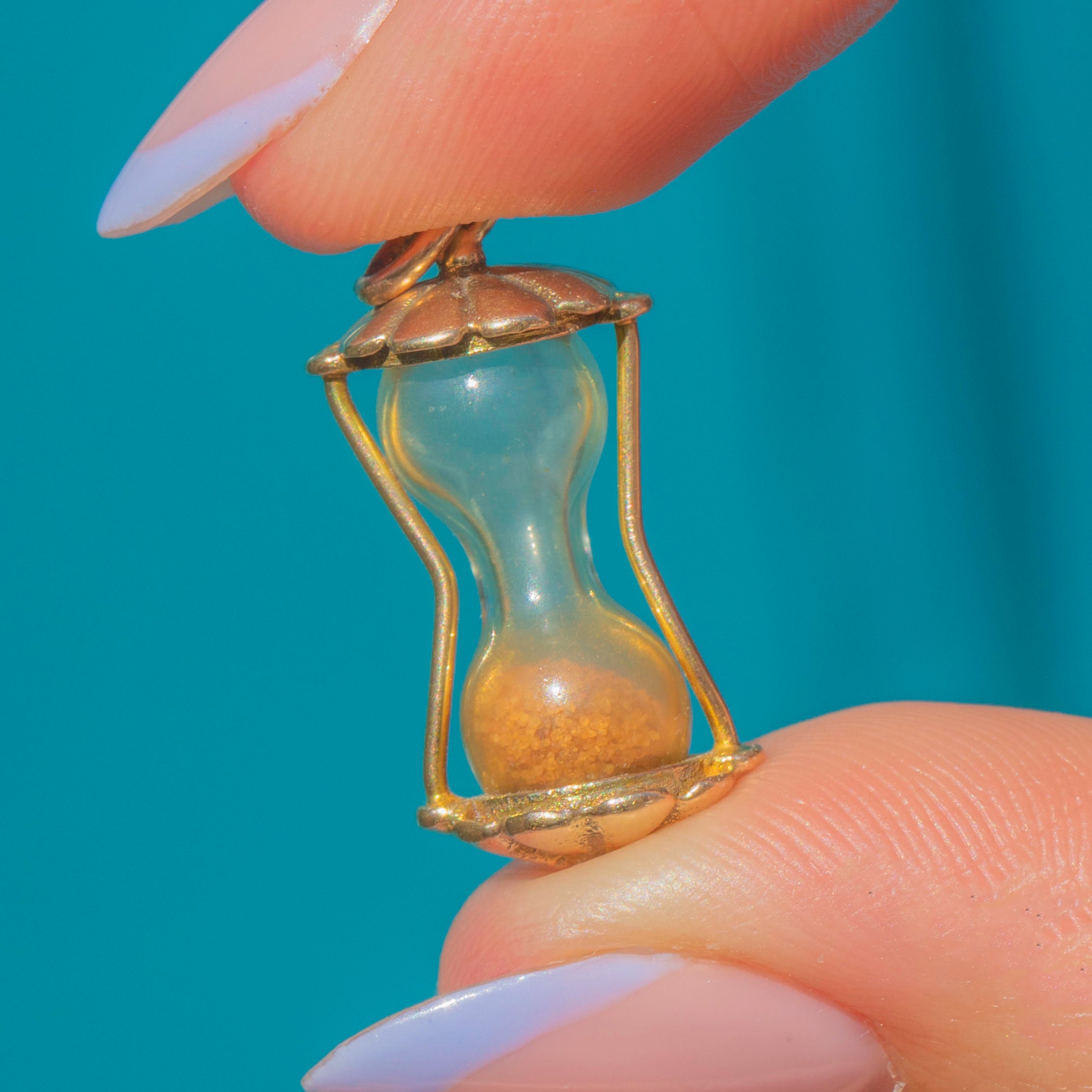 VERY GOOD: This 9ct Gold sand timer charm is in very good condition. She is crafted wonderfully and has a nice glossy finish. There are some signs of wear to the Gold, including some discolouration to the bottom of the charm, and some fleabites to the glass, though this is expected with age. With a secure jump ring, you can wear her with confidence.