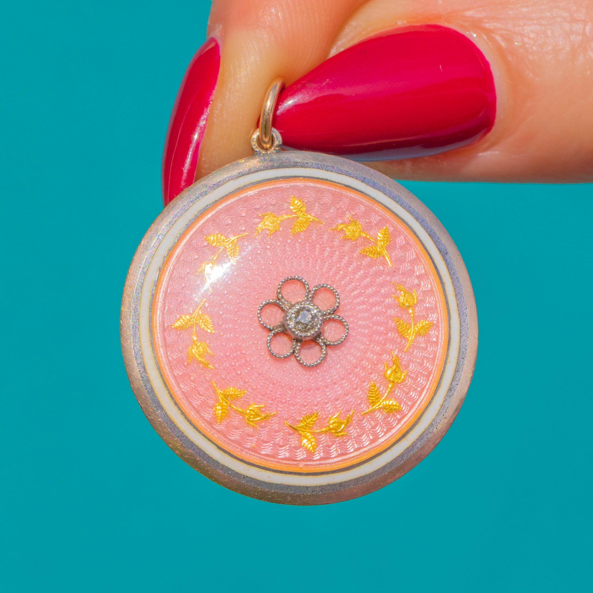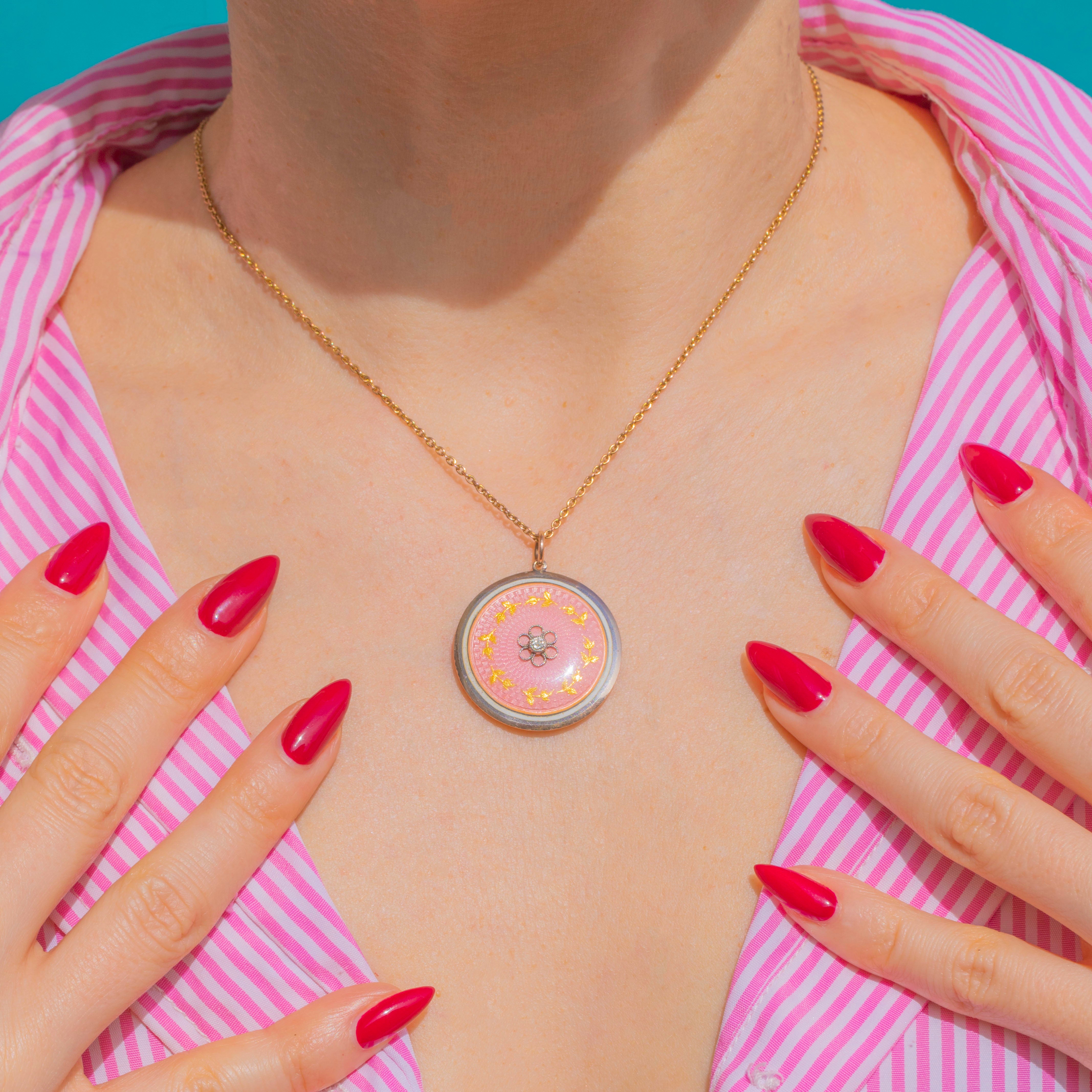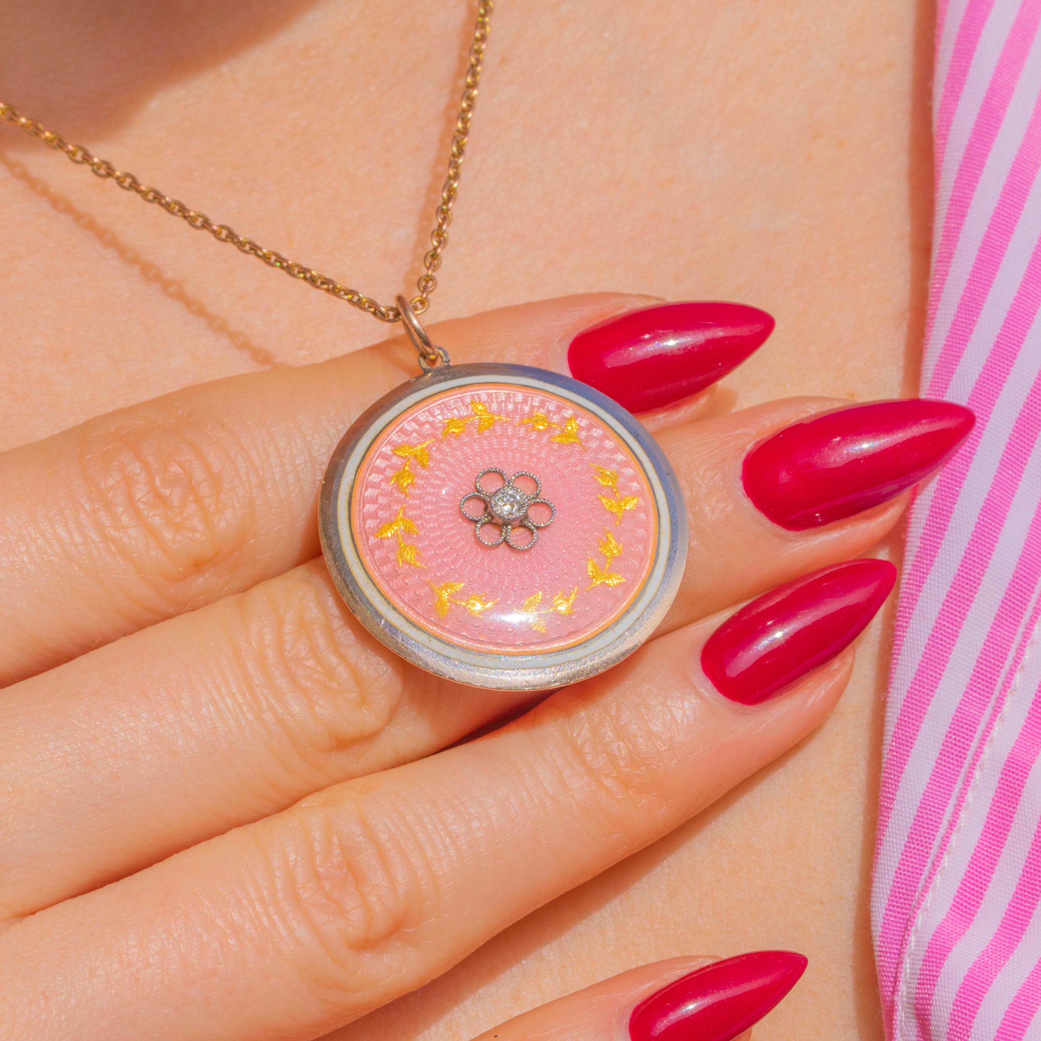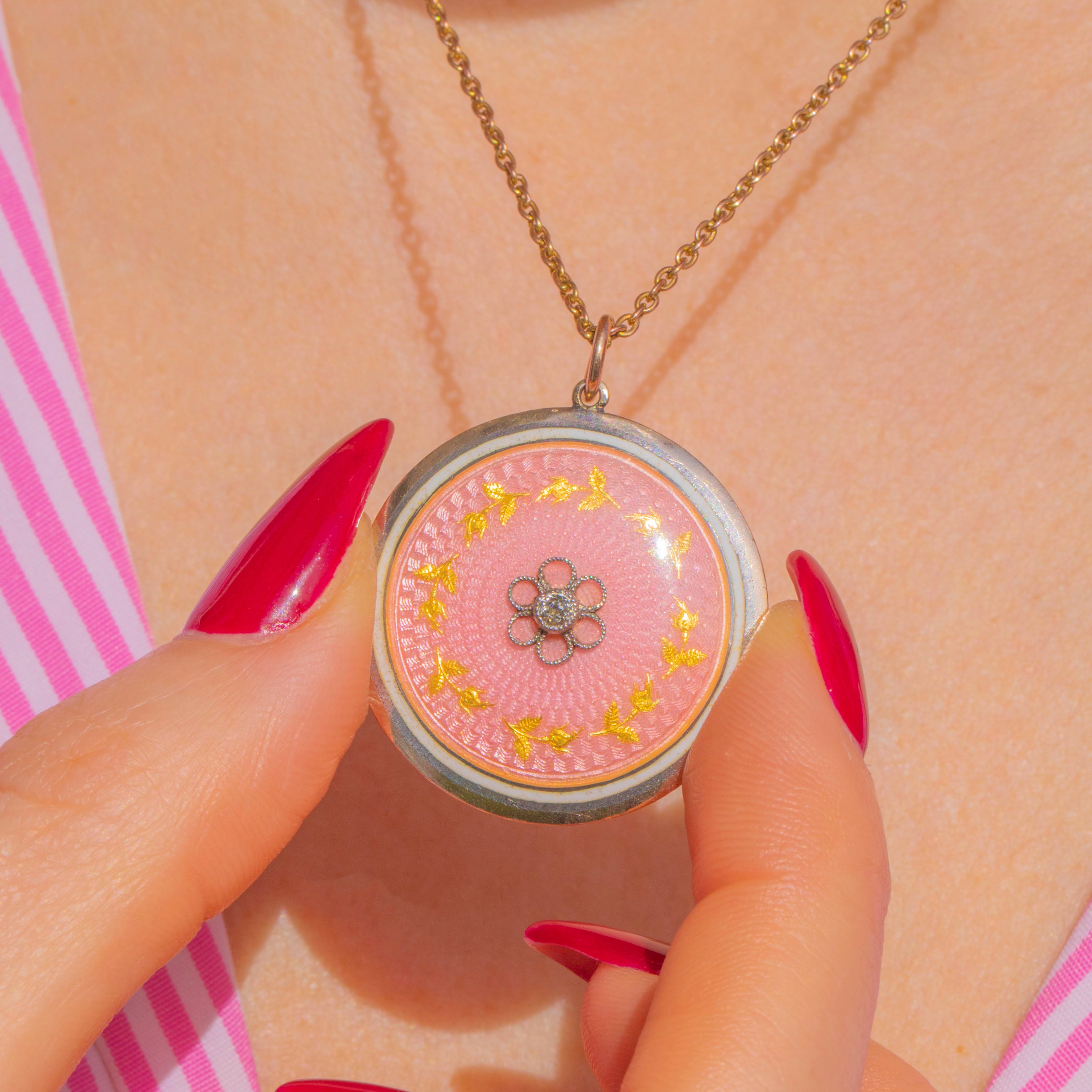 Radiant with Edwardian elegance, this round locket pairs warm 9ct Gold with cool Silver for a refined two‑tone finish. A softly domed panel of blush pink Guilloché Enamel shimmers with engine‑turned details, centred by a petite Diamond set within a floral rosette and encircled by a delicate laurel wreath.