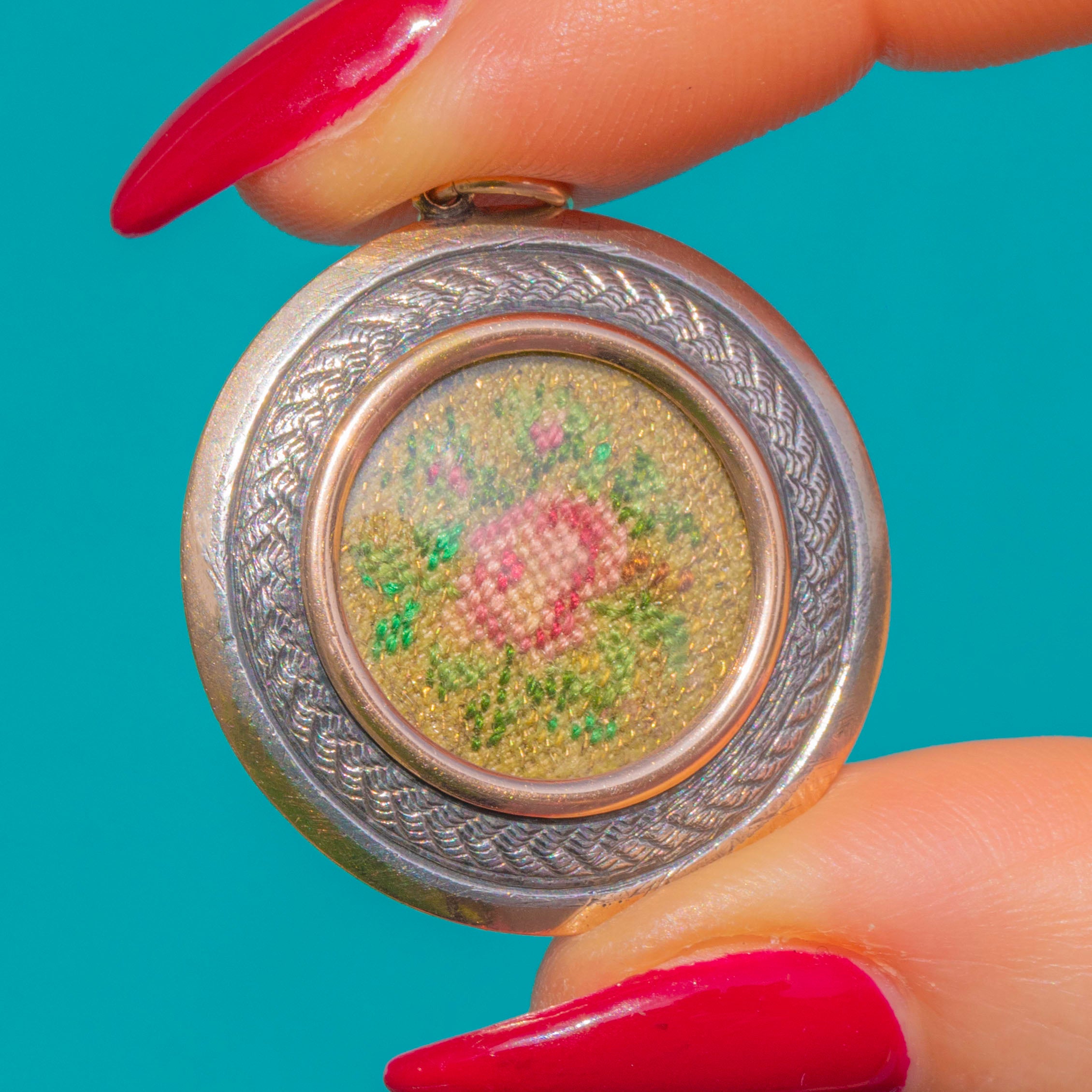 Silver engraved detailing and settings lend crisp contrast to the glow of Gold, while the romantic cross‑stitch rose motif seen beneath glass adds an irresistible, feminine flourish. Exquisite craftsmanship, timeless styling, and a beautifully delicate scale make this a sublime heirloom jewel.