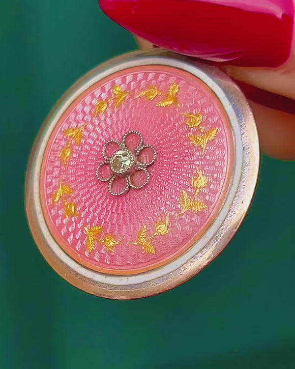 EXCELLENT: The Diamond is bright and secure with no visible chips or abrasions, and the Guilloché Enamel presents glossy and intact without cracks. The Gold and Silver components are in superb order with minimal age-appropriate surface wear and a light, attractive patina; settings are sound.