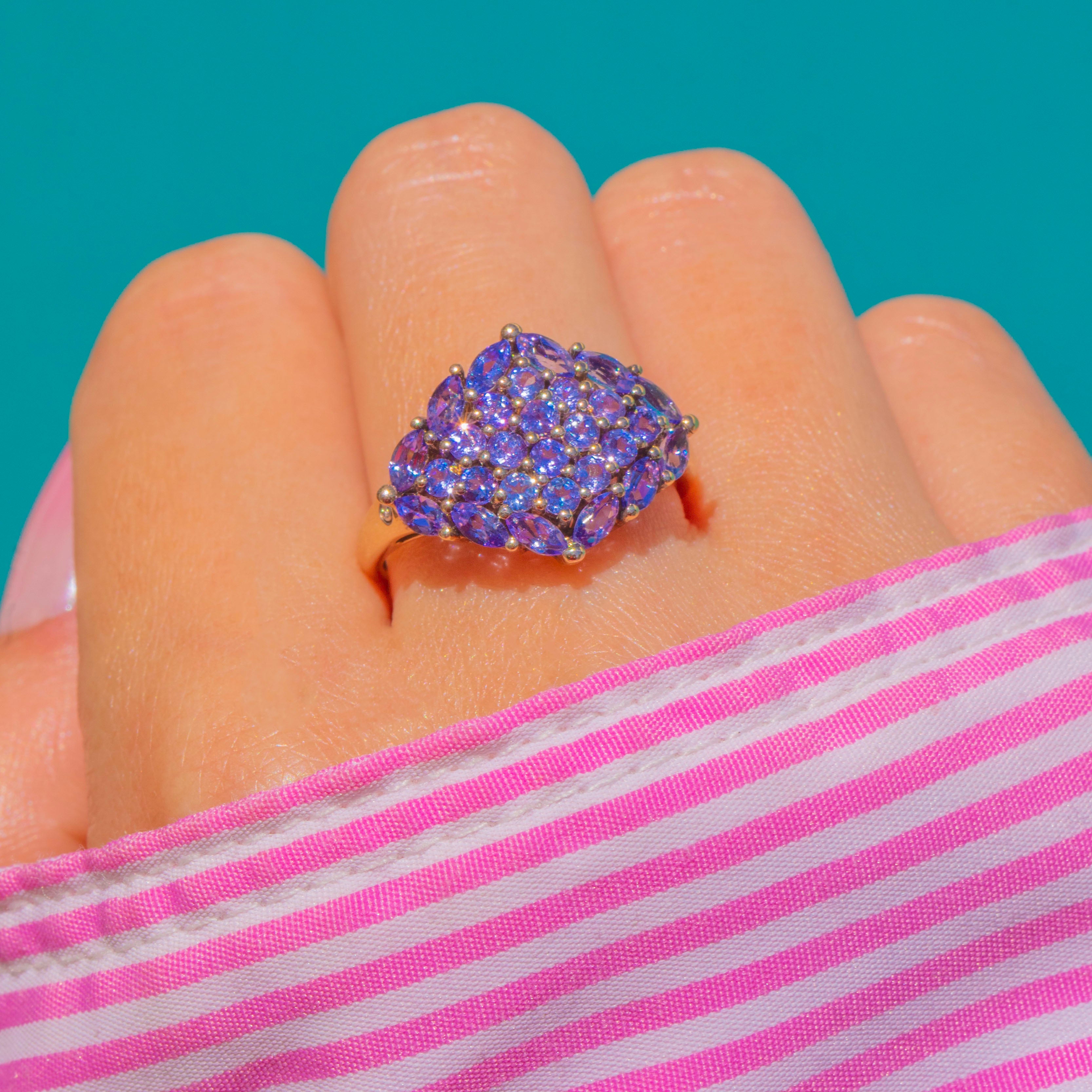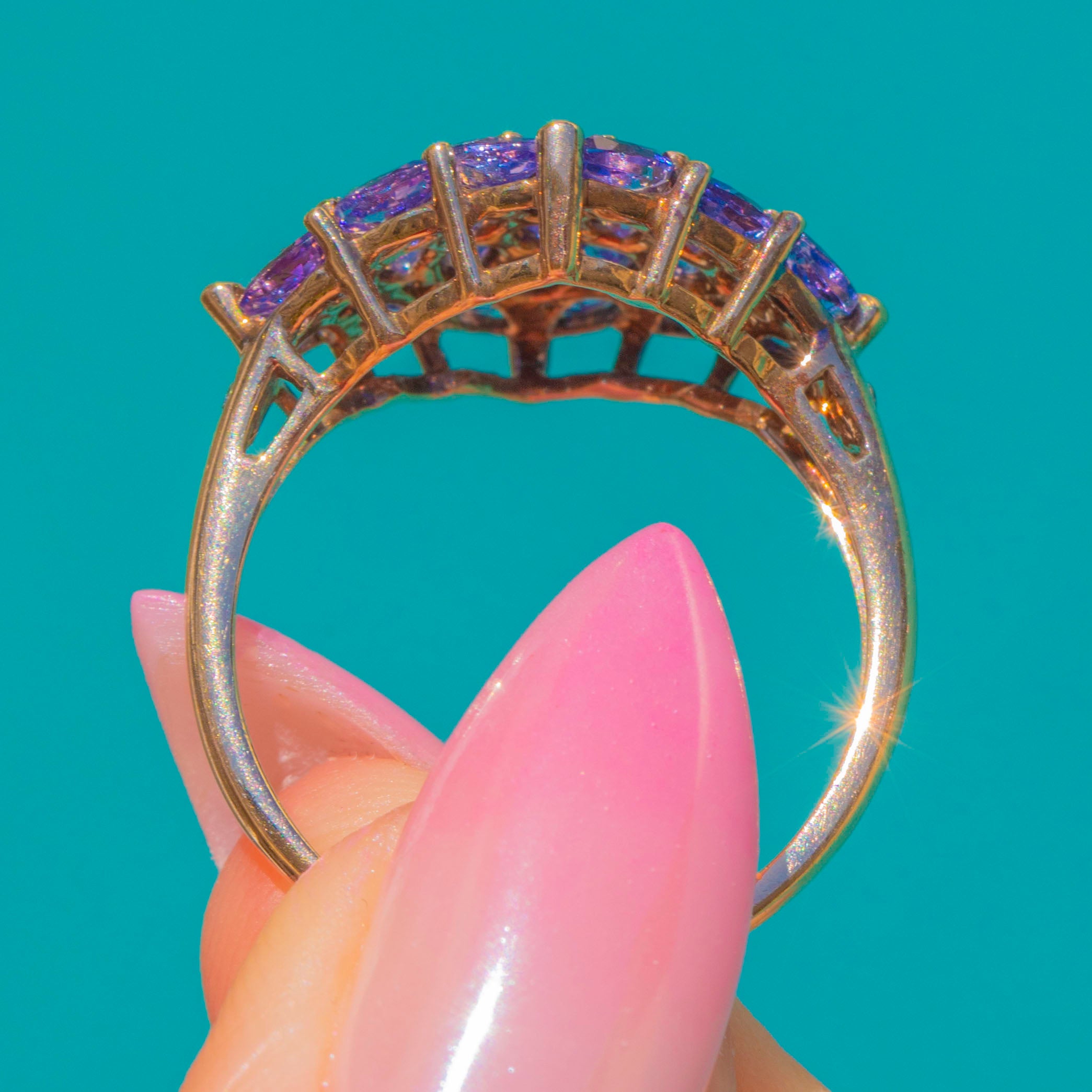 A dazzling dome of Tanzanite takes centre stage in this Vintage 9ct Gold cocktail ring. The floral rosette profile blooms with a pavé of round Tanzanites at the heart, encircled by a gleaming halo of marquise-cut stones that read like delicate petals. Their violet-blue hues dance from lilac to indigo as the light moves, creating a mesmerising wash of colour and sparkle.