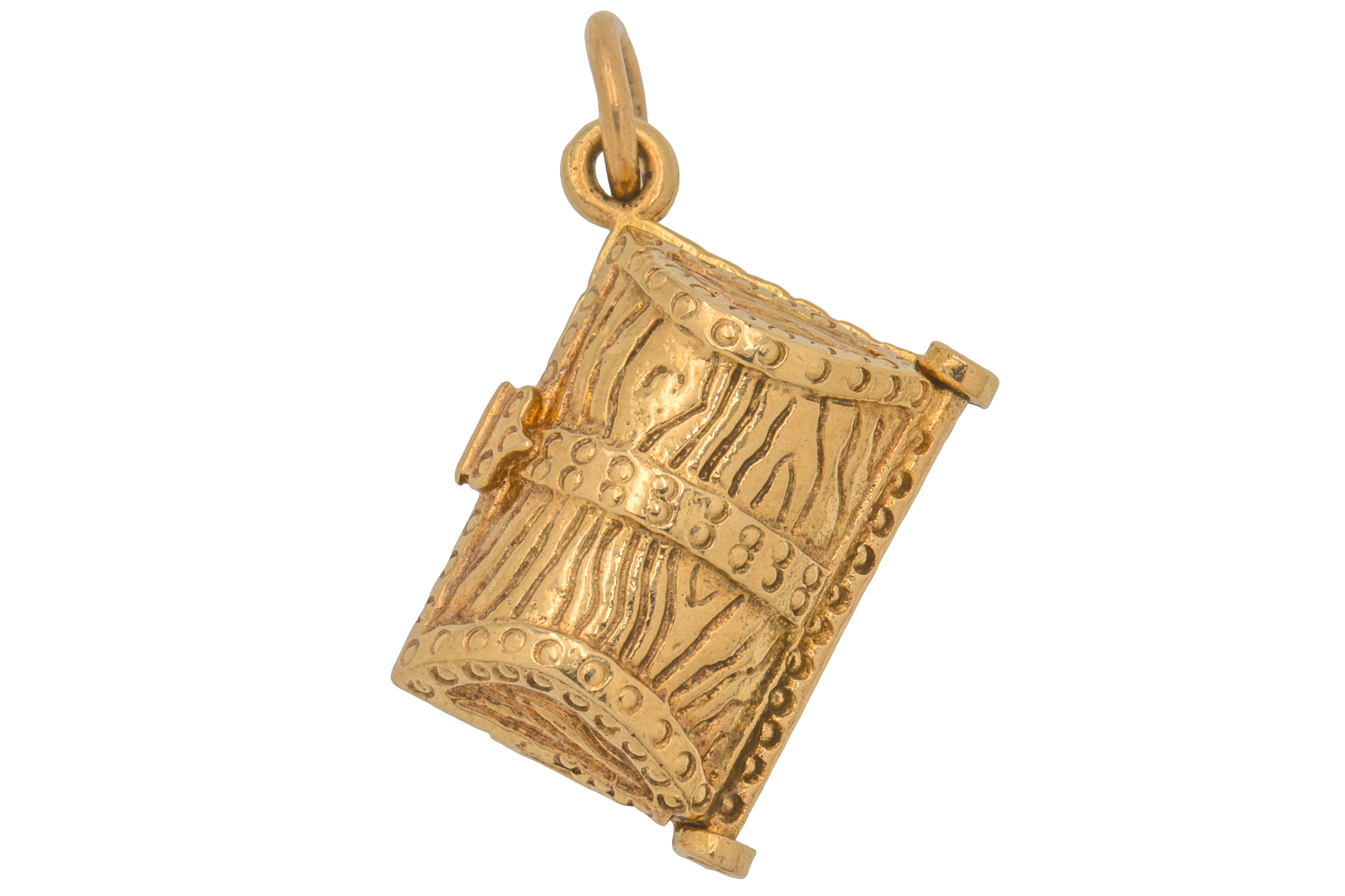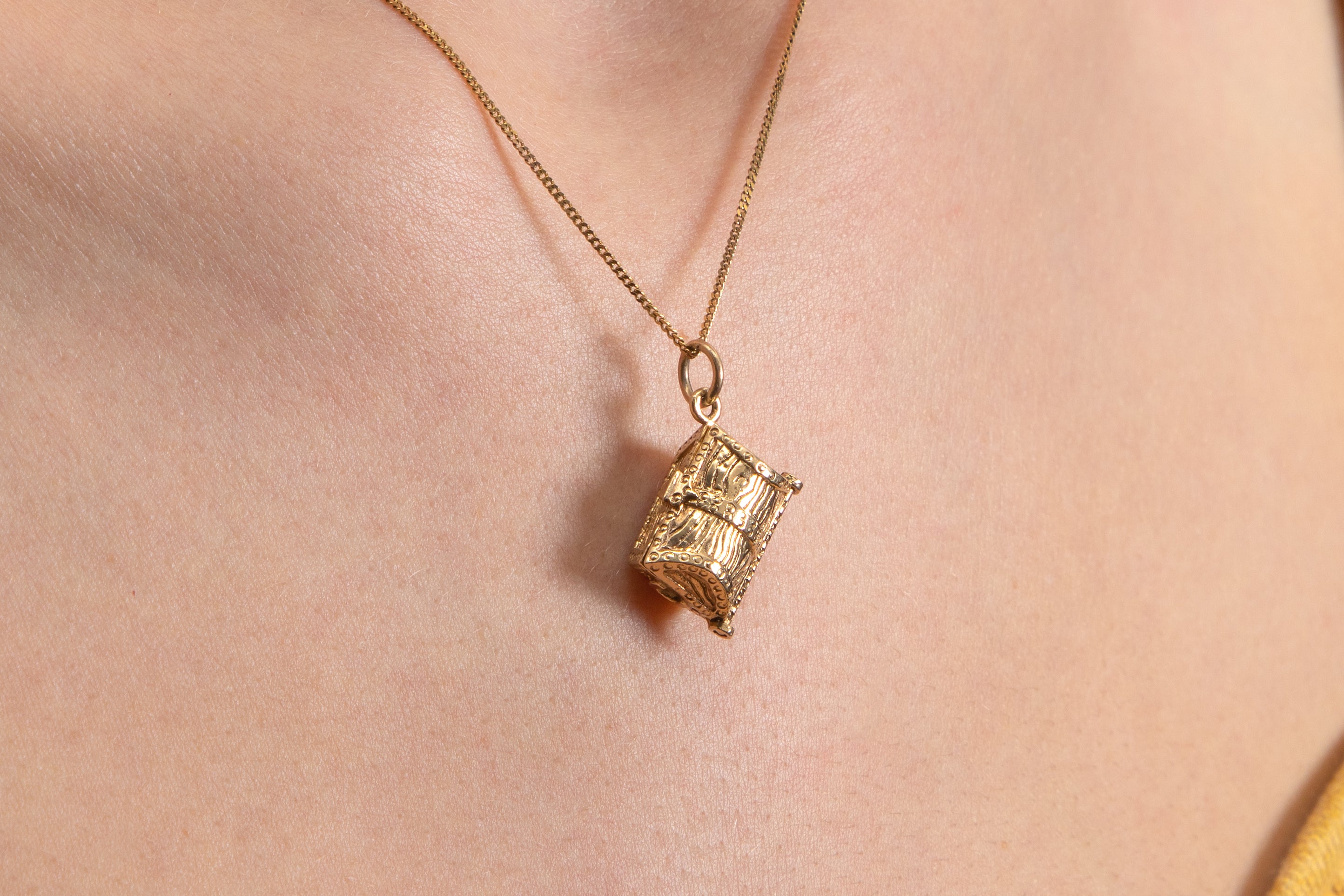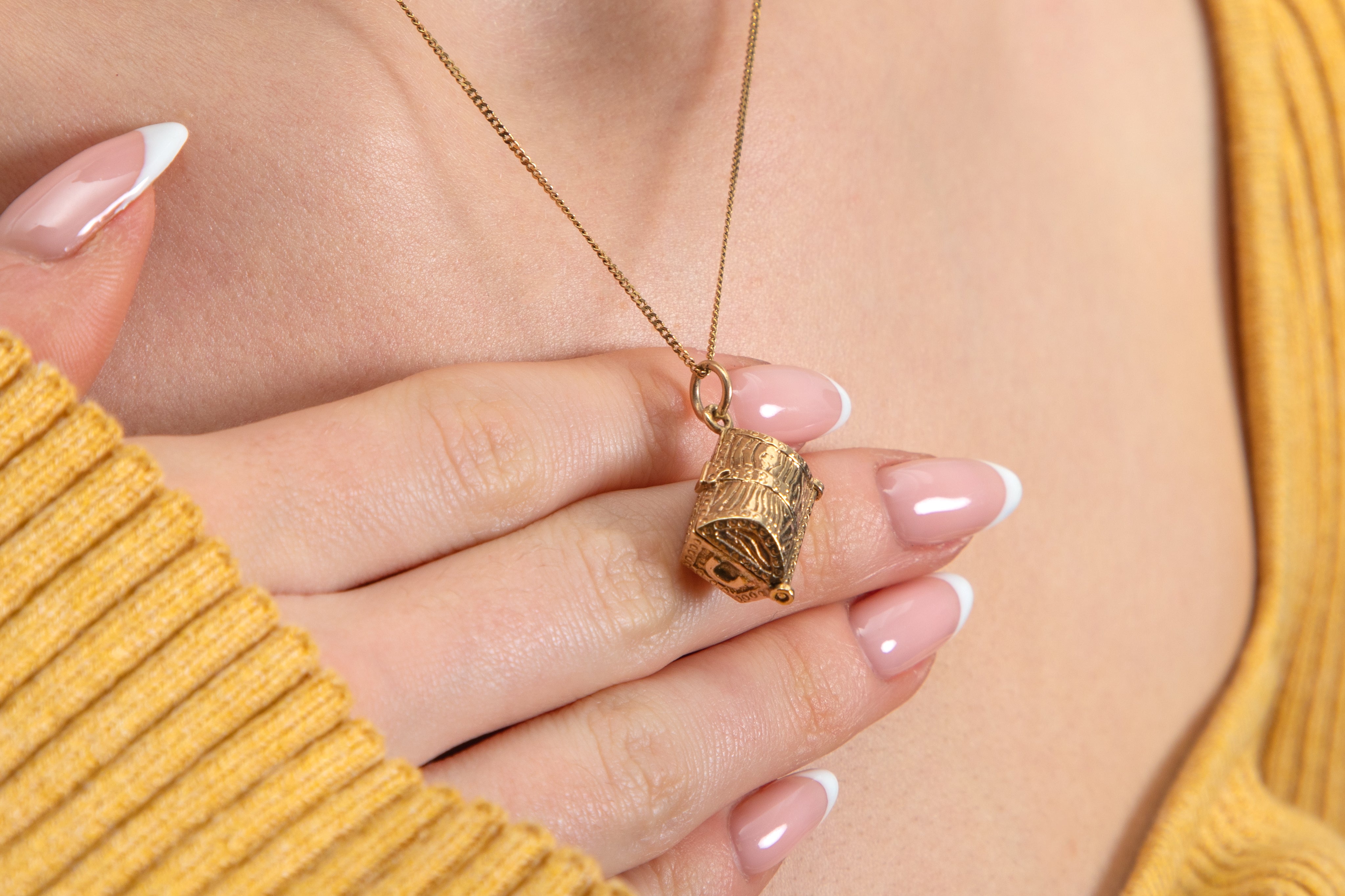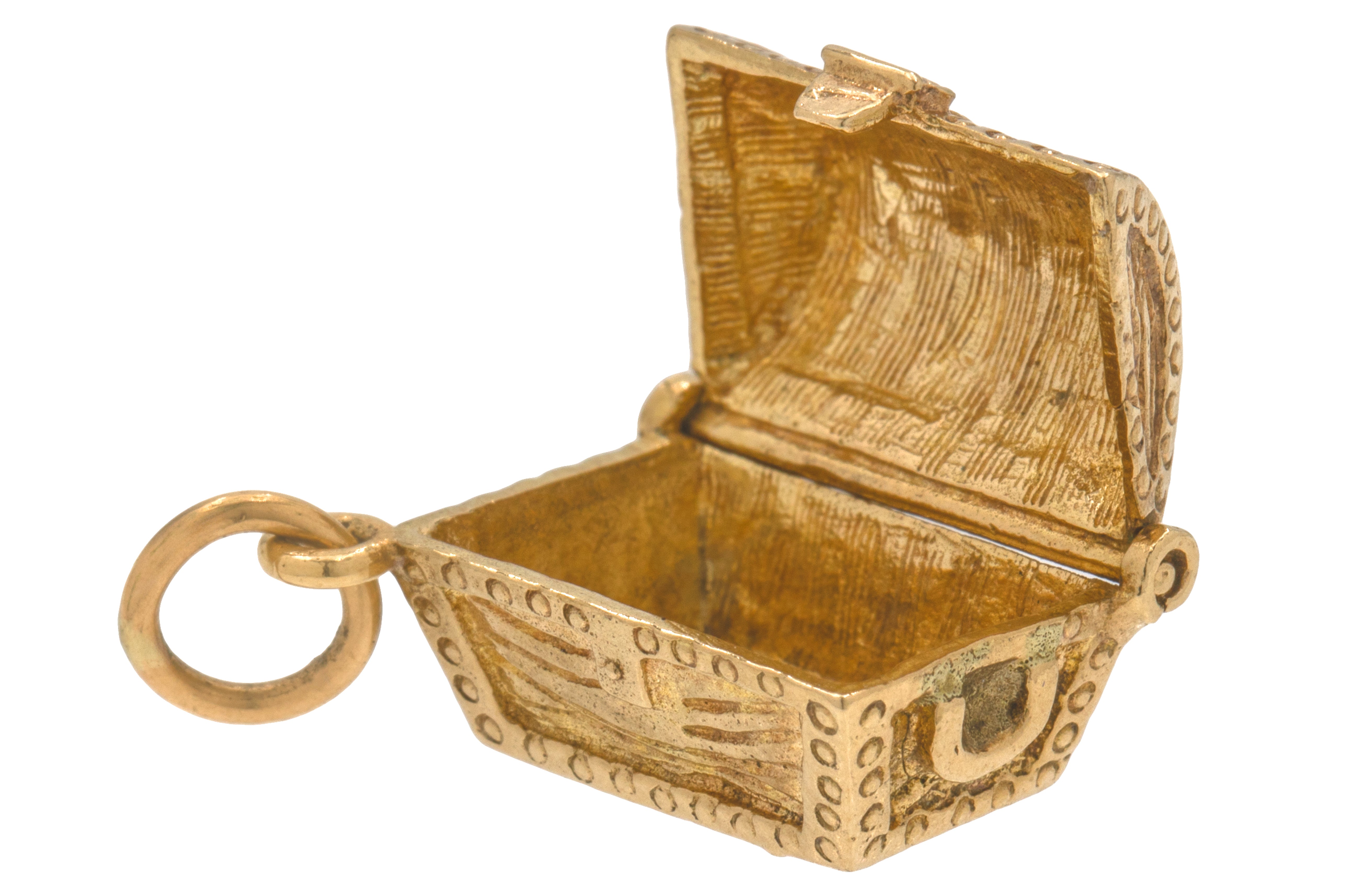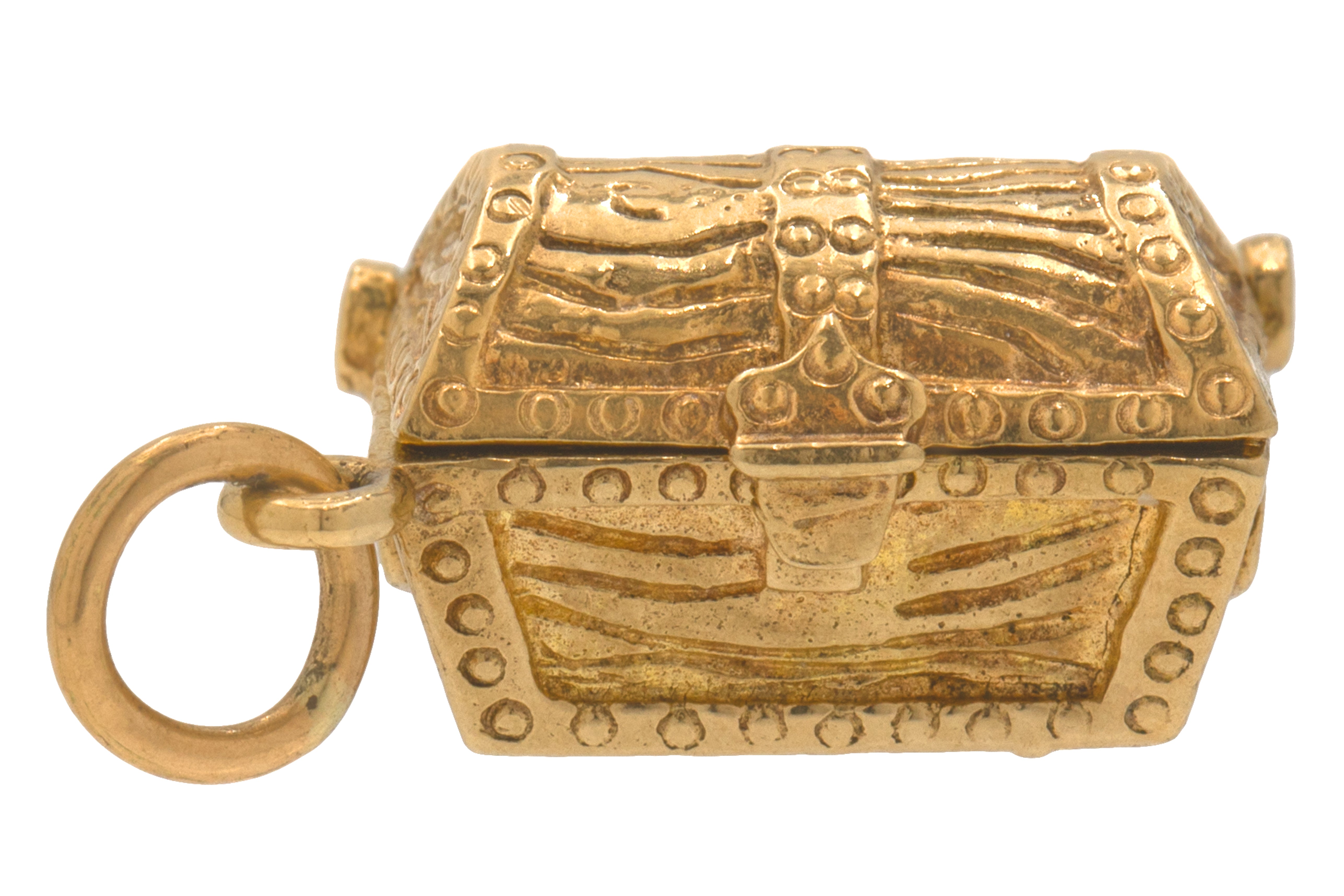 Ahoy there! Here we have a pirate's dream, a 9ct Gold treasure chest charm! A fun, articulated charm, simply open the treasure chest by her clasp to reveal a space for trinkets- a home for your very own treasure!