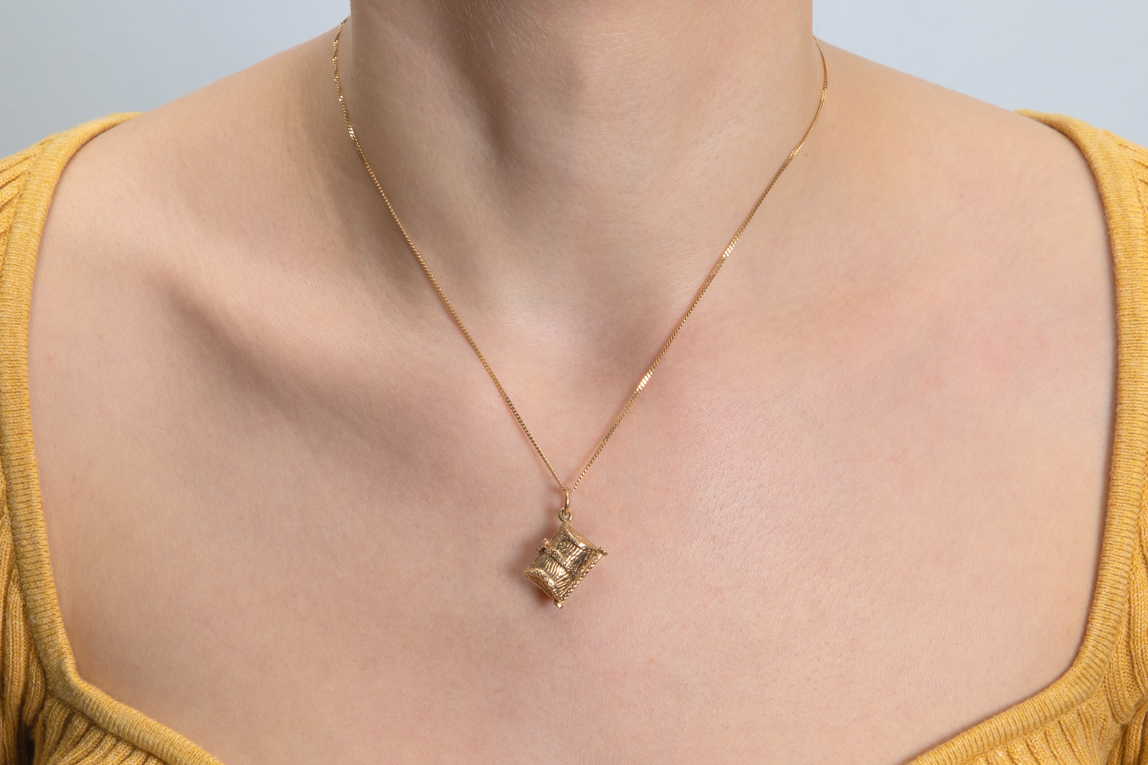 Boasting a radiant wooden texture, this vintage charm is beautifully engraved and intricately crafted from 9ct Gold throughout.