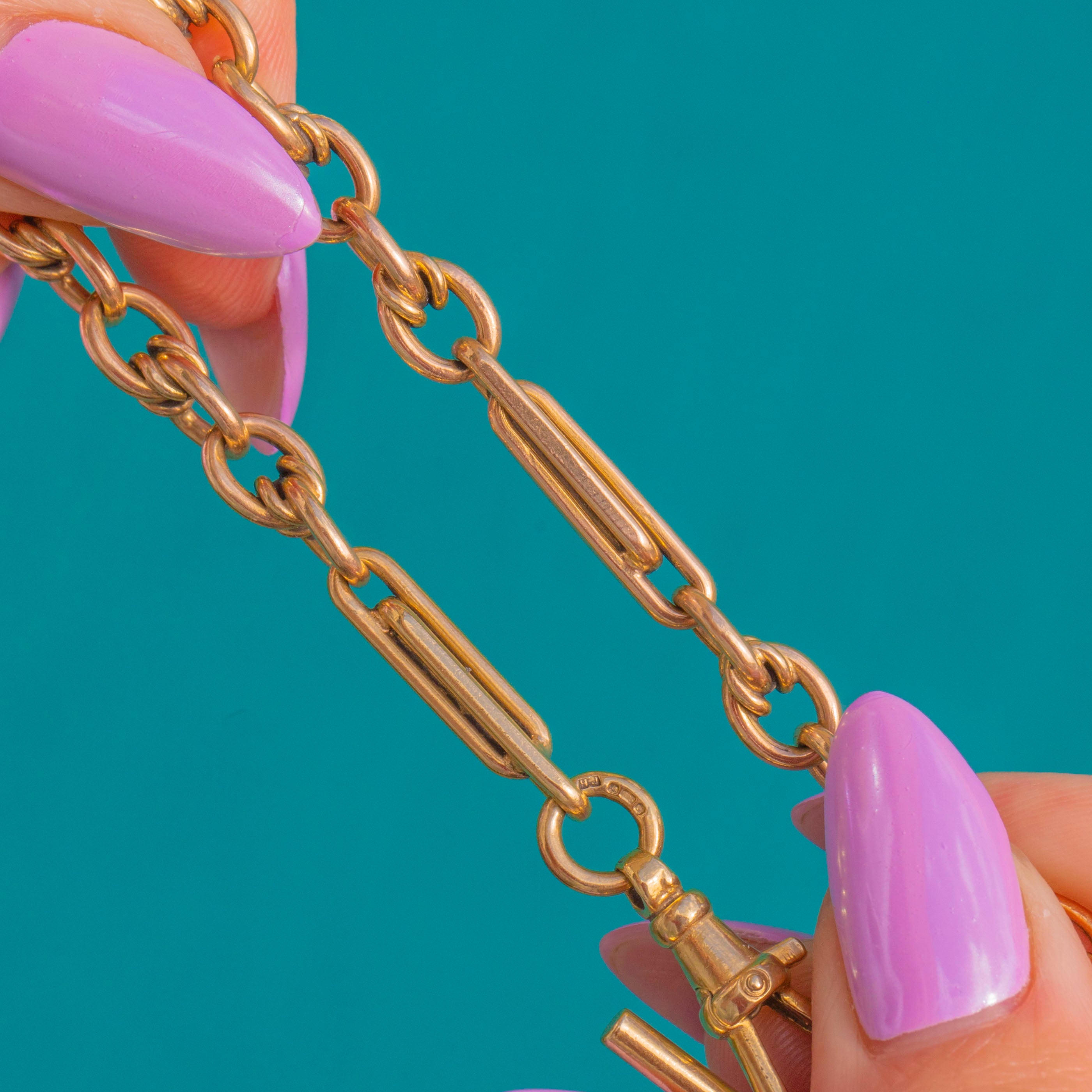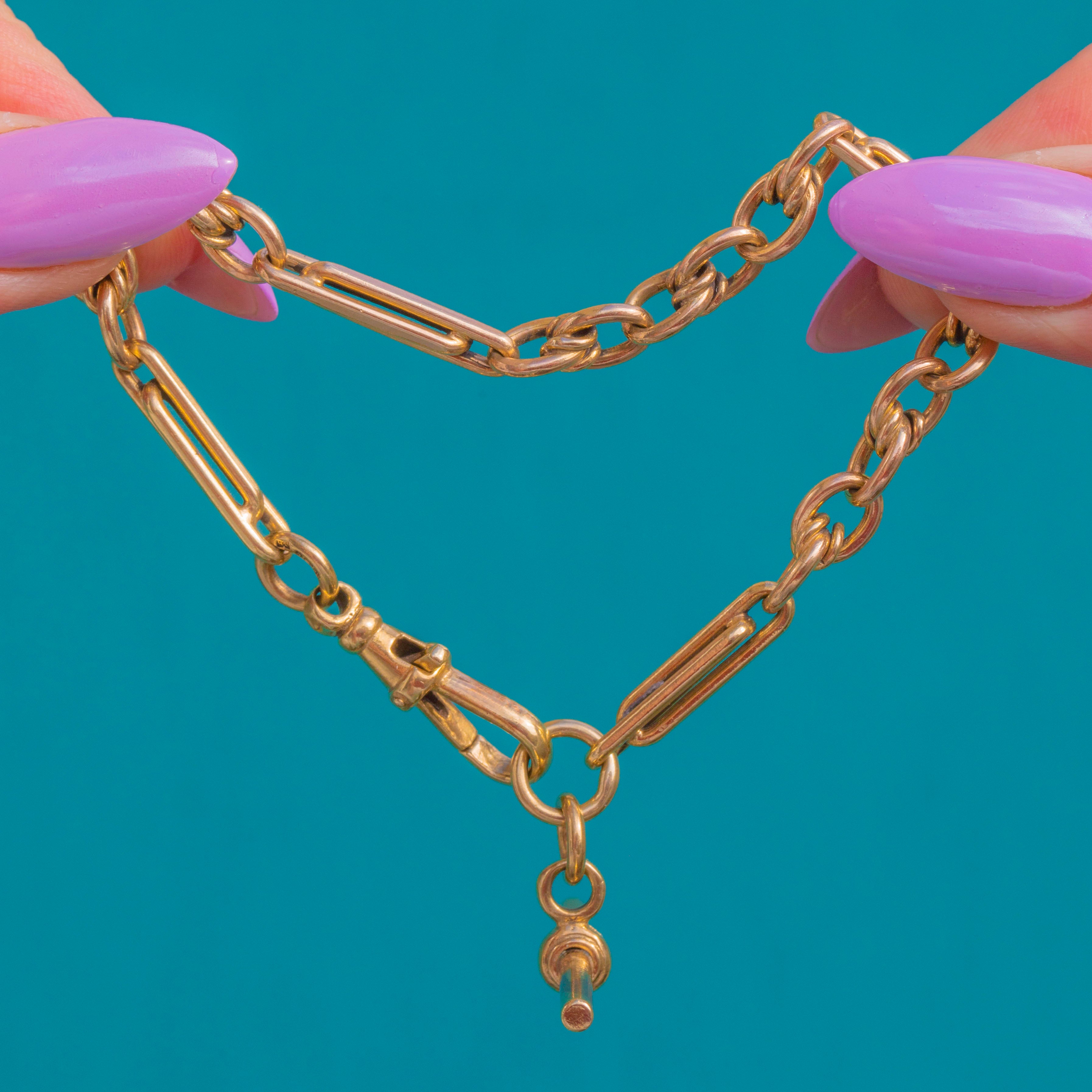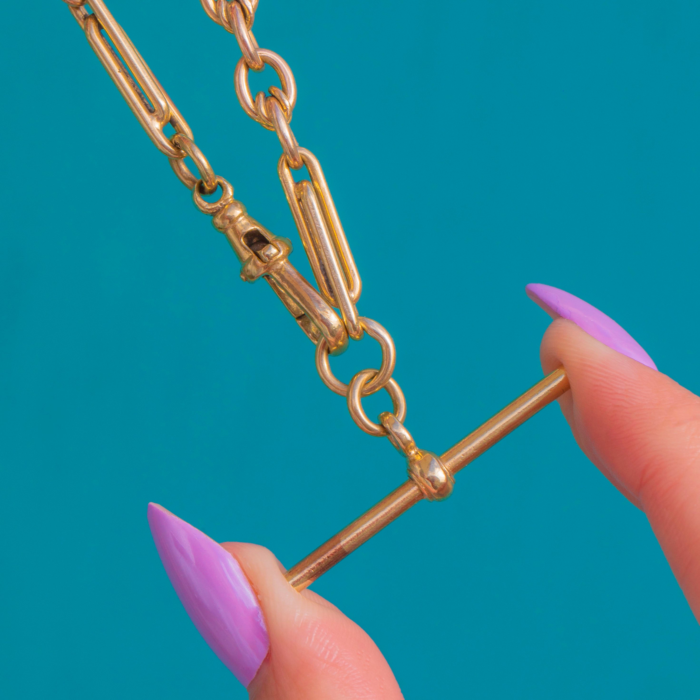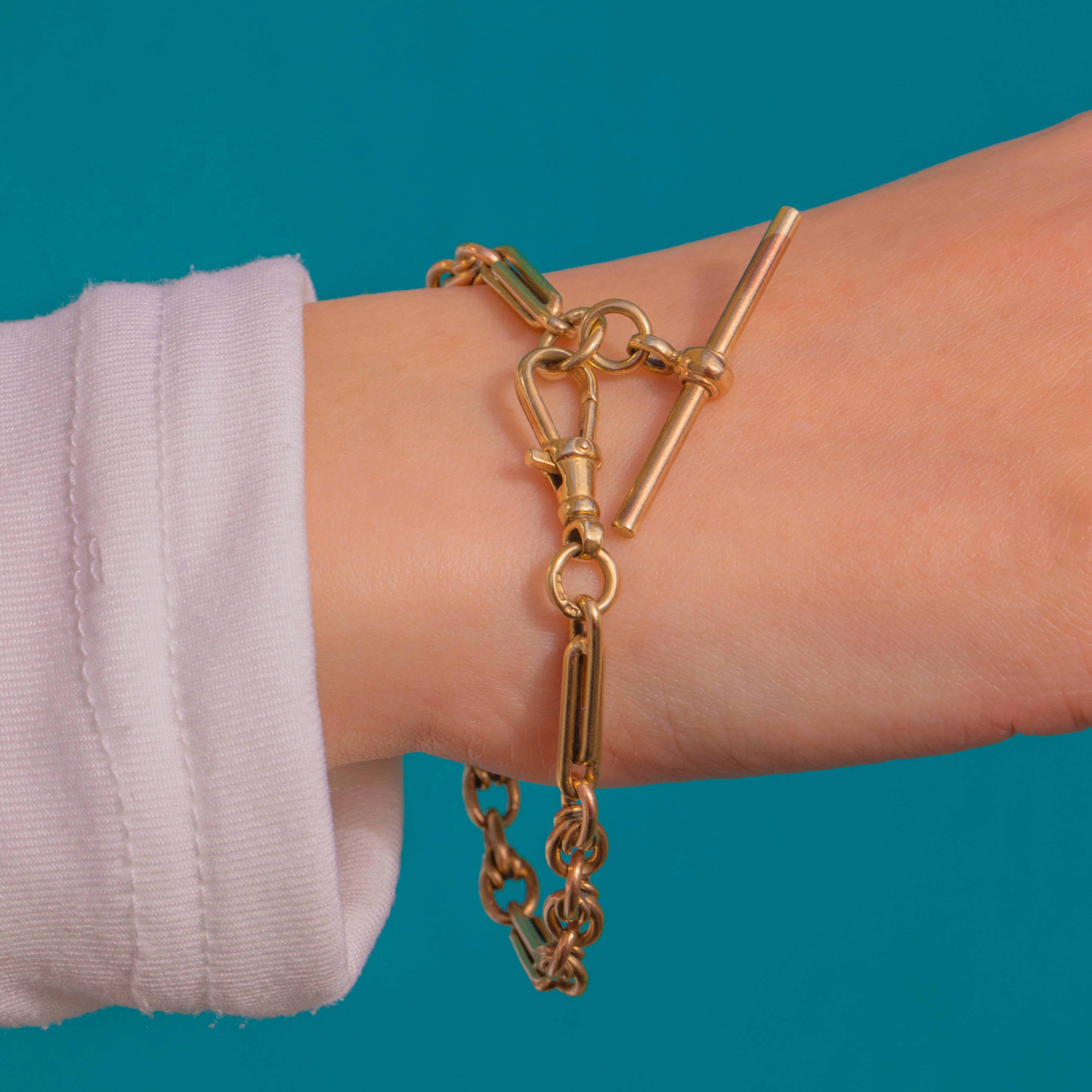 EXCELLENT: The 9ct Gold links are bright with a refined polish and only light surface wear and fine scratches commensurate with gentle use. The T-Bar, dog clip, and links articulate smoothly with secure closure.