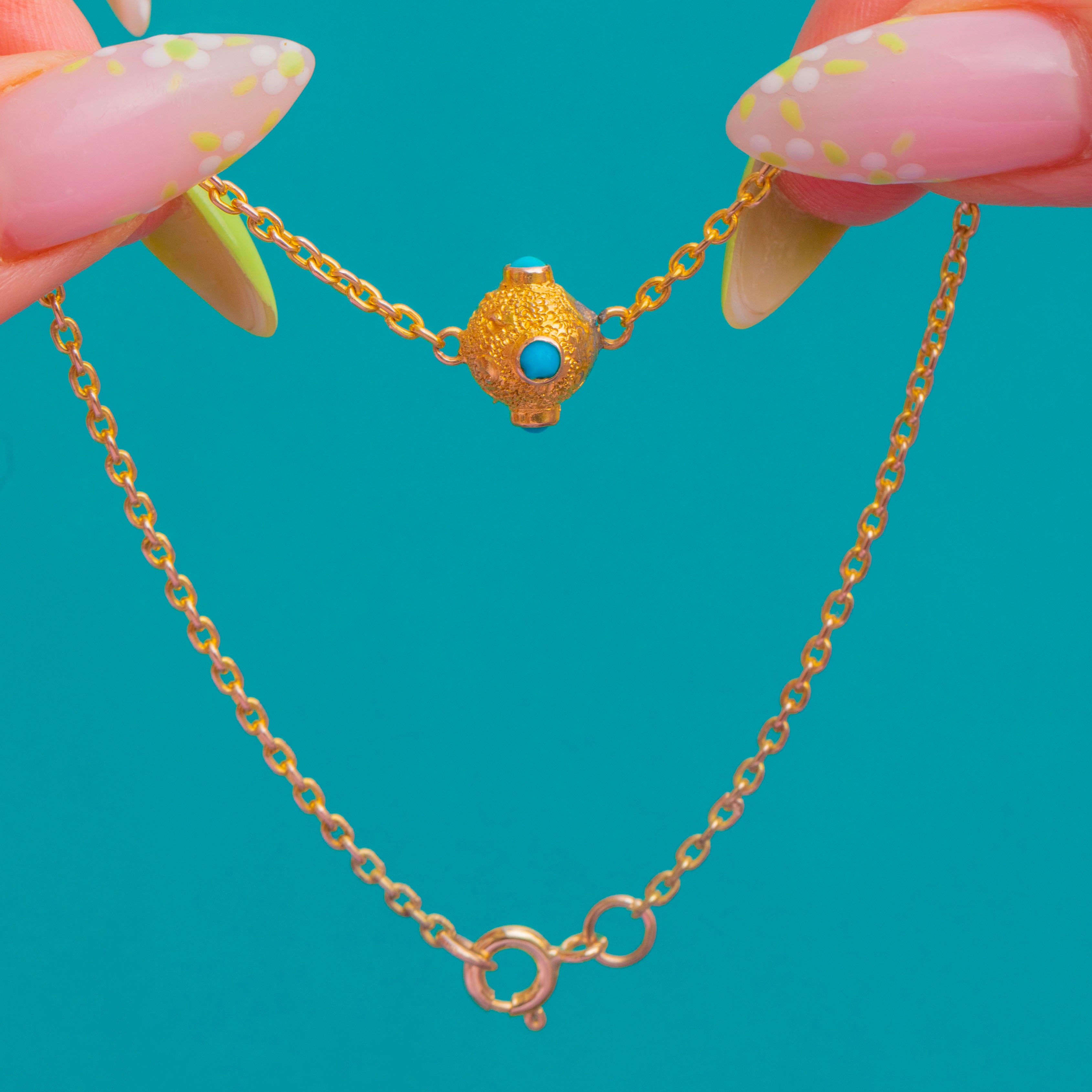 A dainty Victorian treasure in 9ct Gold, this bracelet centres on a tactile orb bead delightfully dotted with vivid Turquoise cabochons. The smooth, fine chain lets the spherical focal point take centre stage, its lively pops of blue bringing a fresh, uplifting accent to the warm glow of Gold.