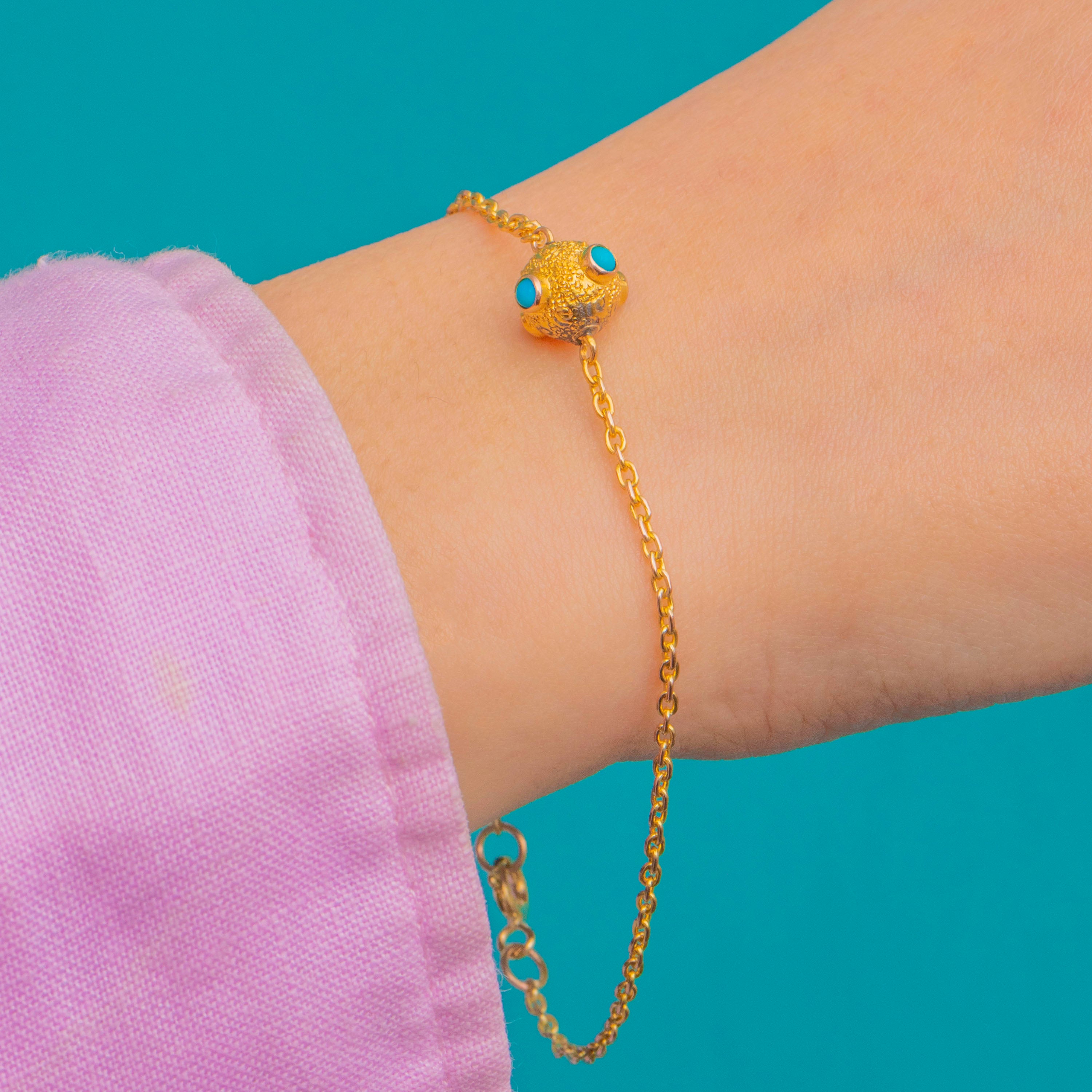 Elegant yet playful, the textured orb and bezel-set Turquoise create a chic, distinctive silhouette that layers beautifully or shines on its own—an easy, refined touch of colour for every day.