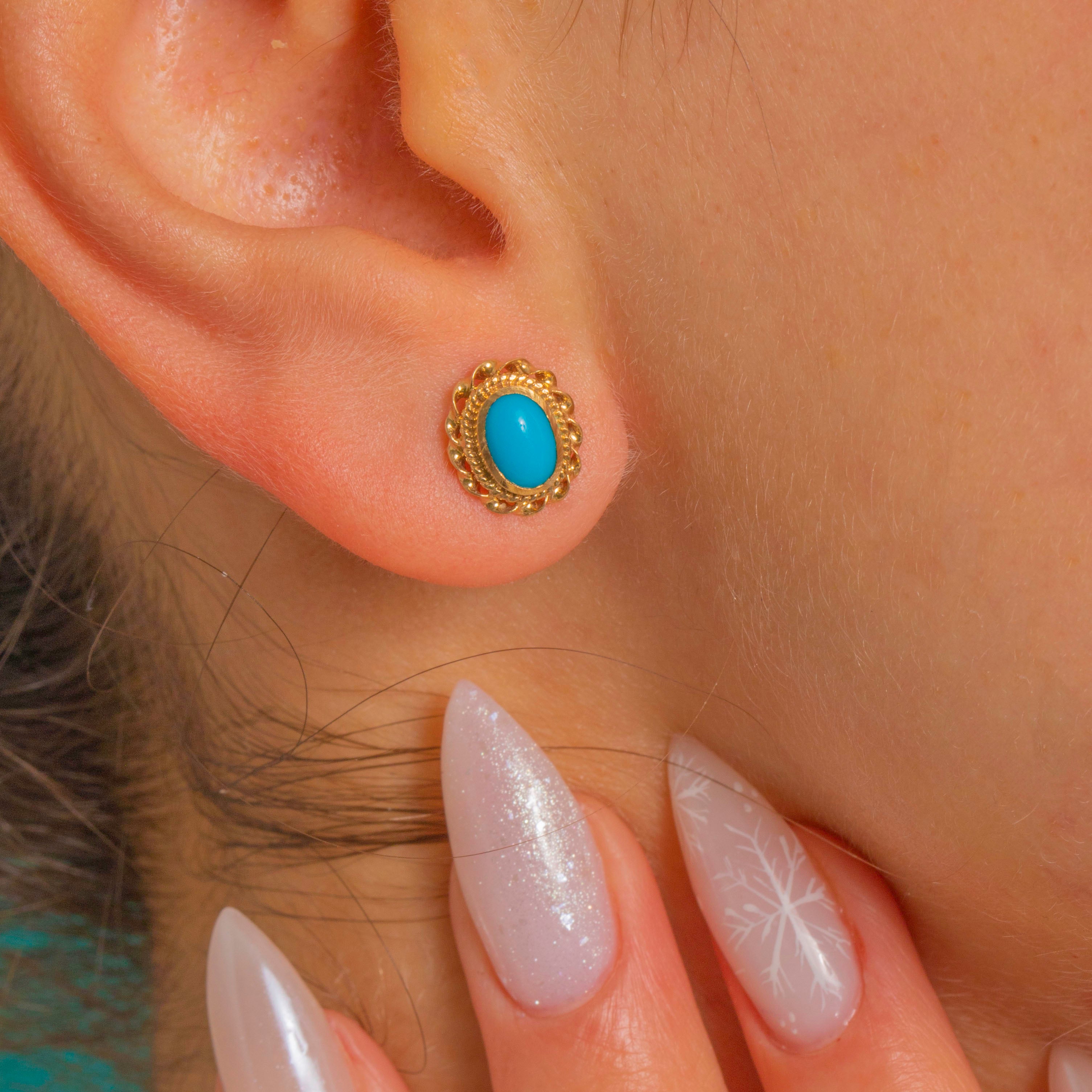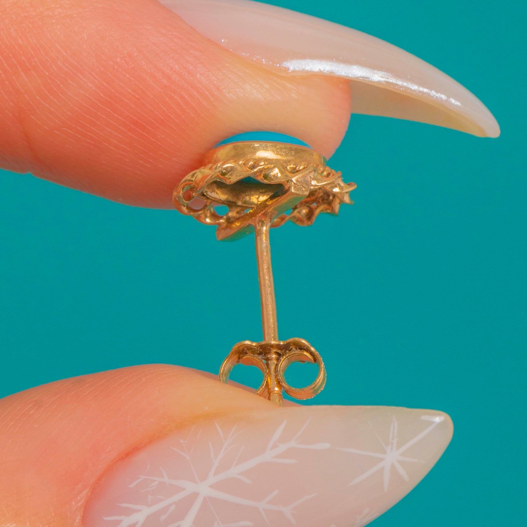 EXCELLENT: Turquoise cabochons are smooth and glossy with no visible chips or cracks. The 9ct Gold settings are bright and crisp with minimal surface wear, retaining sharp milgrain and rope detail. Posts and butterflies are secure; note a subtle bend to one post and a slightly misshapen butterfly, both stable and suitable for wear.