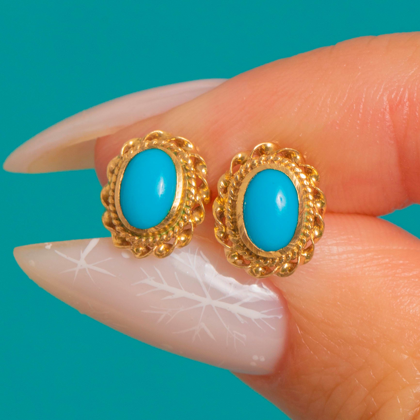 Petite yet impactful, these mid-century Turquoise studs serve up a vivid pop of robin’s-egg blue in classic 9ct Gold. Each oval cabochon is bezel-set and encircled by a fine rope-twist border—an elegant nod to Victorian and Etruscan Revival design in a neat, modern stud profile.