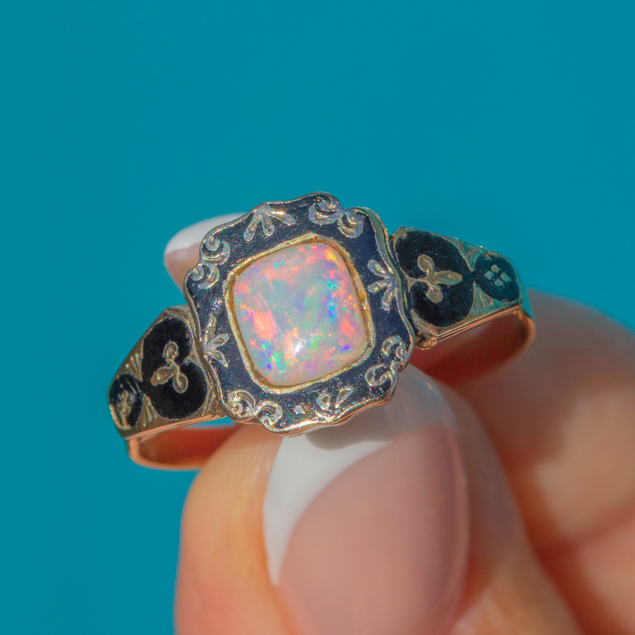 EXCELLENT. The Black Enamel is crisp with only the lightest wear. The Opal (a later replacement for the original panel) is securely set and displays attractive play-of-colour, free from chips or cracks. The Gold shank is strong with a smooth taper, making this historic ring comfortable and ready to wear.