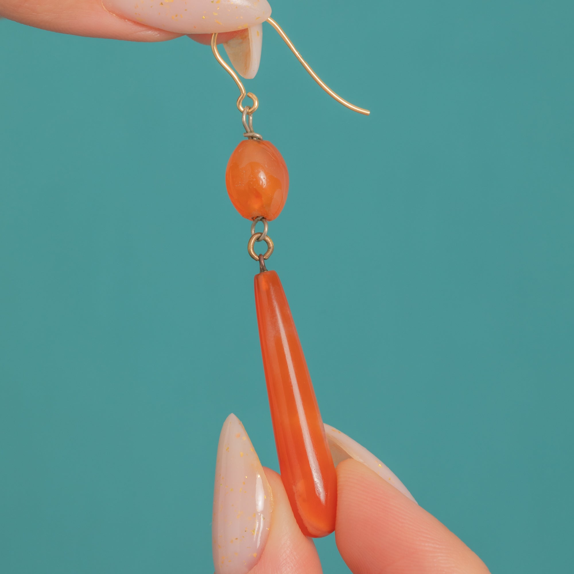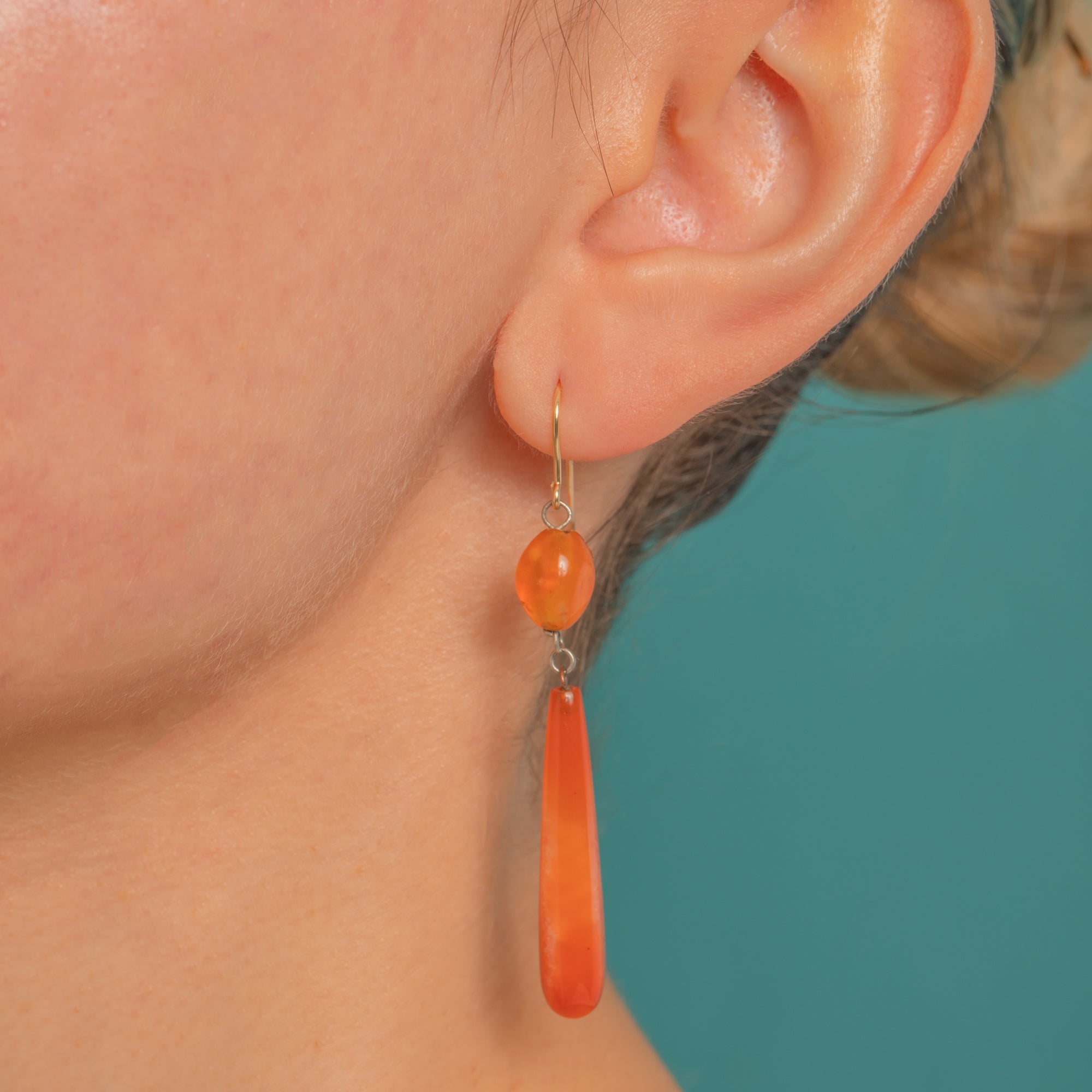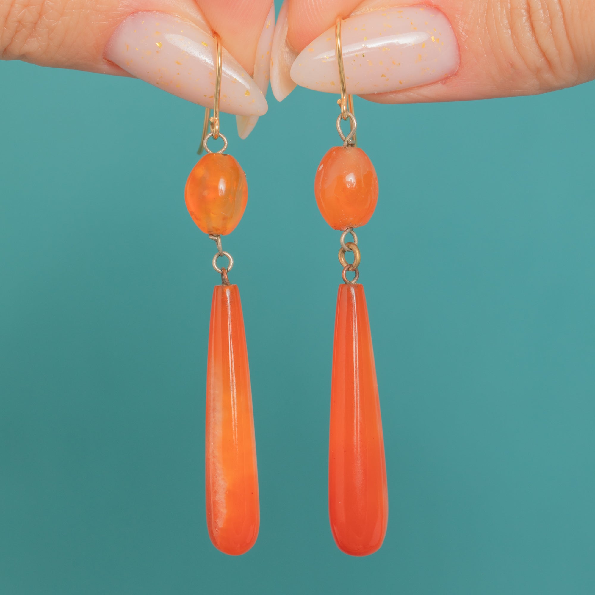 Glowing with rich, sunset-orange Carnelian, these Victorian drop earrings are the essence of refined simplicity. Each earring features a polished rounded bead poised above a long, tapered torpedo drop, suspended from 9ct Gold French hooks for an elegant, elongated line and graceful movement.