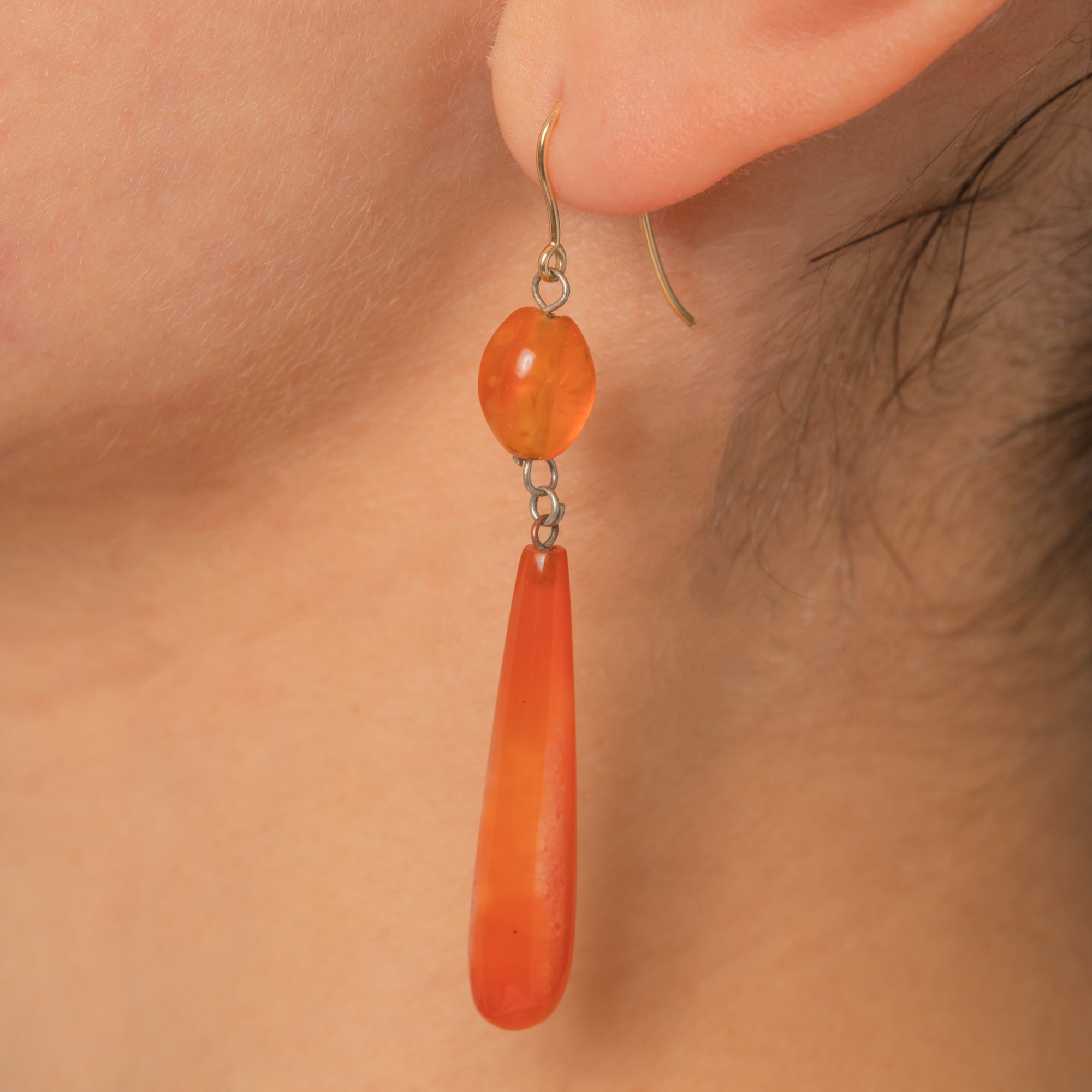 EXCELLENT: The Carnelians are smooth and lustrous with only the lightest natural surface features; no chips or cracks observed. The 9ct Gold French hooks are secure, and the Silver links between the drops are sound with a gentle patina. Wear is minimal and consistent with age, with no visible repairs.