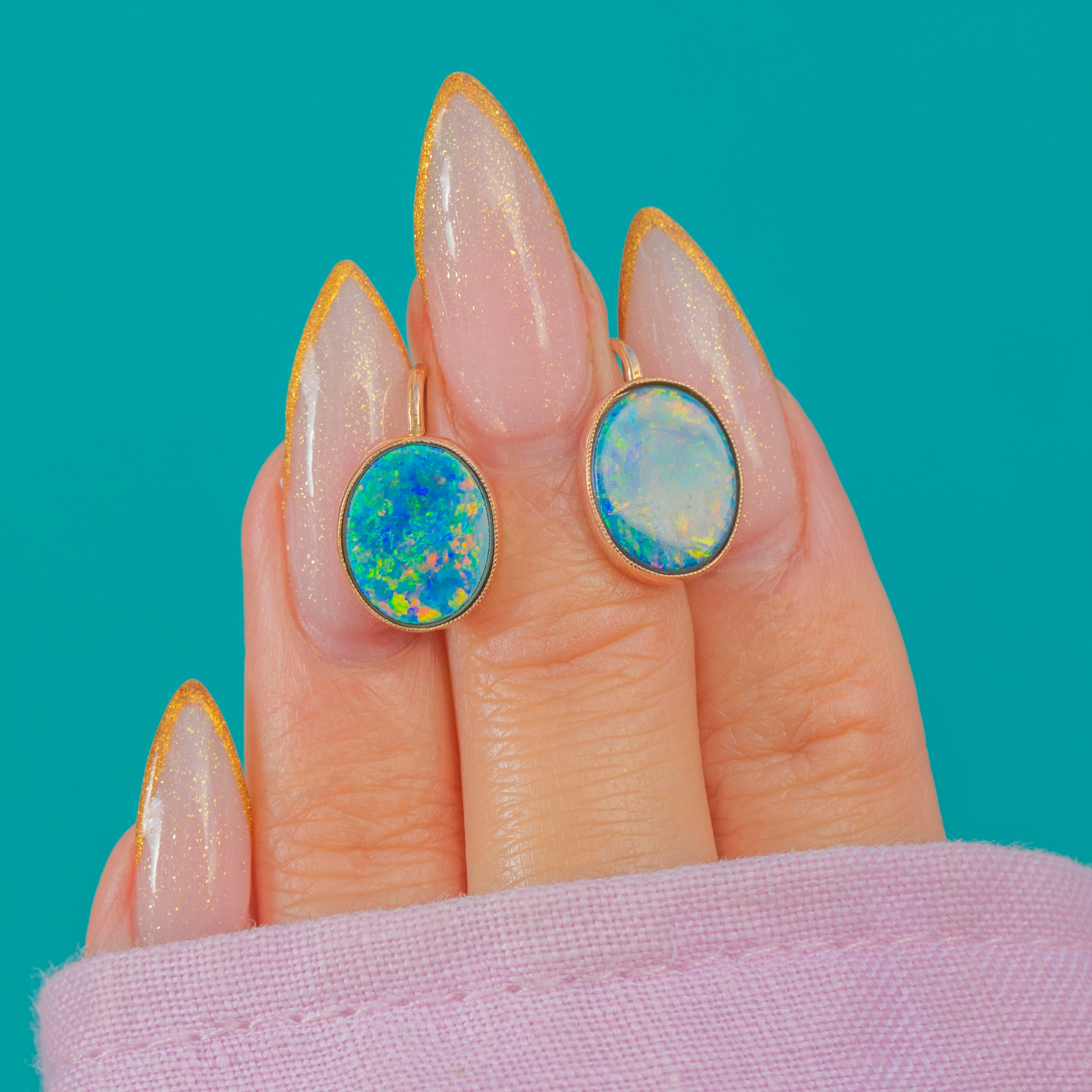 EXCELLENT: The Opal Doublets are bright and well-preserved with no chips or abrasions. The Gold bezels and backs show only minimal light wear and are in lovely antique condition.